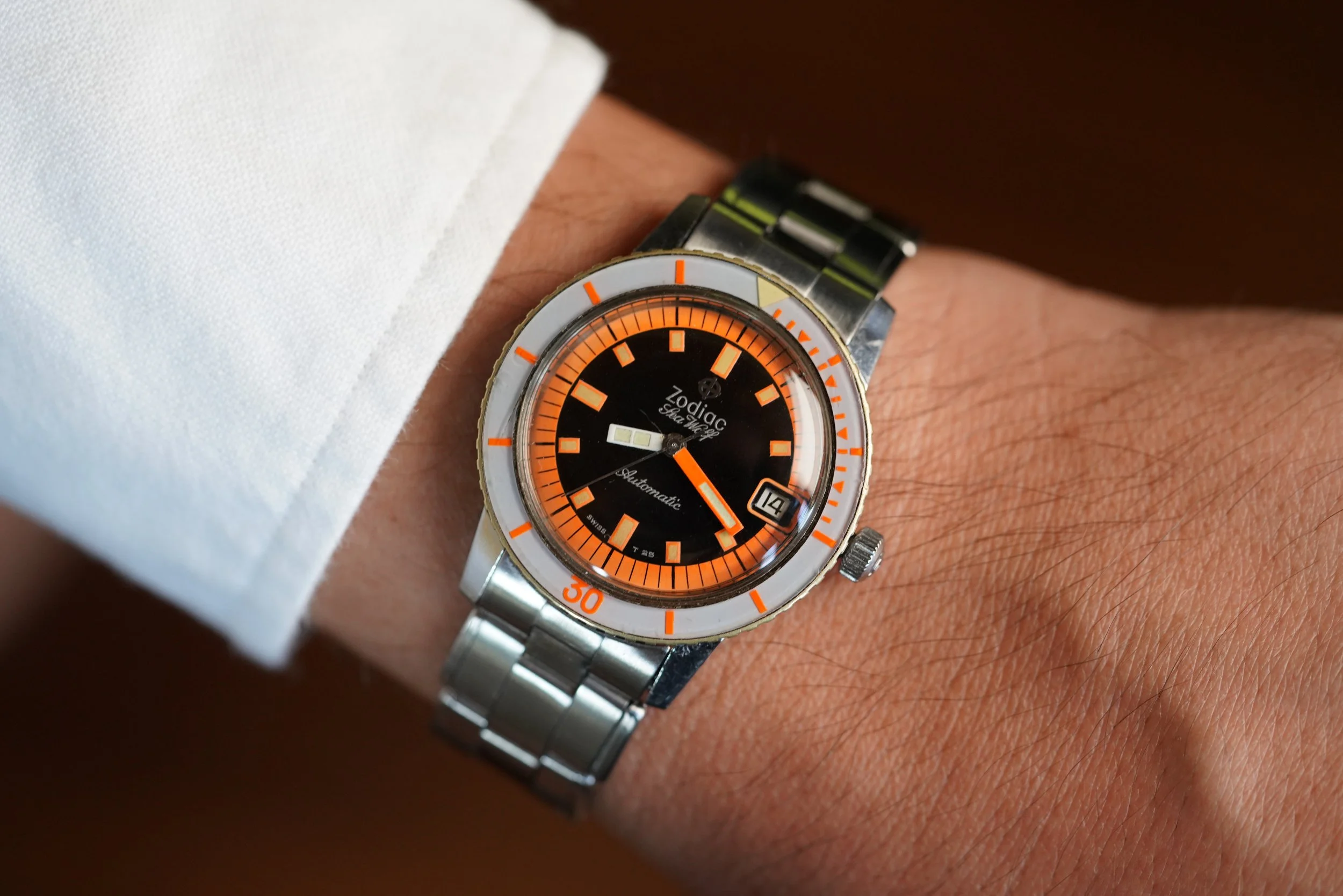 This Zodiac Sea Wolf is an awesome vintage watch with a “orange exotic” gilt dial. The watch features an automatic calibre 72B. The case measures 35mm in diameter (43mm lug-to-lug). It is paired on a Zodiac bracelet likely made by C&I which is very firm. The watch has been in my personal collection for several years, and I love this example.