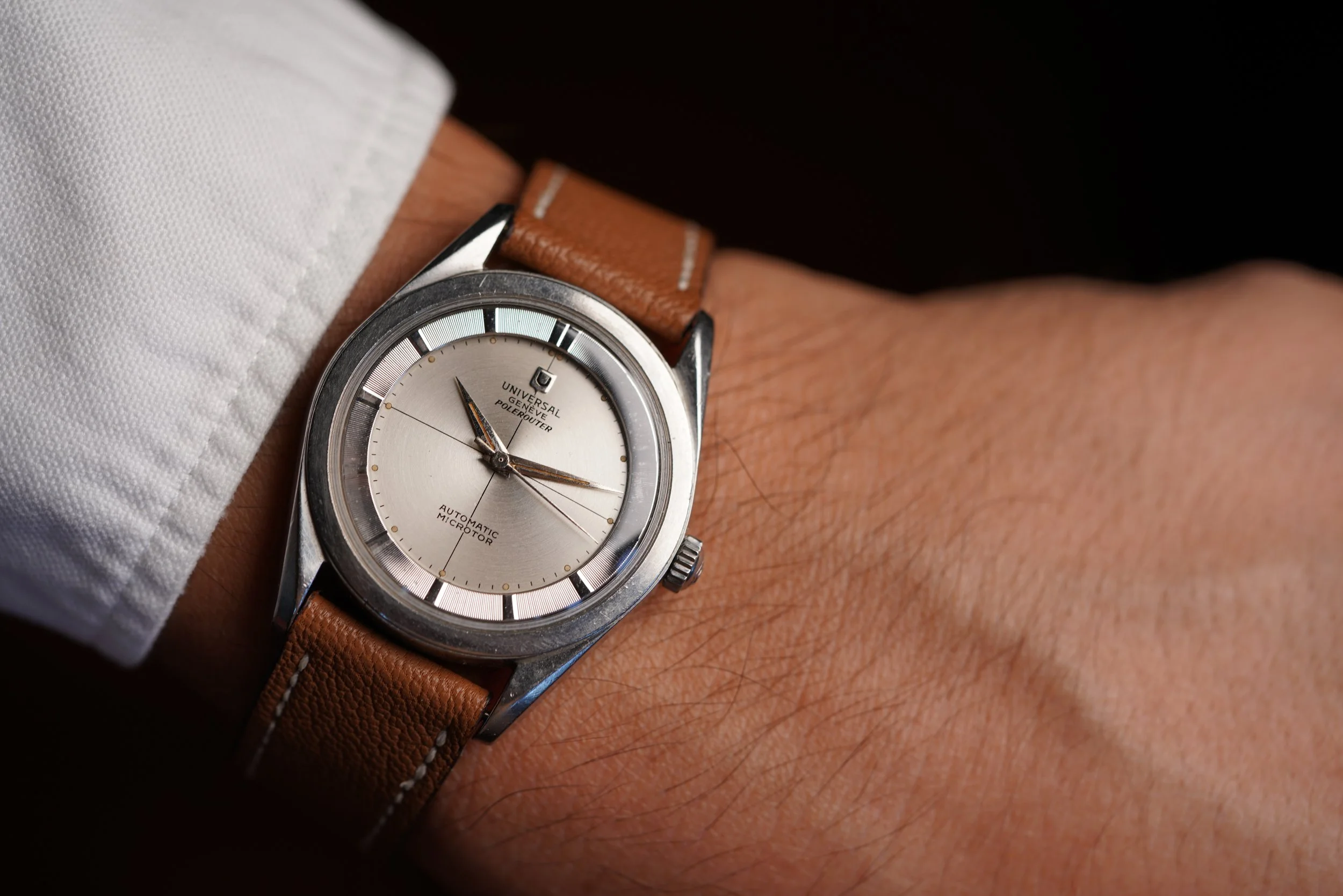 This is a super interesting Universal Genève Polerouter reference 20360-2. It measures 35mm in diameter (44mm lug to lug). The case has been lightly polished. It features silver dial.