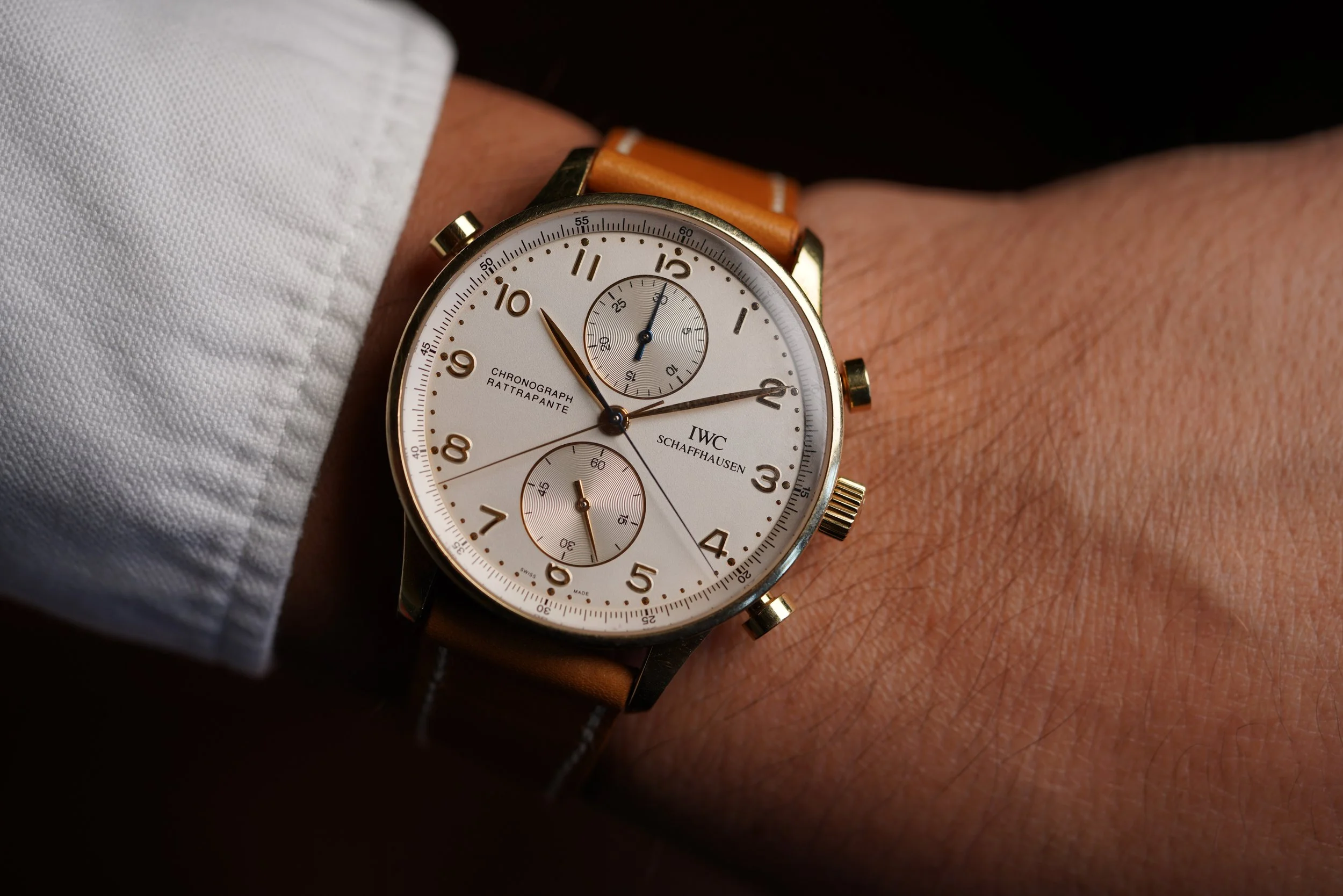 This IWC Rattrapante Chronograph IW3712 is very cool! It measures 41mm. It features the coolest split seconds chronograph! The case is 18k rose gold, but looks yellow to us! Supposedly it was only in rose!