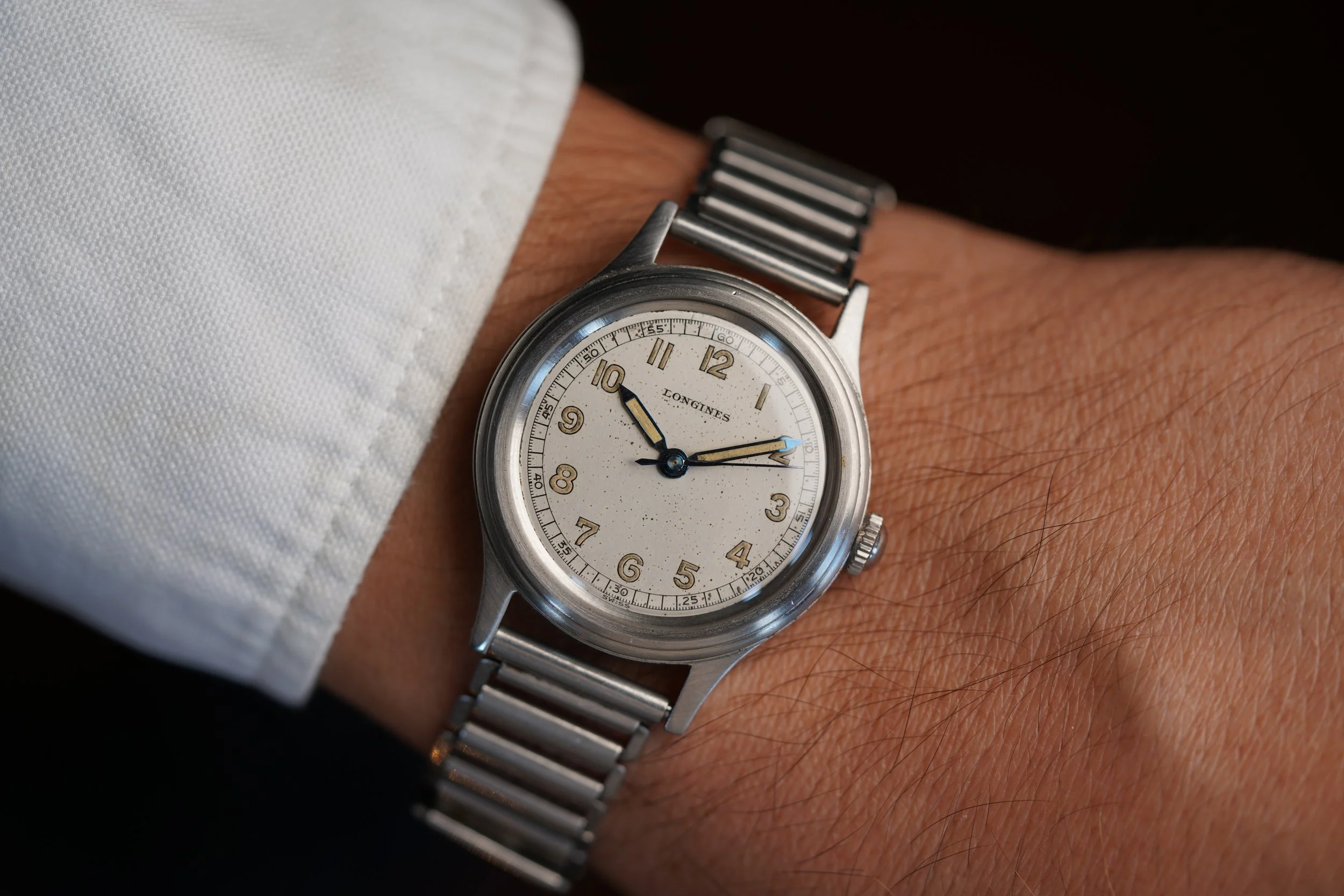 The Longines Sei Tacche is a fantastic stainless steel watch, measuring 33mm. The lug-to-lug measures approximately 41mm. The watches feature a beautiful silver dial with Arabic numerals filled with radium. The watch is paired with a Gay Frères Bonklip bracelet that was especially popular during WWII. This example features the USN Bu Ships (United States Navy's Bureau of Ships). engraving on the case back.