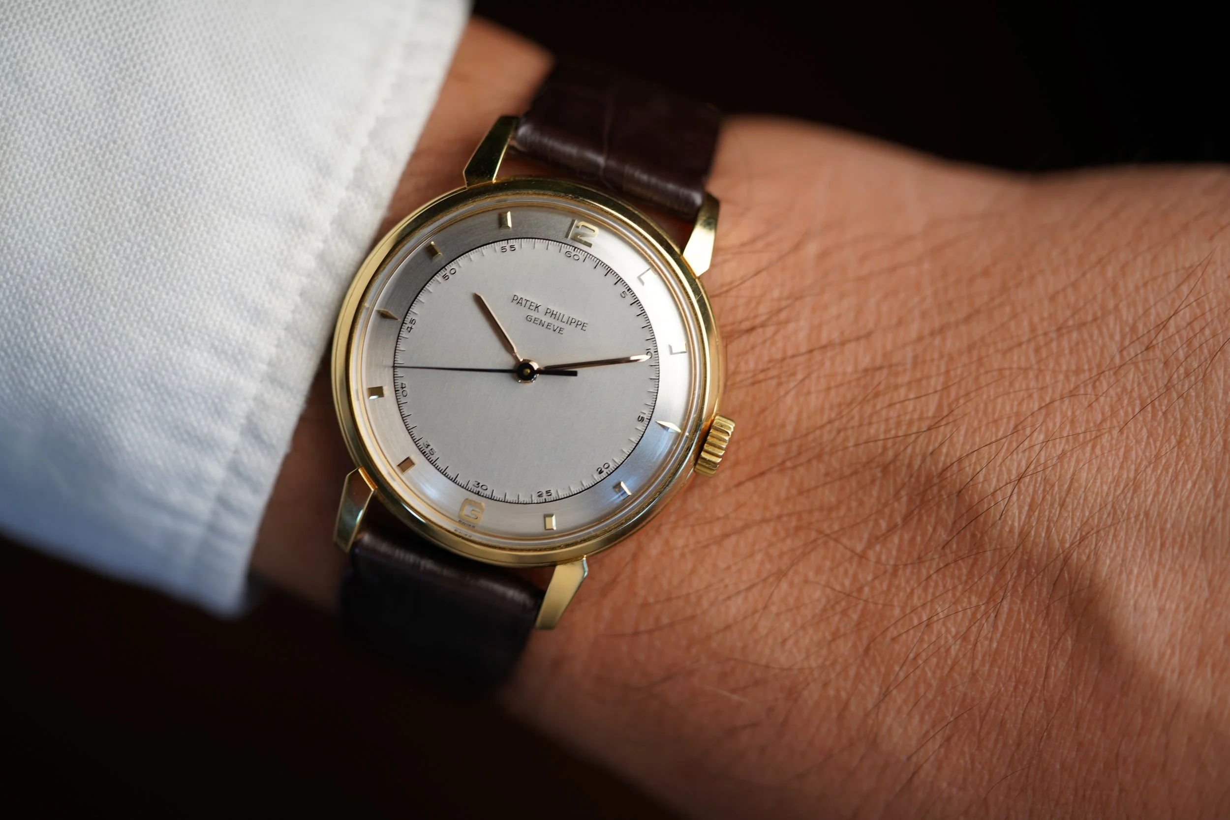 This Patek Philippe reference 2482 is an amazing timepiece in 18K yellow gold. The case has been lightly polished and has a great size at 36mm in diameter and 44mm lug-to-lug. The lug design on this model are very attractive from both straight forward and the profile. The dial is made by Fabrique de Cadran Stern Frères and is a beautiful two-tone silver dial. This example has my personal favorite dial configuration with similar numerals found in the Rolex "Padellone", Rolex Oyster reference 6426, Rolex Oyster reference 6082, Rolex Precision reference 4583, certain Movado M95 chronographs and St. Christopher coin watches.