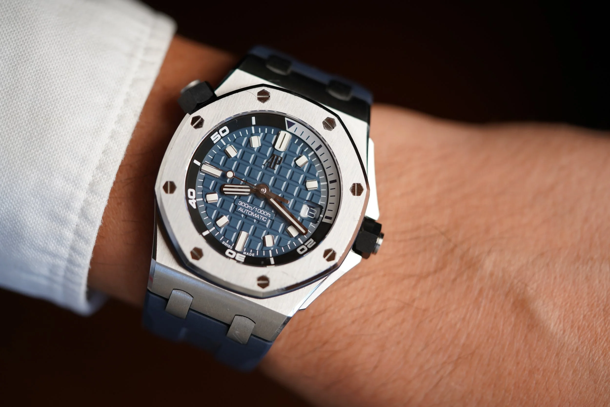 This Audemars Piguet Royal Oak Offshore Diver is a tough and robust dive watch. The case measures approximately 42mm in diameter, 14mm thick, and is stainless steel. The case appears to be unpolished. The watch features a rotating inner bezel. The watch comes on a classic Offshore Diver rubber strap. The dial features the distinct blue “Méga Tapisserie” pattern. For those looking for a great sports watch, look no further.