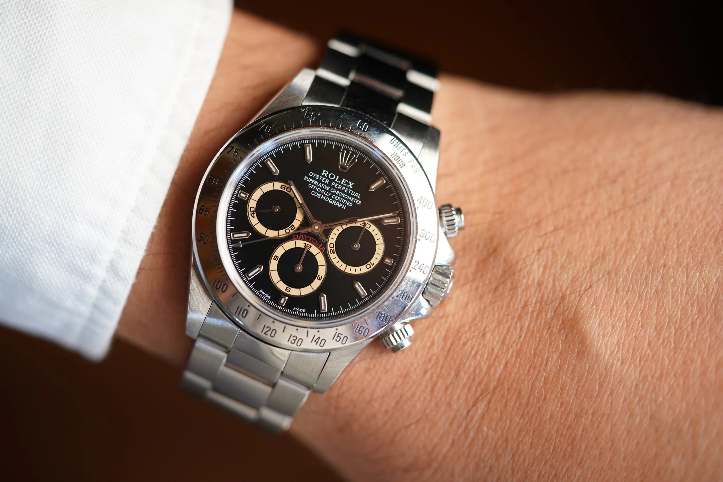 The adorned “Zenith Daytonas” are certainly among the highly desired neo-vintage Rolex models. Zenthi Daytonas were produced from circa 1988 until 2000. It is powered by an automatic Calibre 4030 made by Zenith. The case has been polished. It measures 40mm in diameter (42.5 including crown) and 47mm lug to lug. The outer ring of the registers have developed a very attractive tropical color similar to the “Patrizzi” dials but this is slightly later that these models. It features a U8 serial and dates to circa 1997-1009.