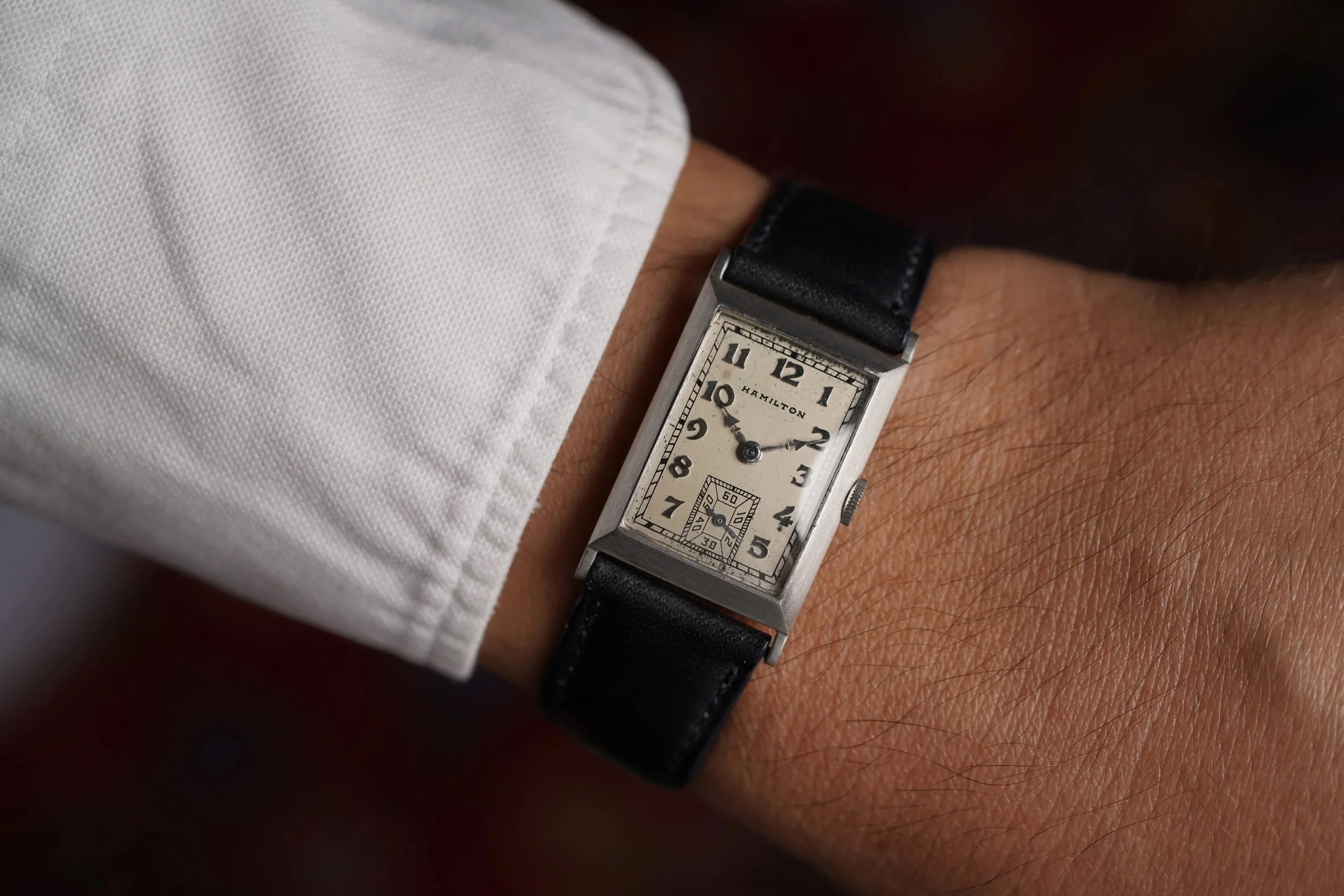 This Vintage Hamilton Tank wristwatch is a very rare and cool timepiece. It is made of platinum and we believe the case is unpolished. It measures 21mm in diameter by 36mm lug to lug. It has the very cool fancy numerals, sort of an Americanized version of Breguet numerals