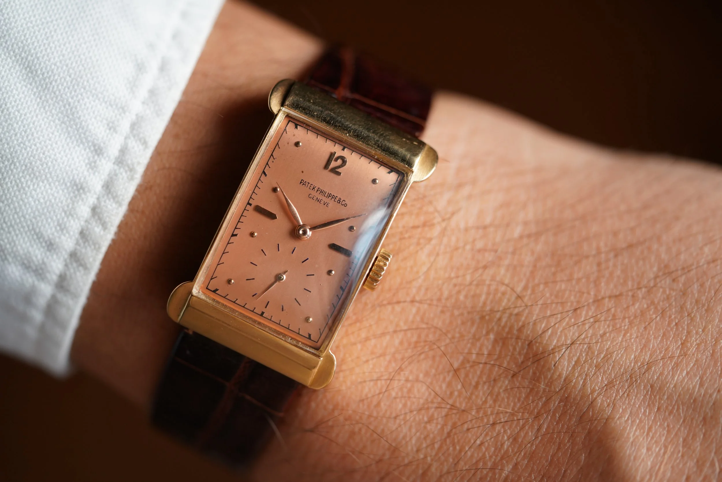 This is a special Patek Philippe reference 2403 semi-circular hooded lug design in 18k rose gold? The rectangular case measures approximately 37x21mm. The watch features a highly attractive salmon dial with applied hour markers and Arabic numerals at 12 o’clock. There is a small second hand just above 6 o’clock. The case has been polished in the past.
