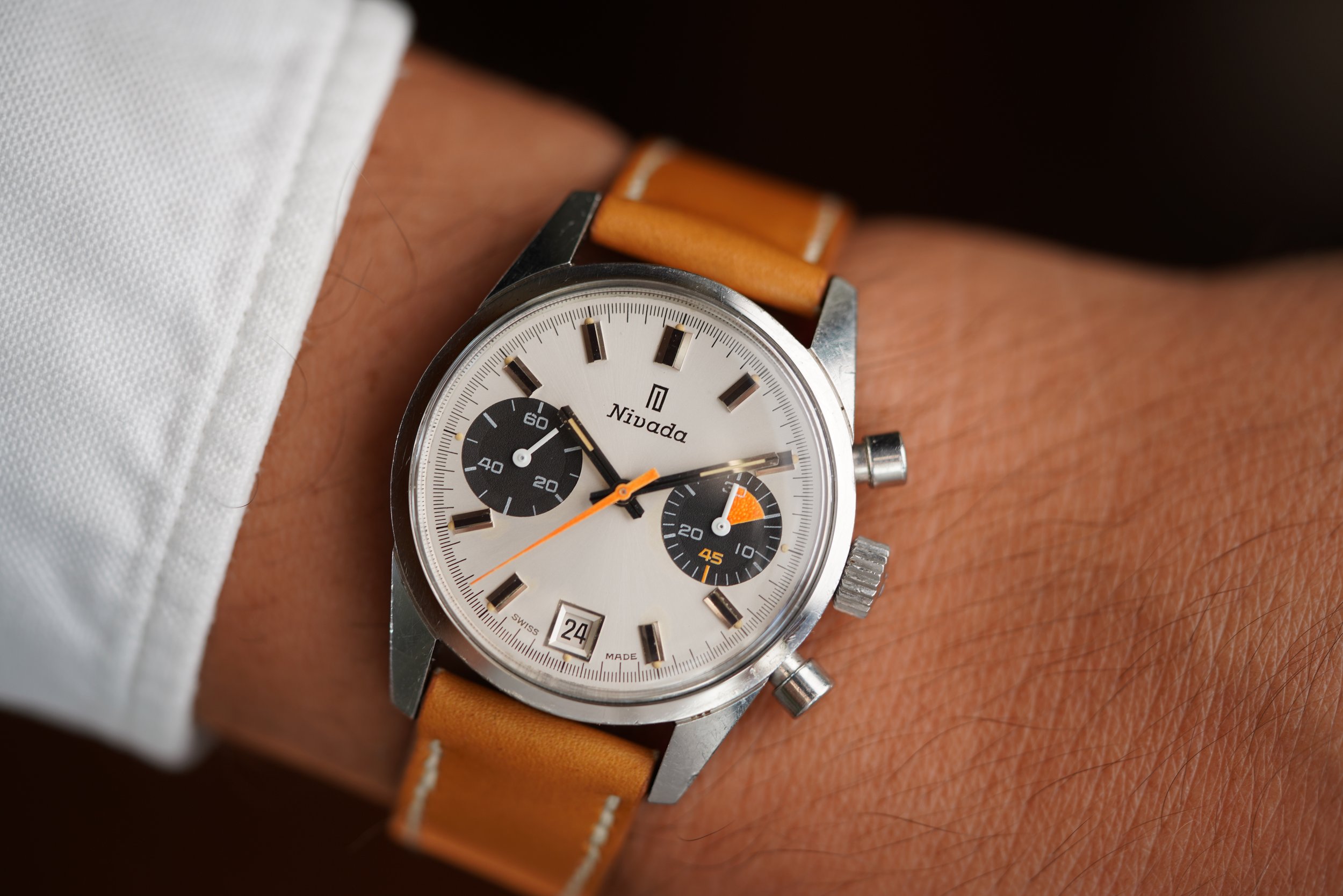 This Nivada Dato is a classic racing chronograph in great condition. The case appears to be unpolished. This example features a white dial with black sub-dials and orange accents. The watch features a date window at 6 ‘o’clock.The watch looks great paired with a honey Wind watch strap. The case measures approximately 35.5mm in diameter and 43.5mm lug-to-lug.