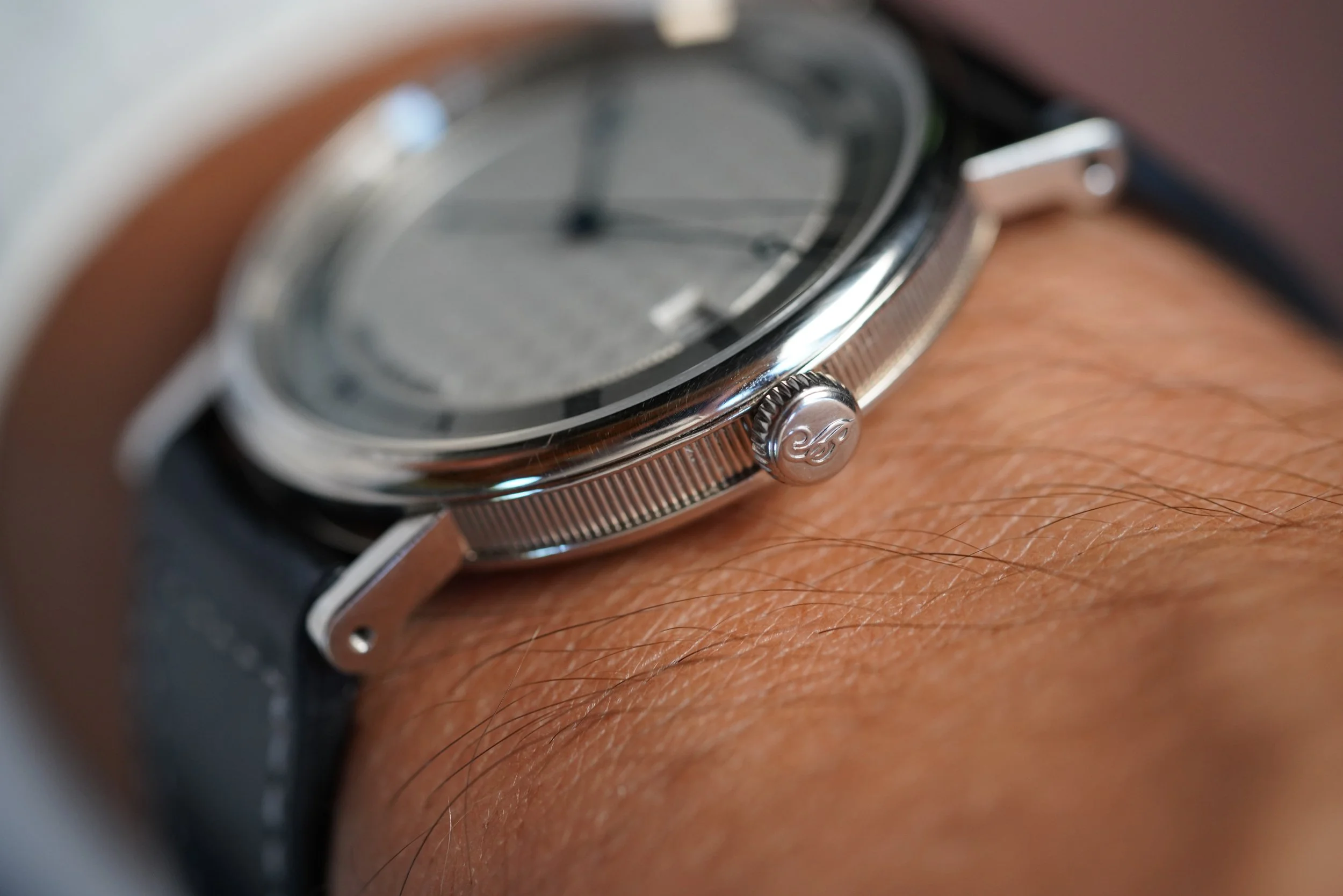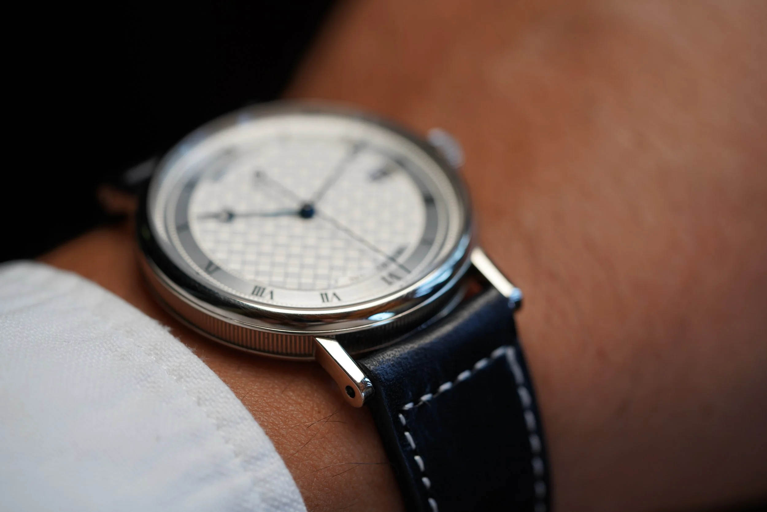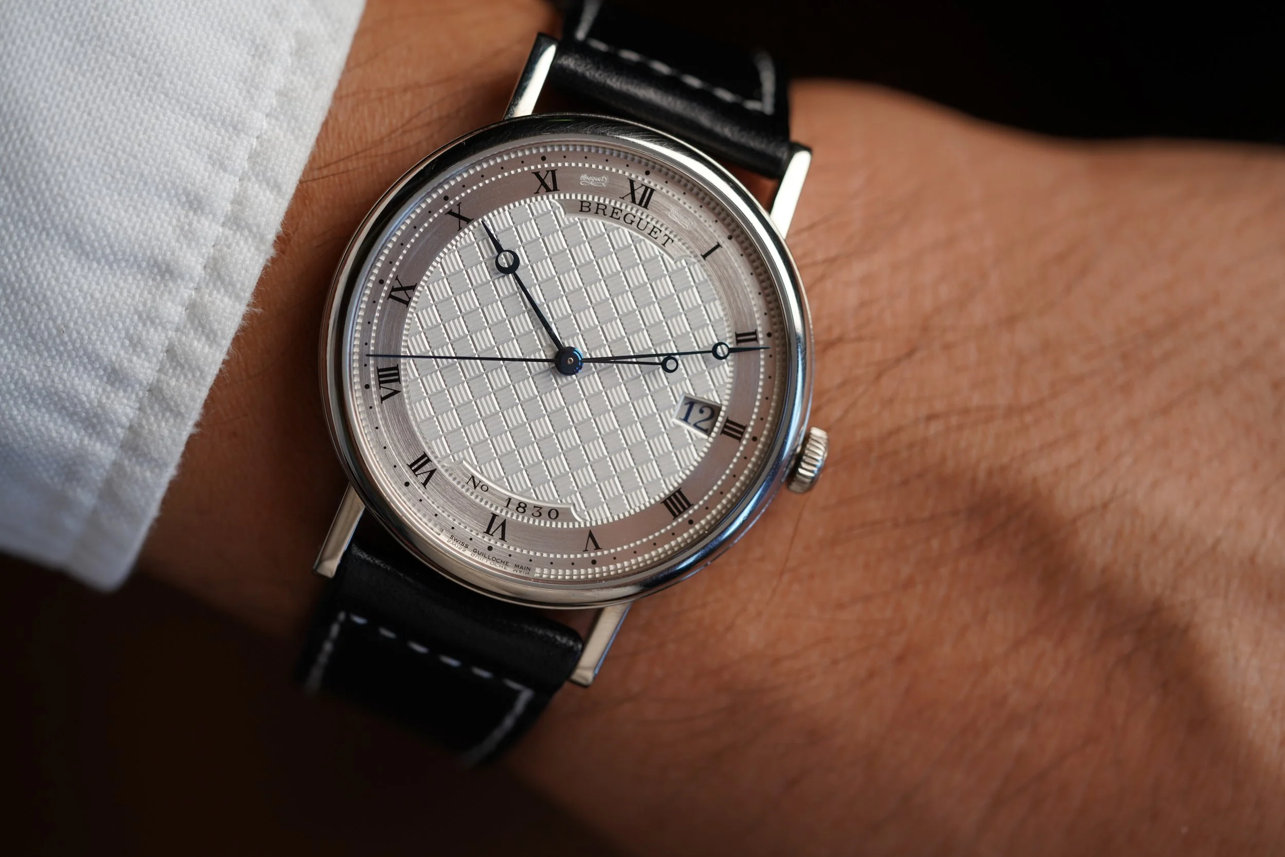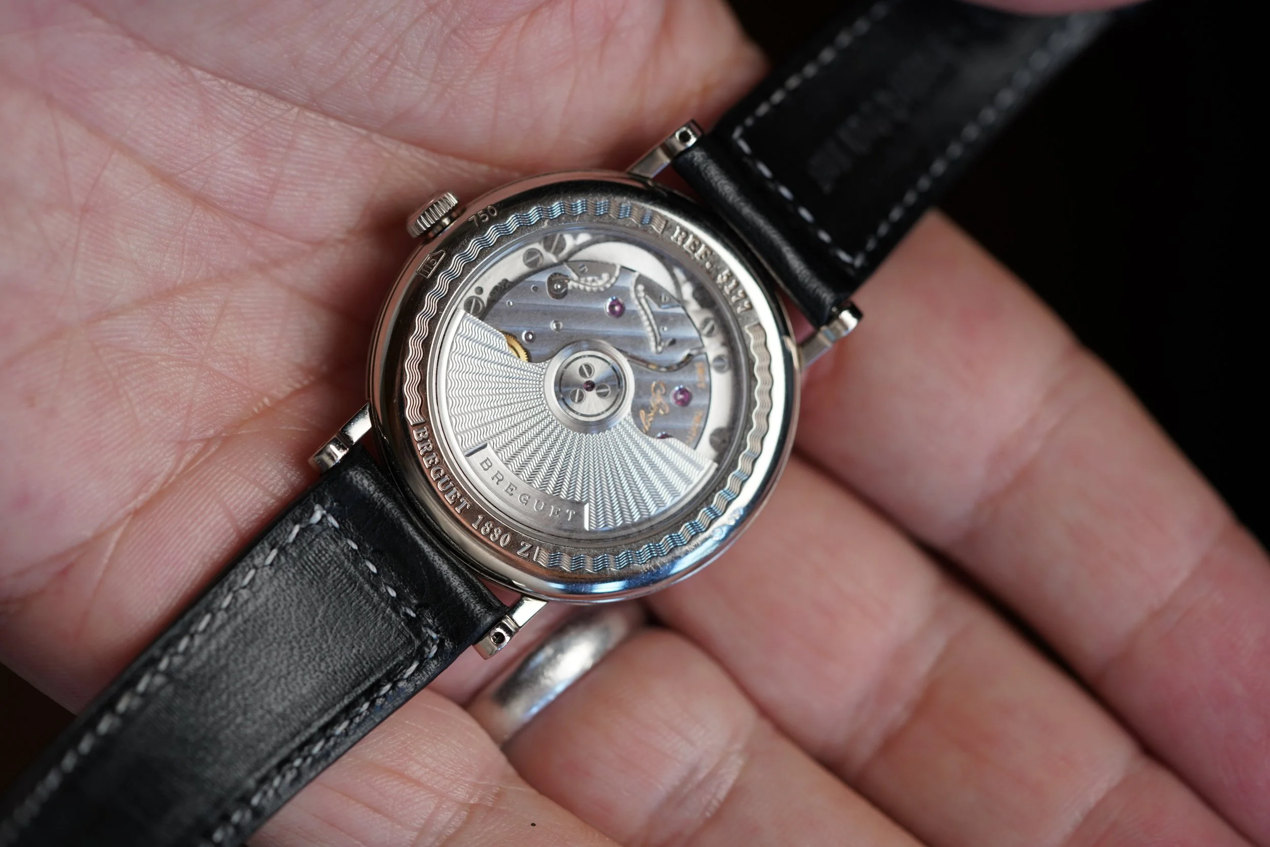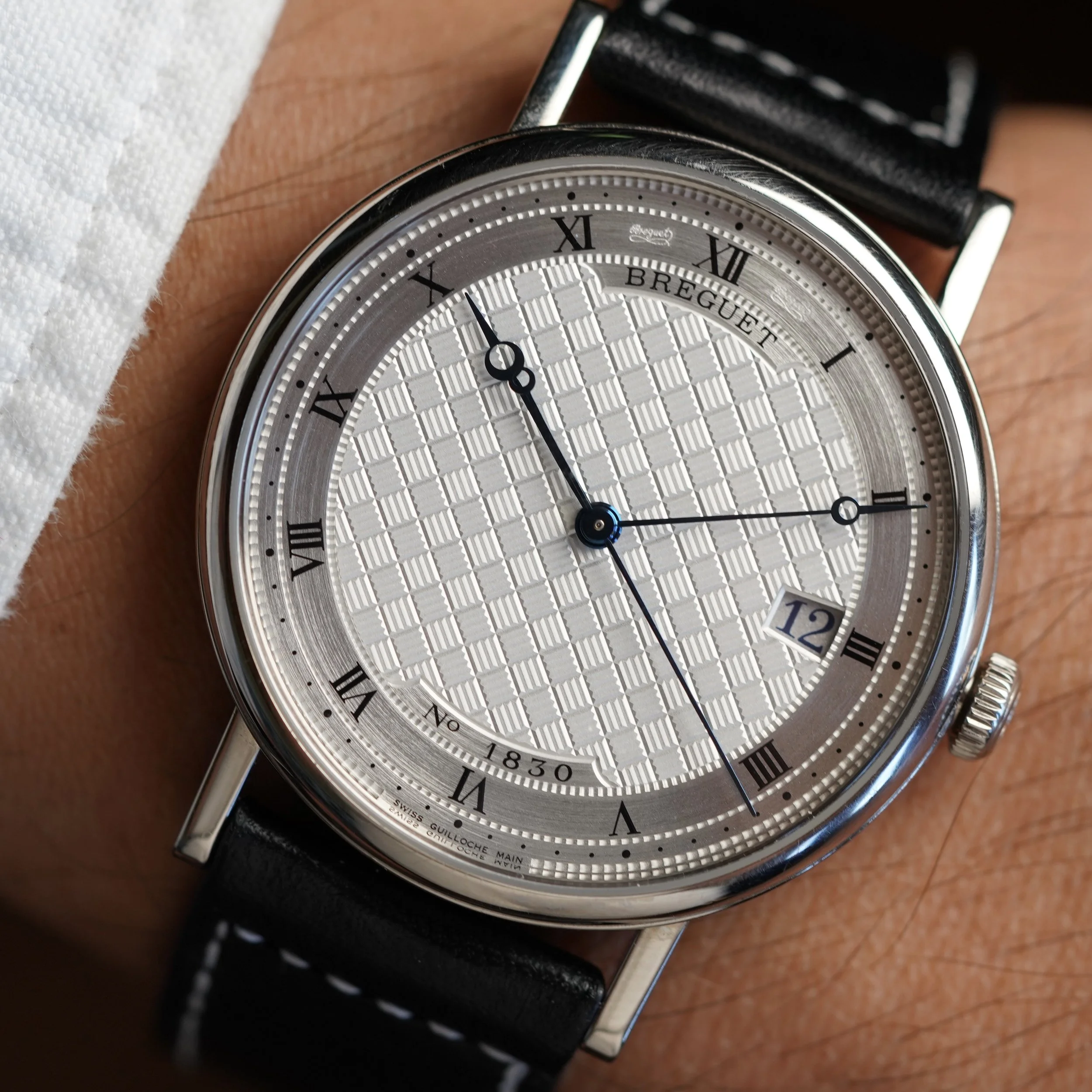 People are saying Breguet is next hot brand. We love hearing that and we hope Abraham-Louis is smiling in heaven hearing the praise. This is a sophisticated Breguet Classique with 18k white gold case. It measures approximately 38mm in diameter. It features an automatic movement which is as beatifully decorated as the dial!