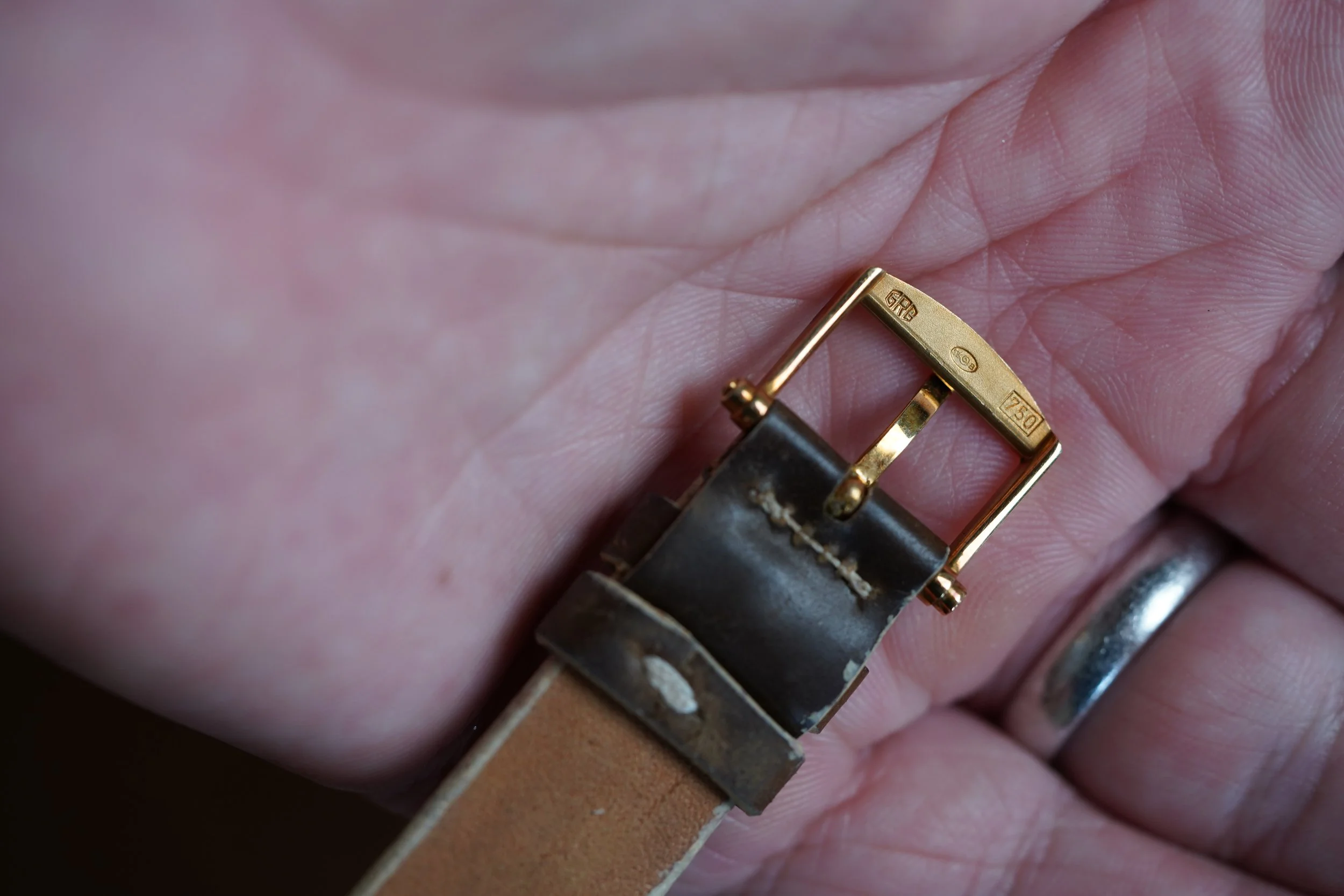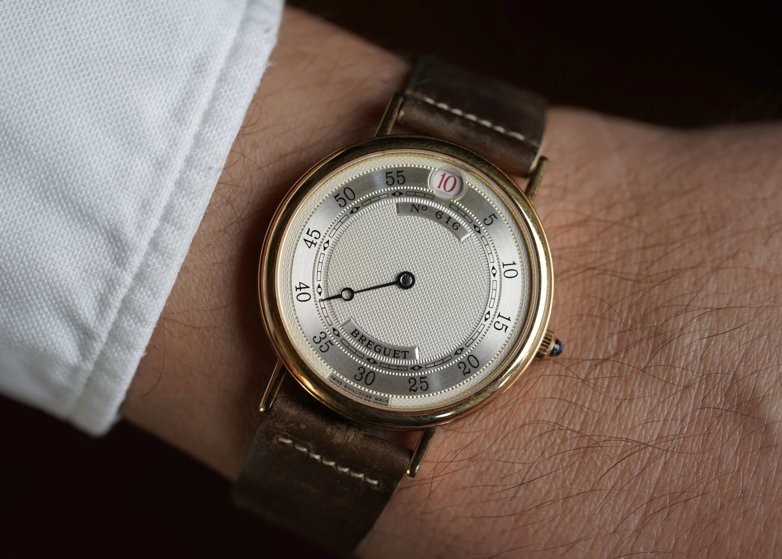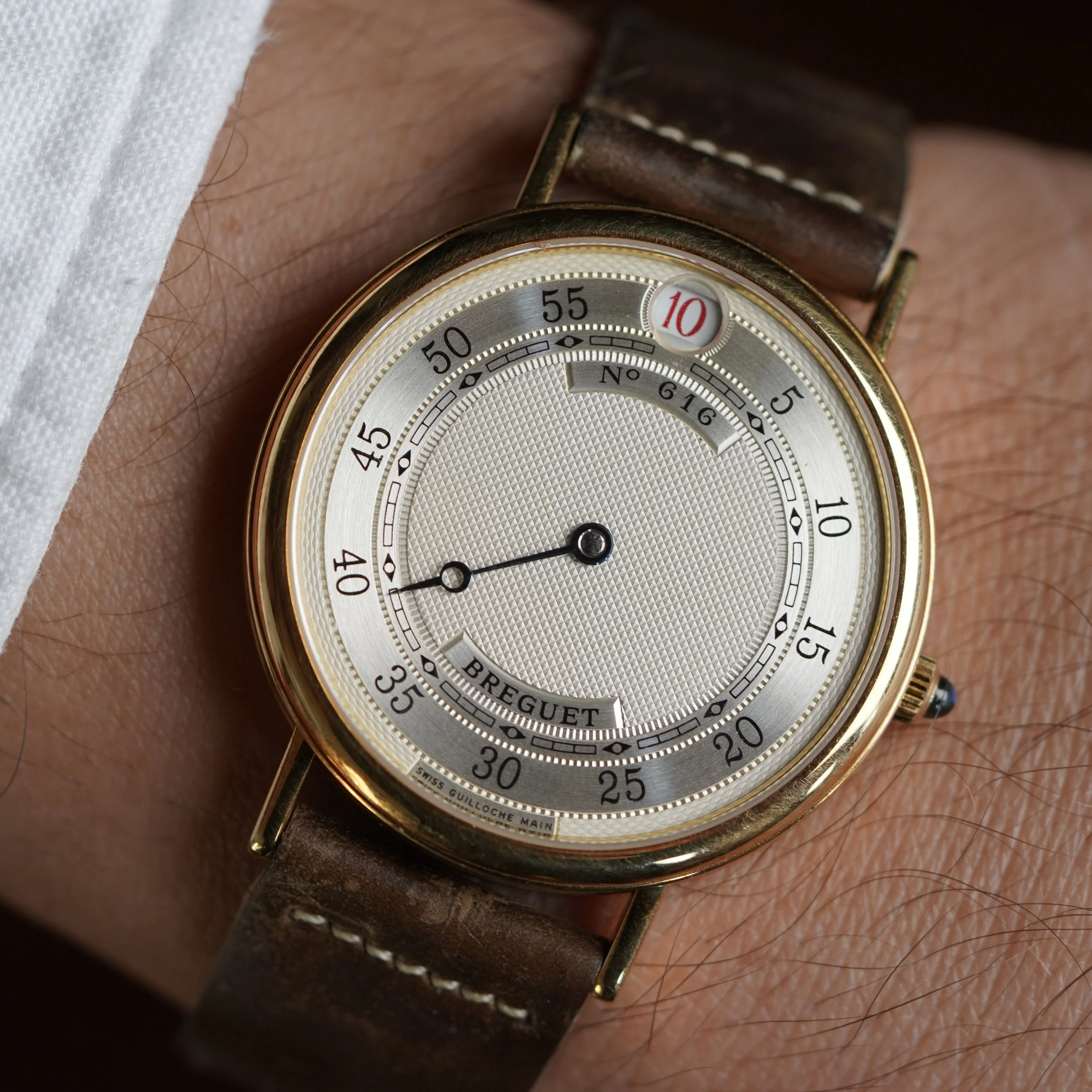 This Breguet reference 3620 is an incredibly elegant take on the jump hour complication. The case is 18k gold and appears to be rose gold, but it is possibly oxidized yellow gold. It measures approximately 36mm in diameter and 43mm lug-to-lug. It features a guilloché silver dial with classic Breguet numerals. There is an aperture at 12 o’clock for the hour. These are very rare and interesting timepieces. For those with a penchant for the uncommon complication, look no further.