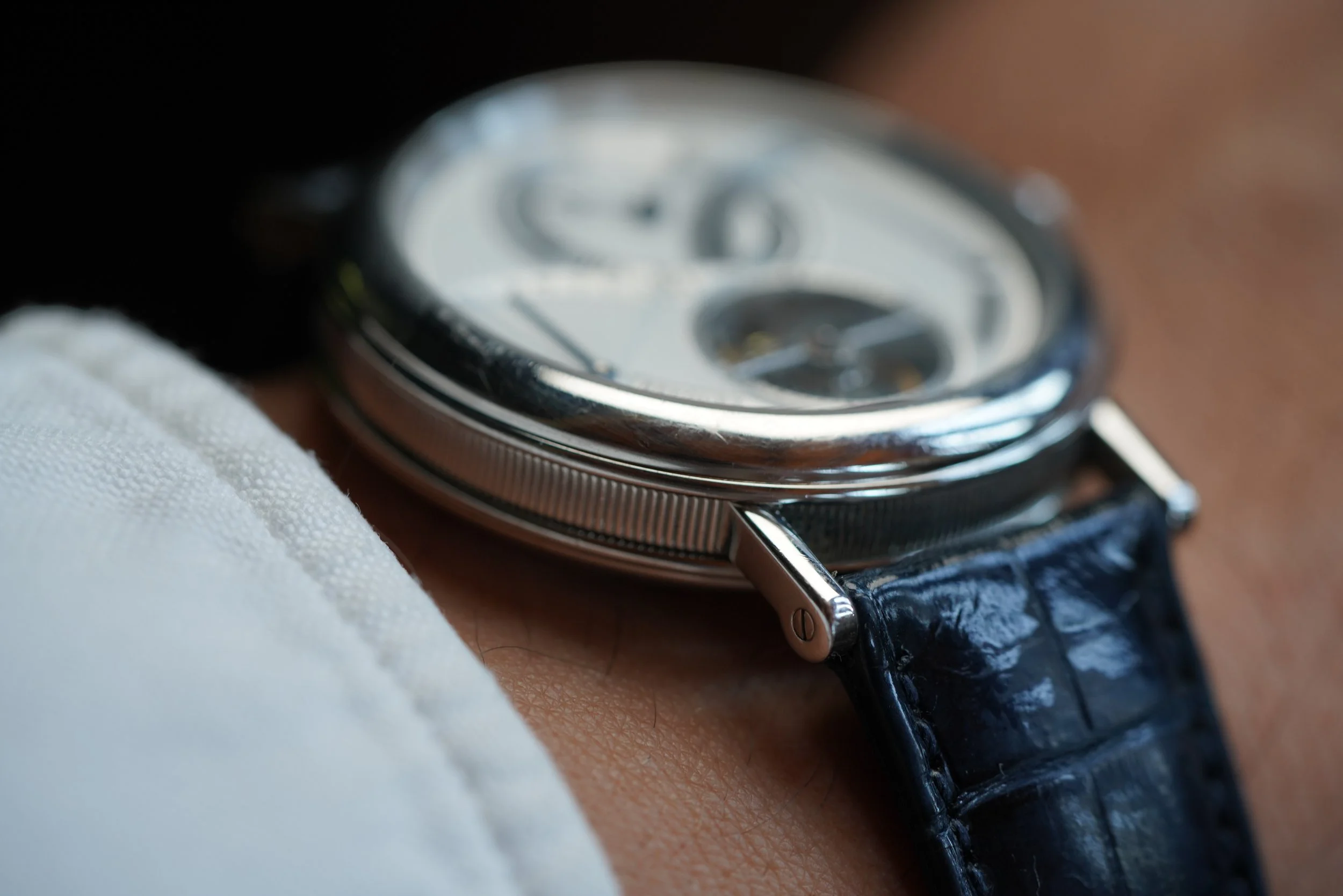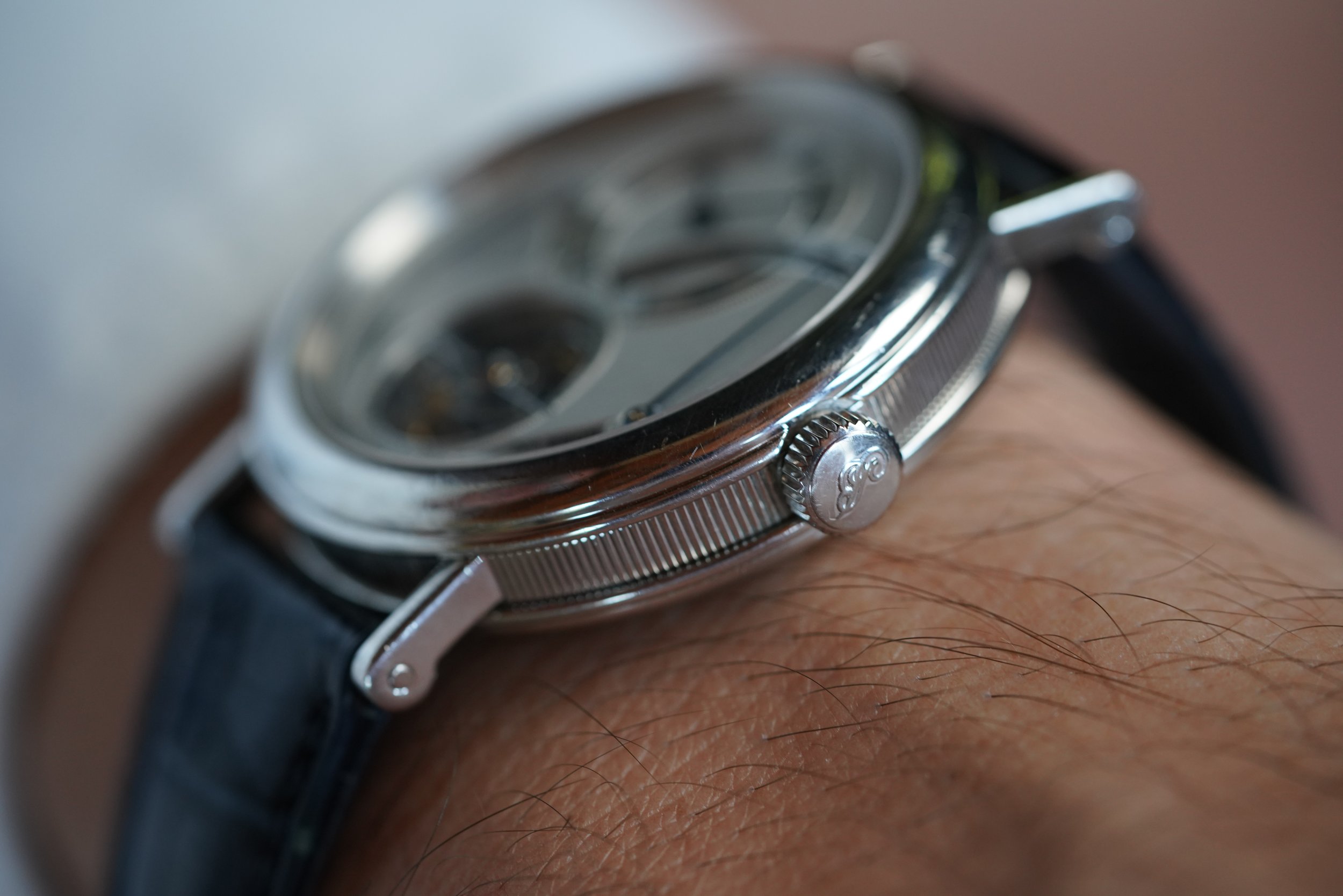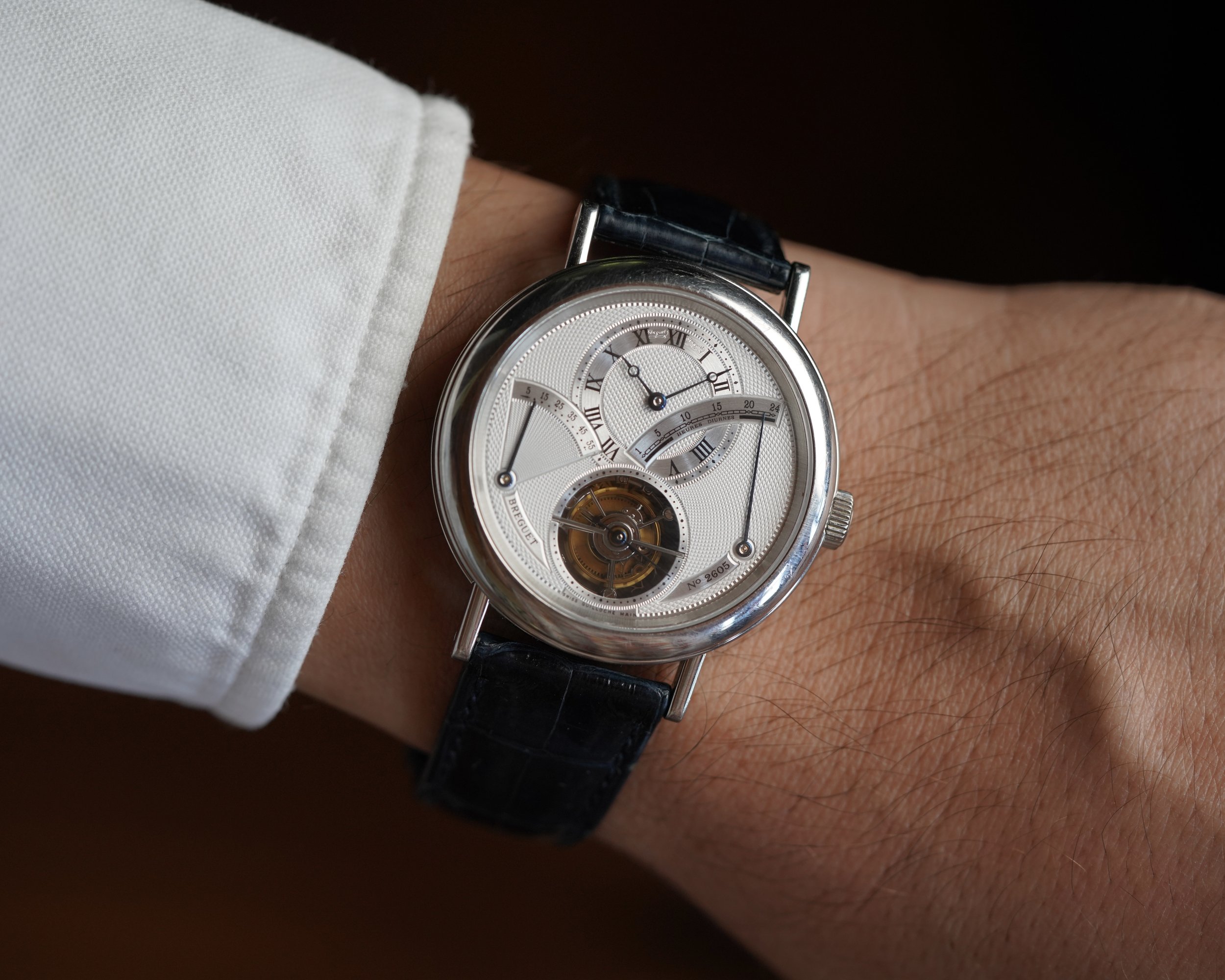 This Breguet Tourbillon is a spectacular and ornately decorated timepiece. The watch measures 40mm in diameter. The case is made of platinum. The case appears to be unpolished. The dial features an incredible array of guilloche patterns. It is powered by the calibre 558.1 movement. It features a power reserve indicator and retrograde 24-hour display.