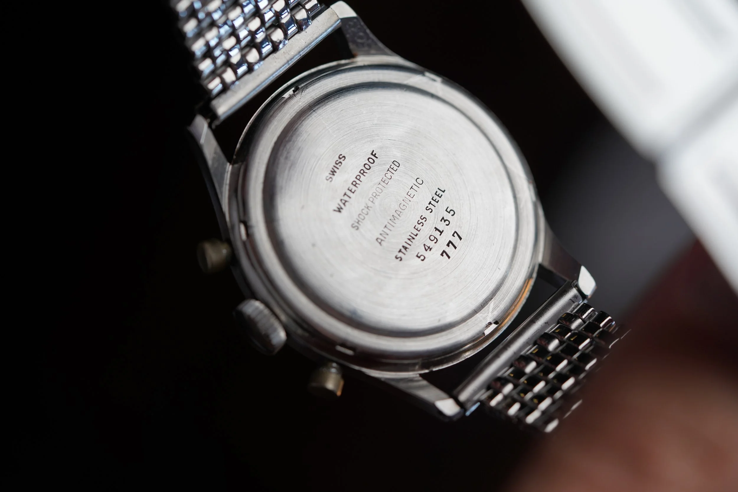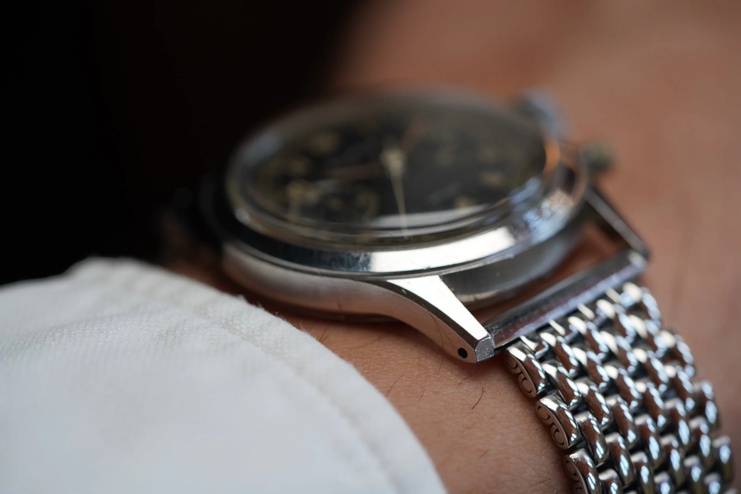 This Breitling chronograph reference 777 is an awesome vintage chronograph in great condition. The gilt glossy dial is highly attractive and features a gold-colored minutes/seconds track and a copper-colored outer tachymeter track. The serial number places it into the circa late 1943 to early 1944 range. The dial has an attractive and small “ANTI-CHOC” signature above 6:00 for the anti-shock capabilities of the Venus movement. It is paired on a contemporary beads of rice bracelet. The pushers appear to be original but have lost the chrome plating. The case measures approximately 37mm in diameter.