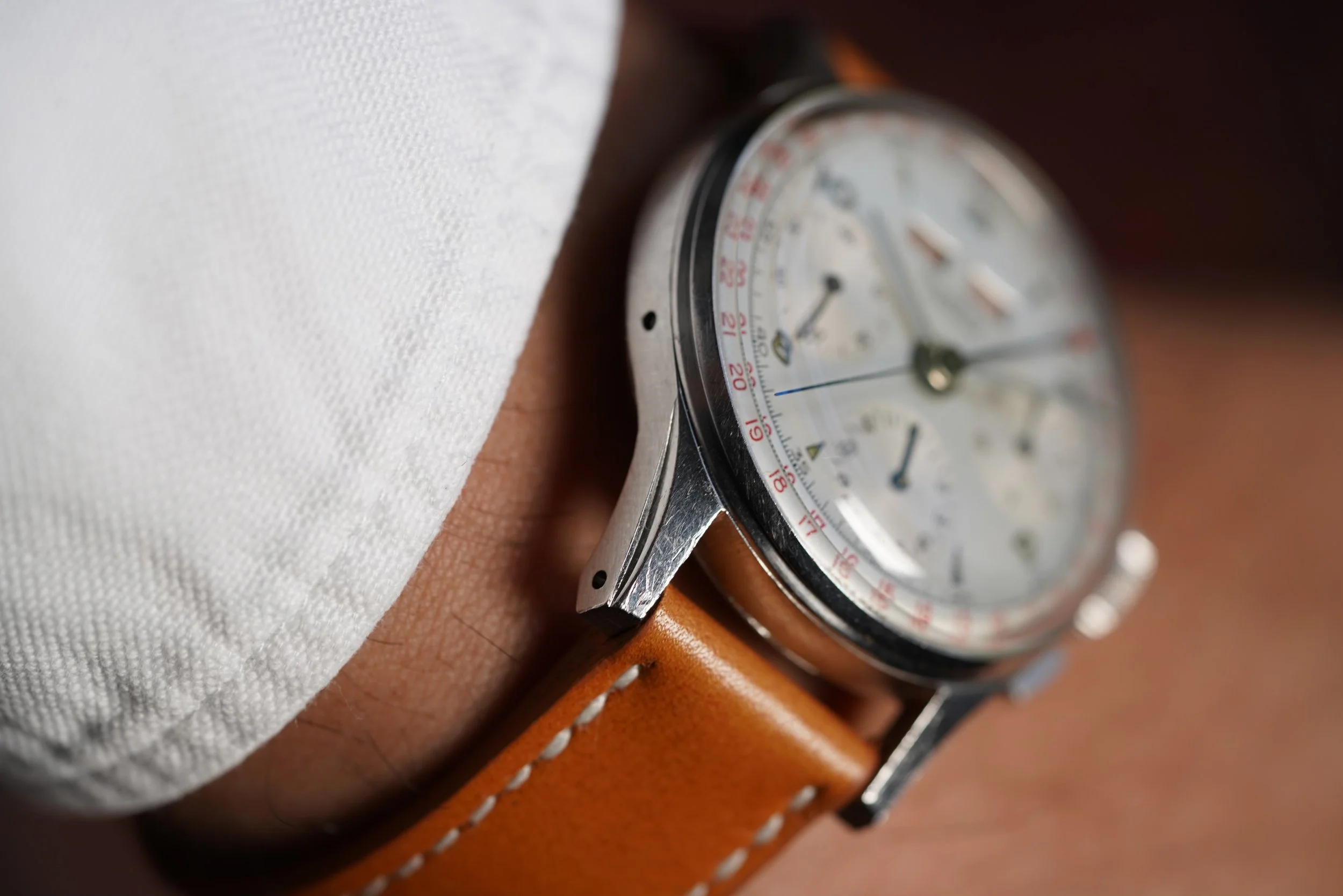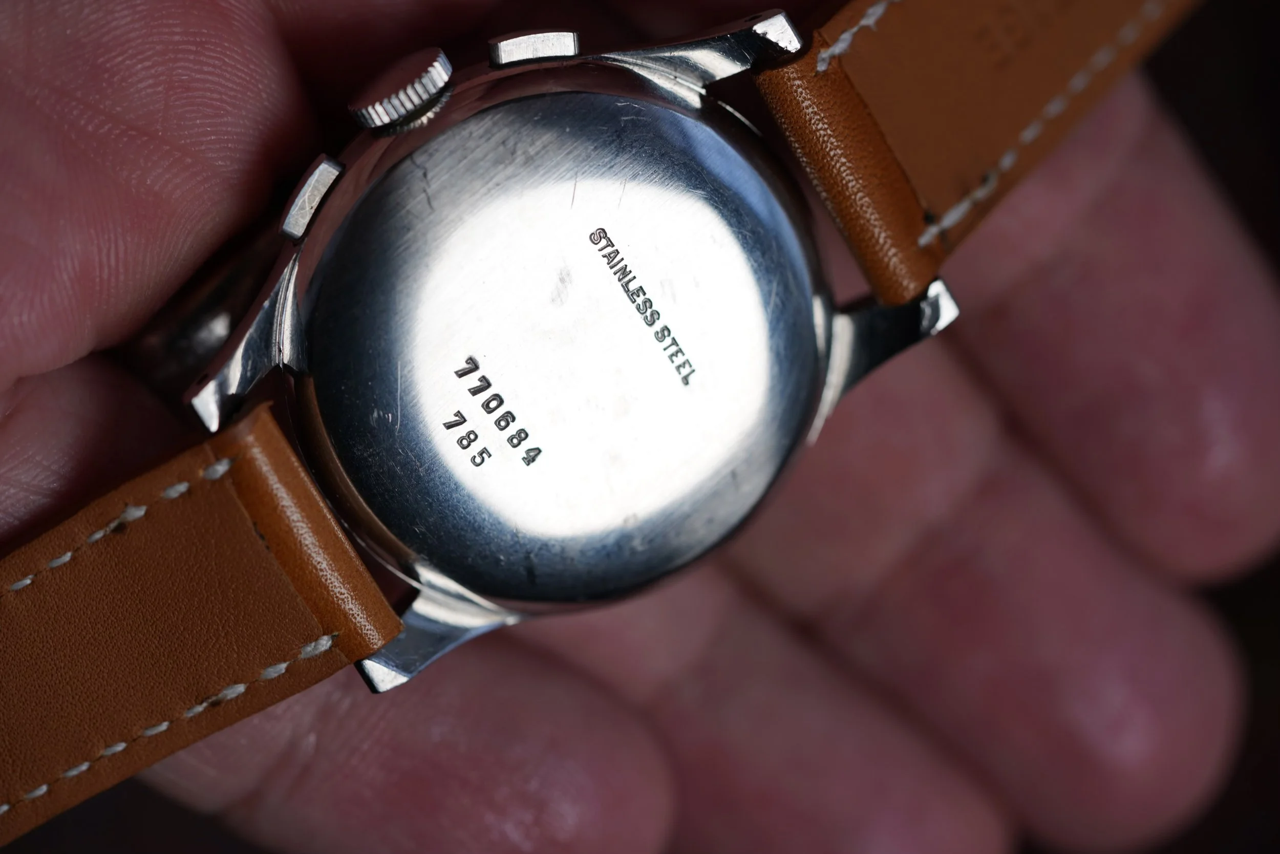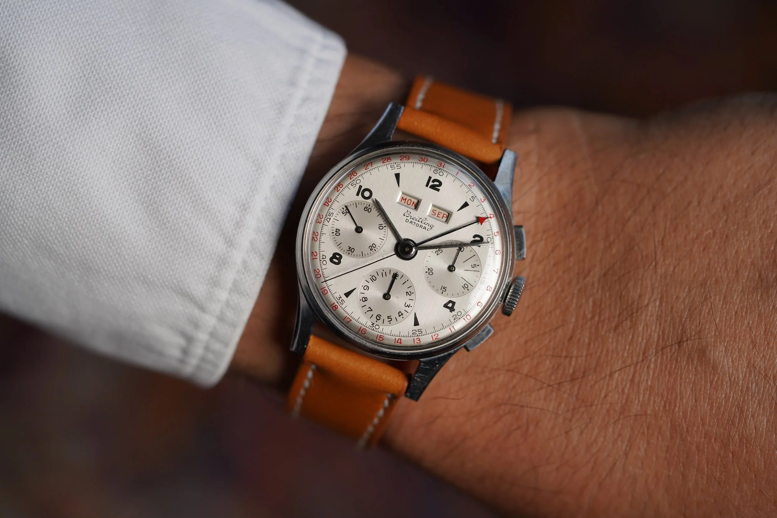 I’m thrilled to offer this amazing Breitling Datora reference 785. The case is in outstanding condition and remains unpolished. The case measures 35mm in diameter (43mm lug-to-lug). The dial is very well preserved and looks incredible.