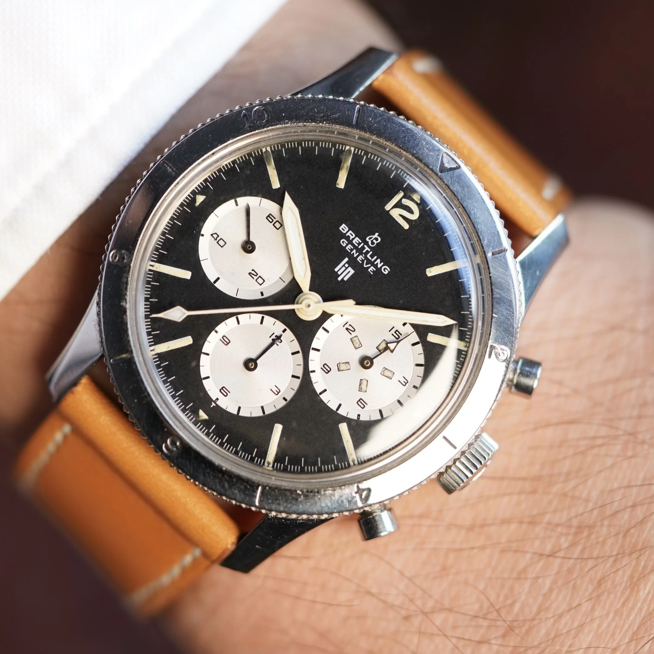 This Breitling "Raquel Welch" reference 765 is an awesome and rare example that was retailed for the French market to LIP. The case measures 41mm in diameter (49mm lug-to-lug). It has been lightly polished, but has strong form.