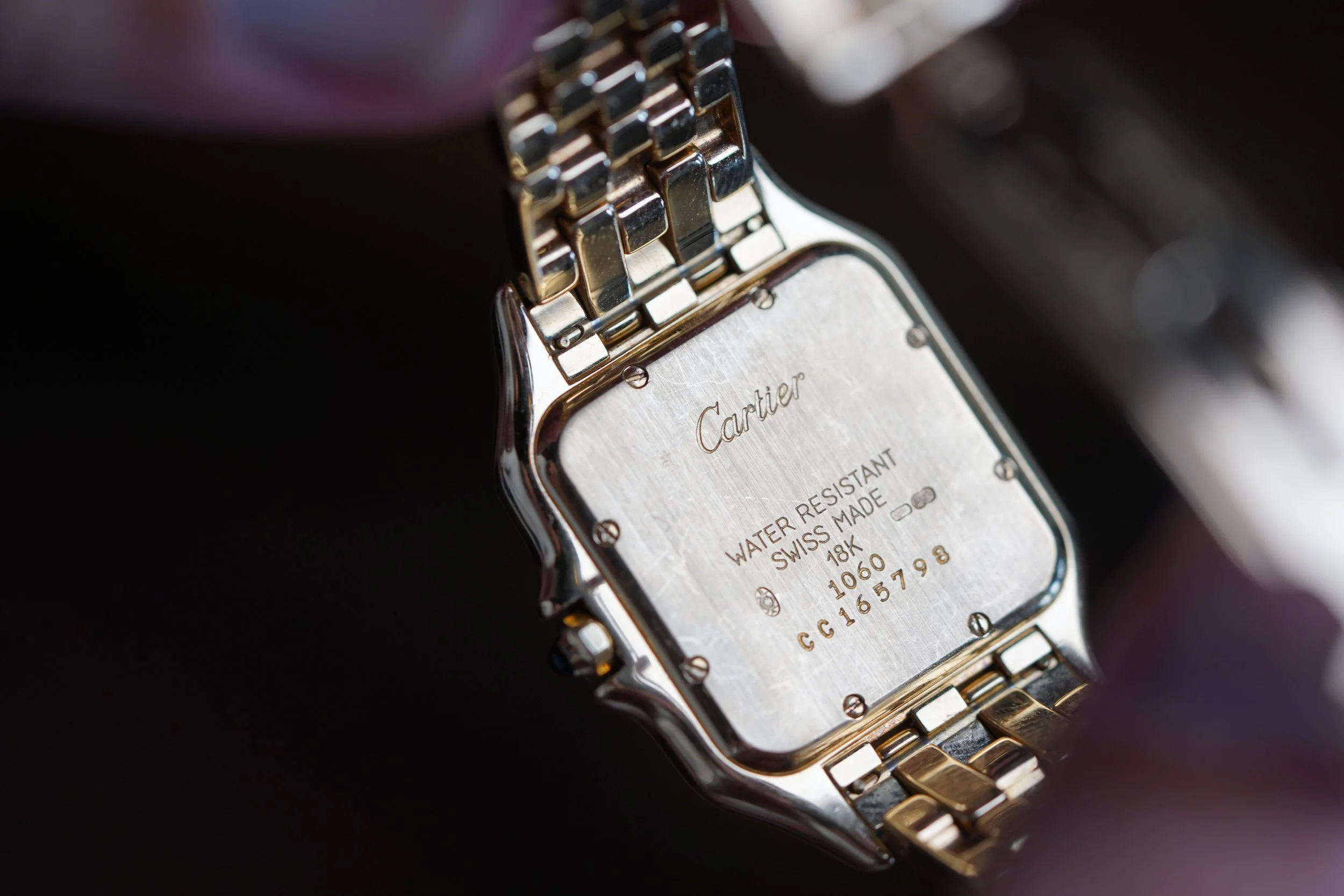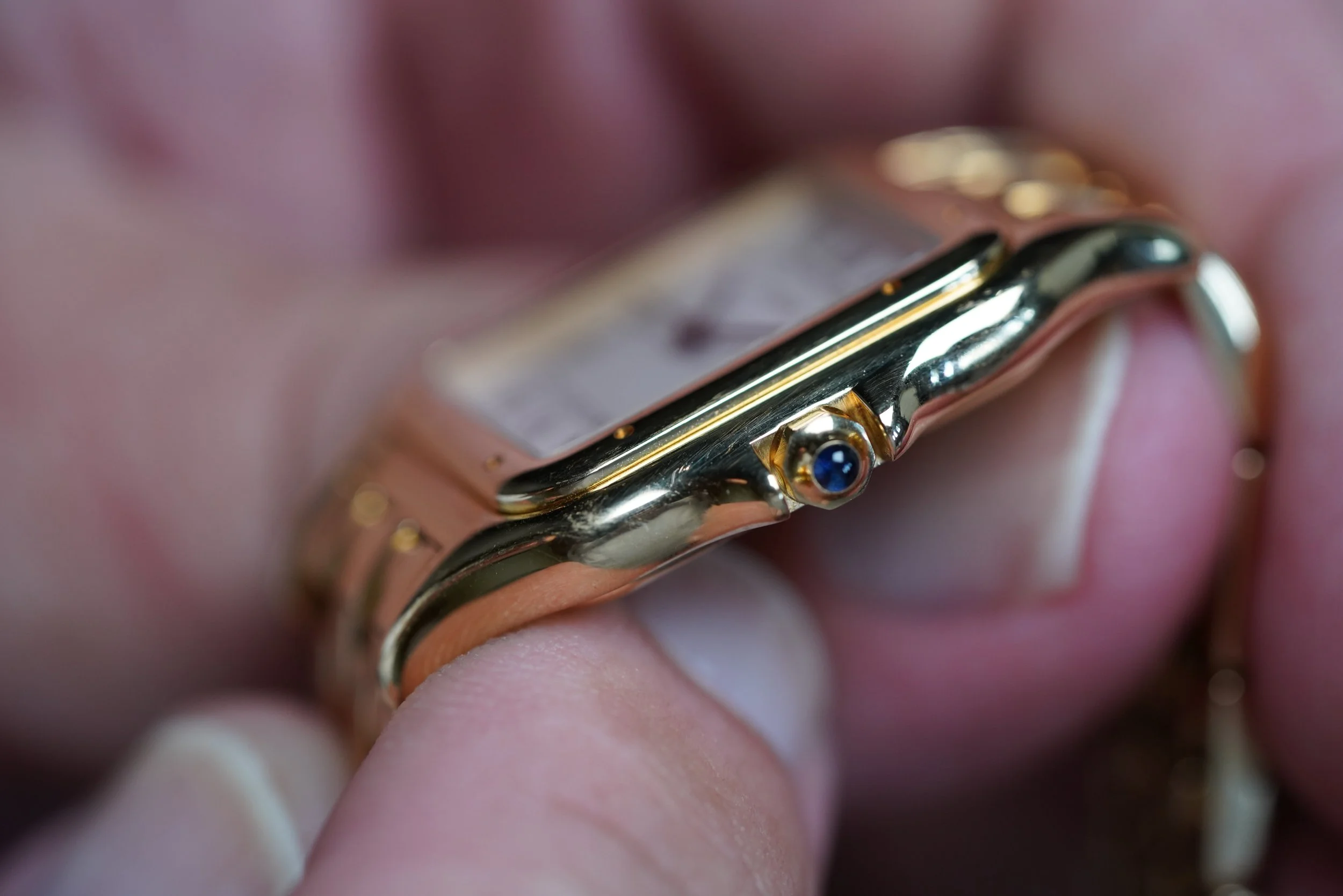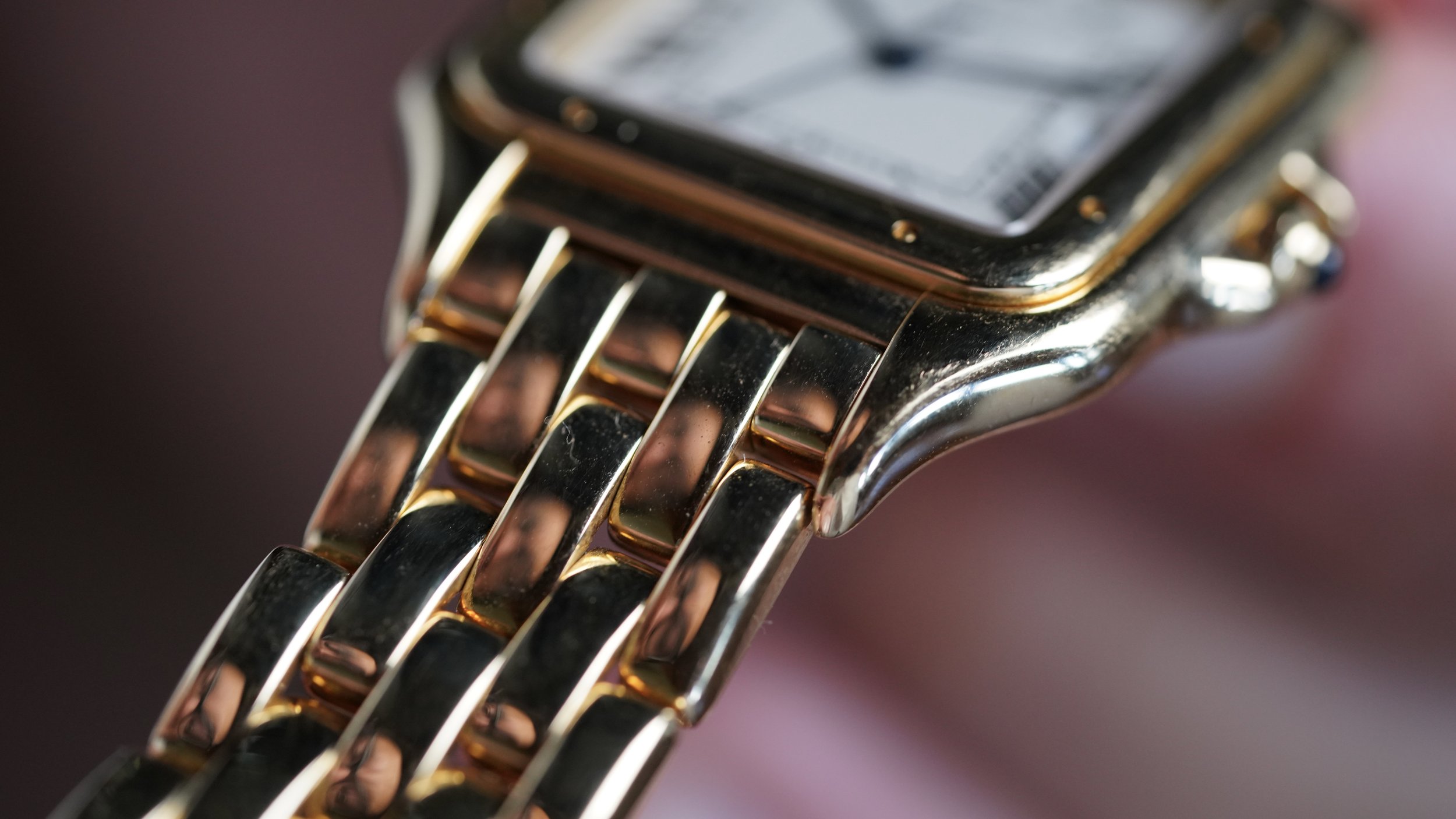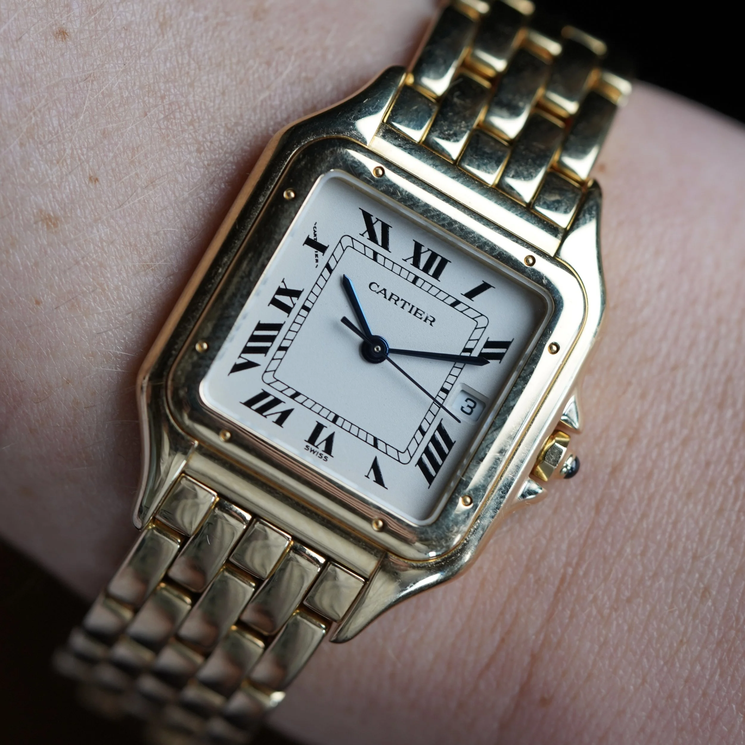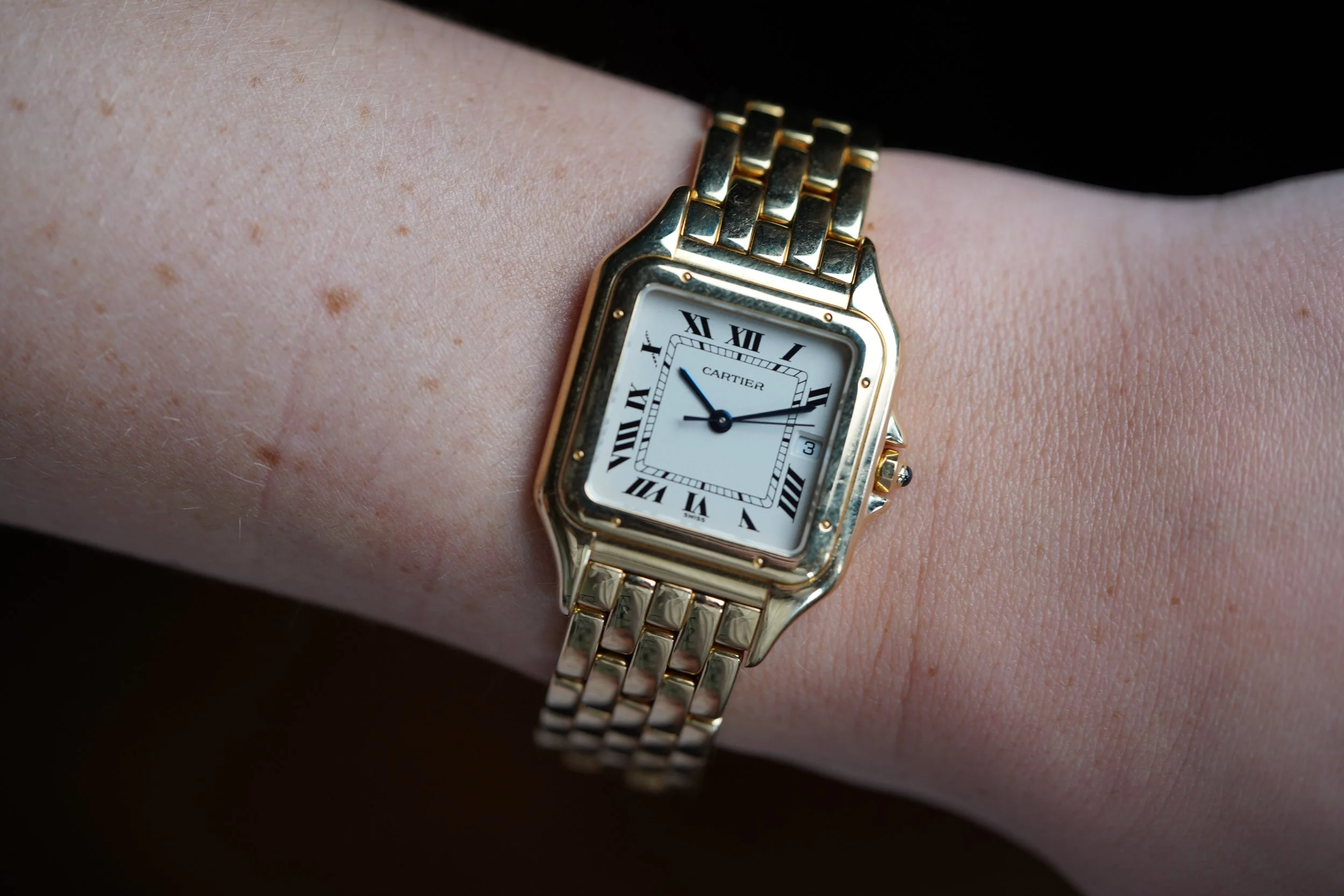This Cartier Panthere 1060 is a very special timepiece. The case measures 27mm in diameter by 36mm in length. The case is 18k yellow gold. It appears to be unpolished. The bracelet is very nice and comfortable.