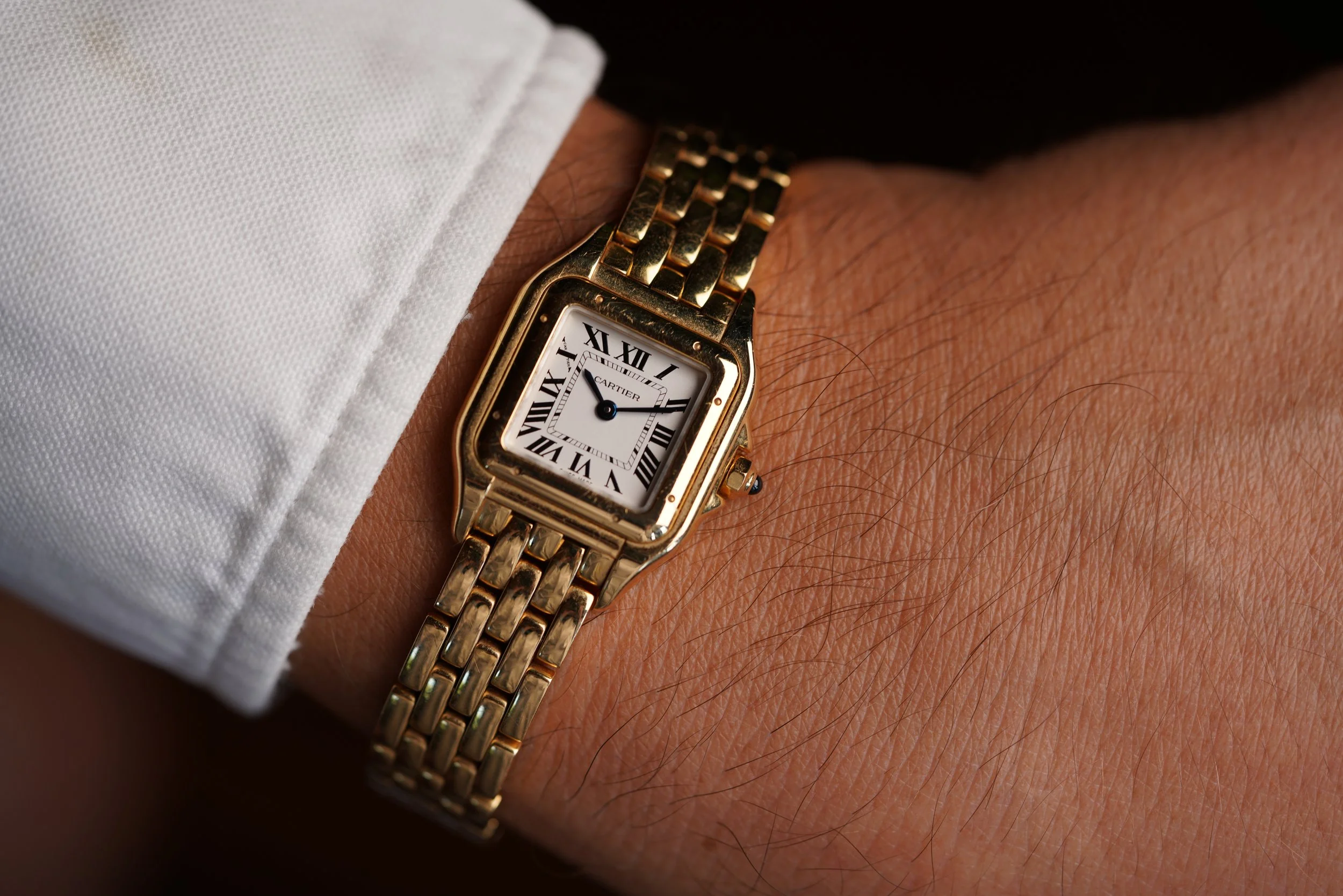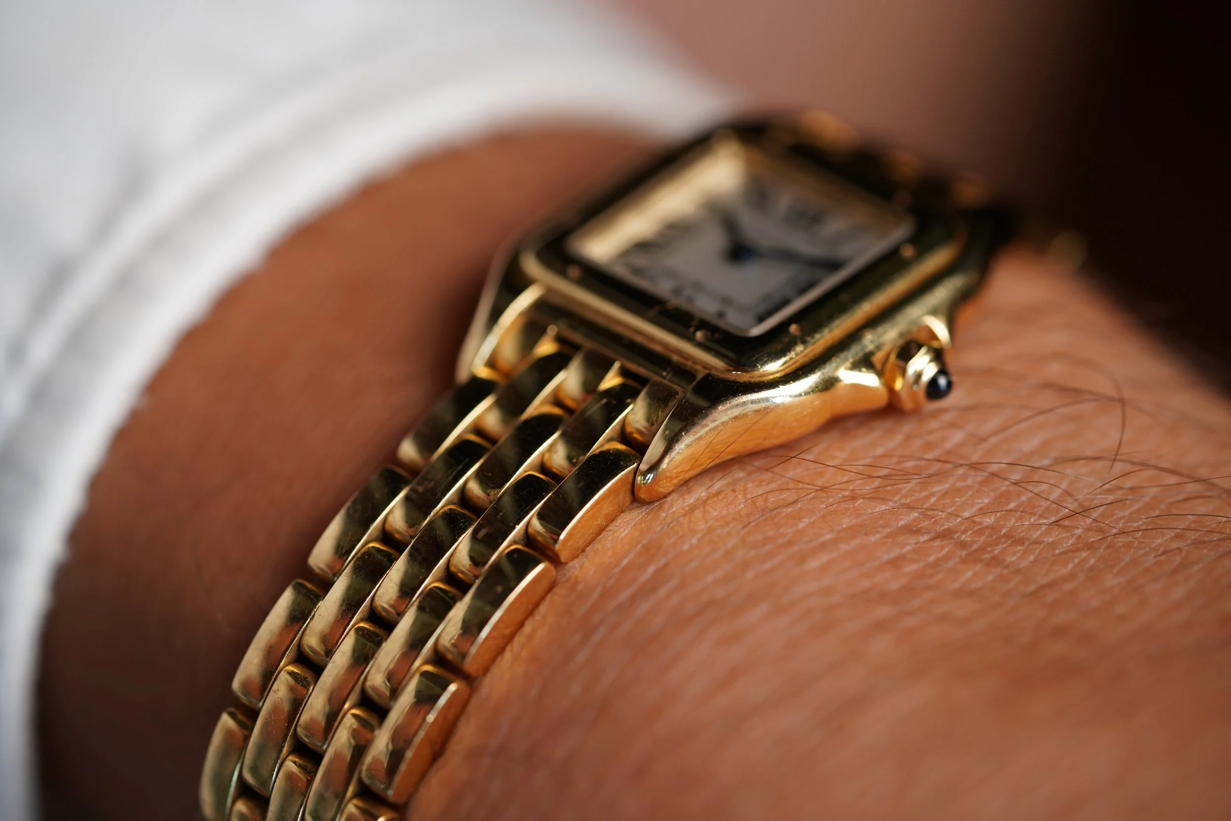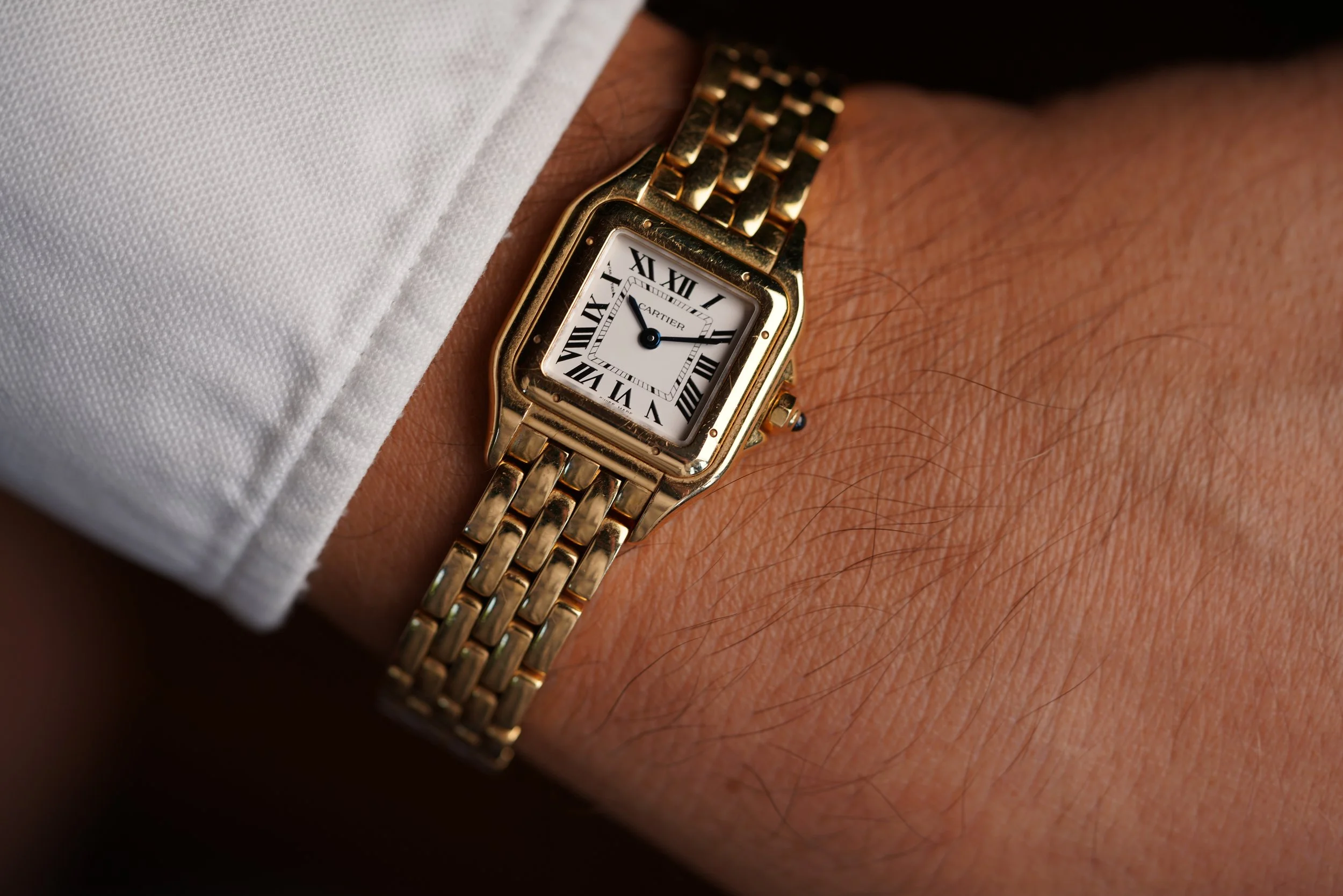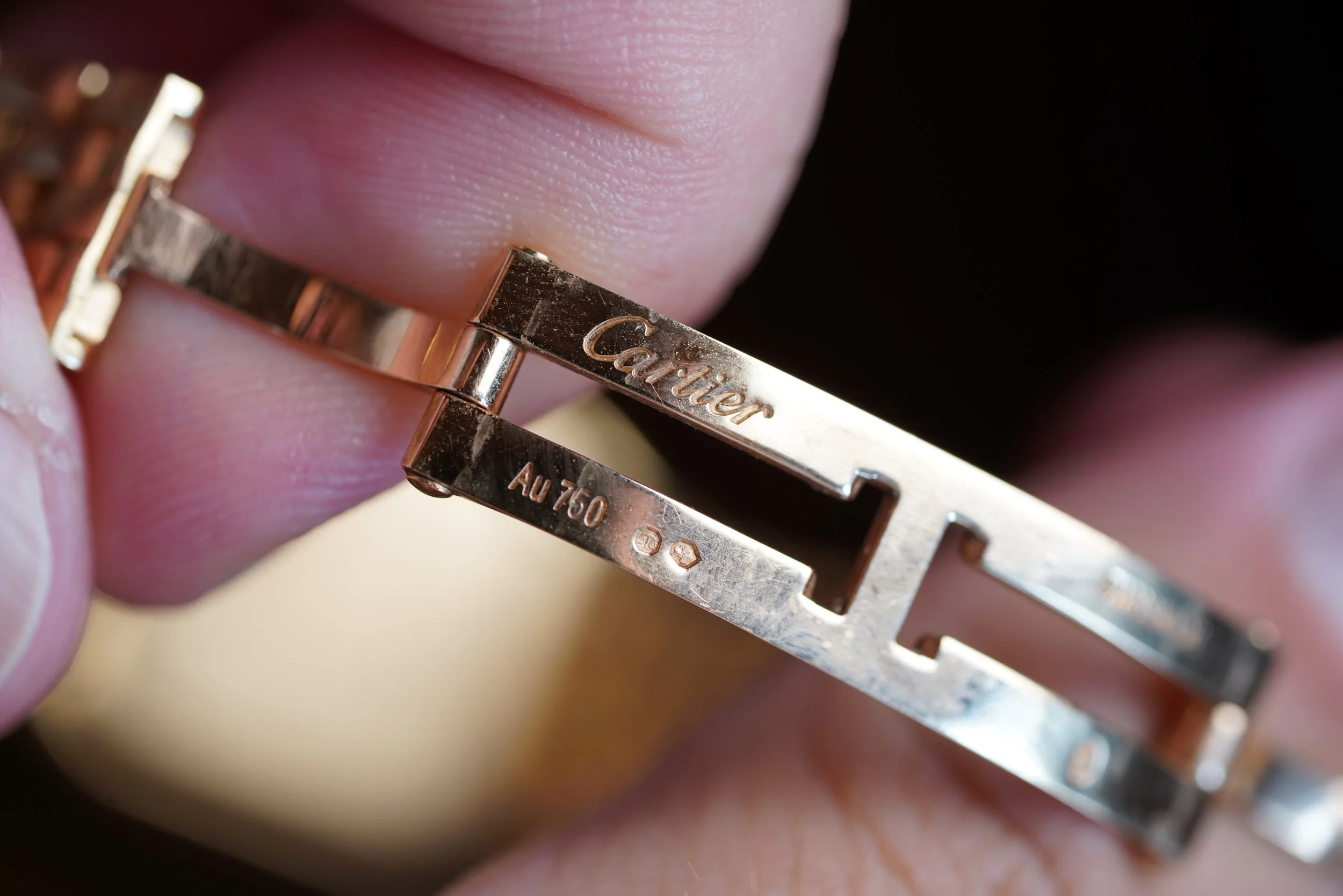 This Cartier Panthere WGPN0008 is a very special timepiece. The case measures 22mm in diameter by 31mm in length. The case is 18k yellow gold. We believe it is unpolished. The bracelet is very nice and comfortable. It was purchased in 2023. It is a quartz movement.