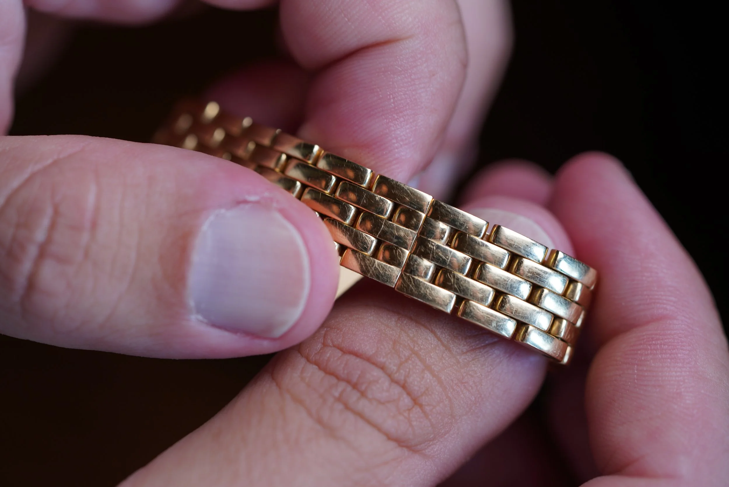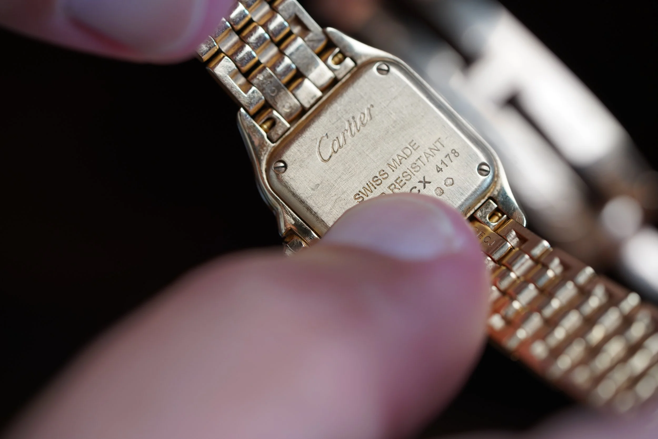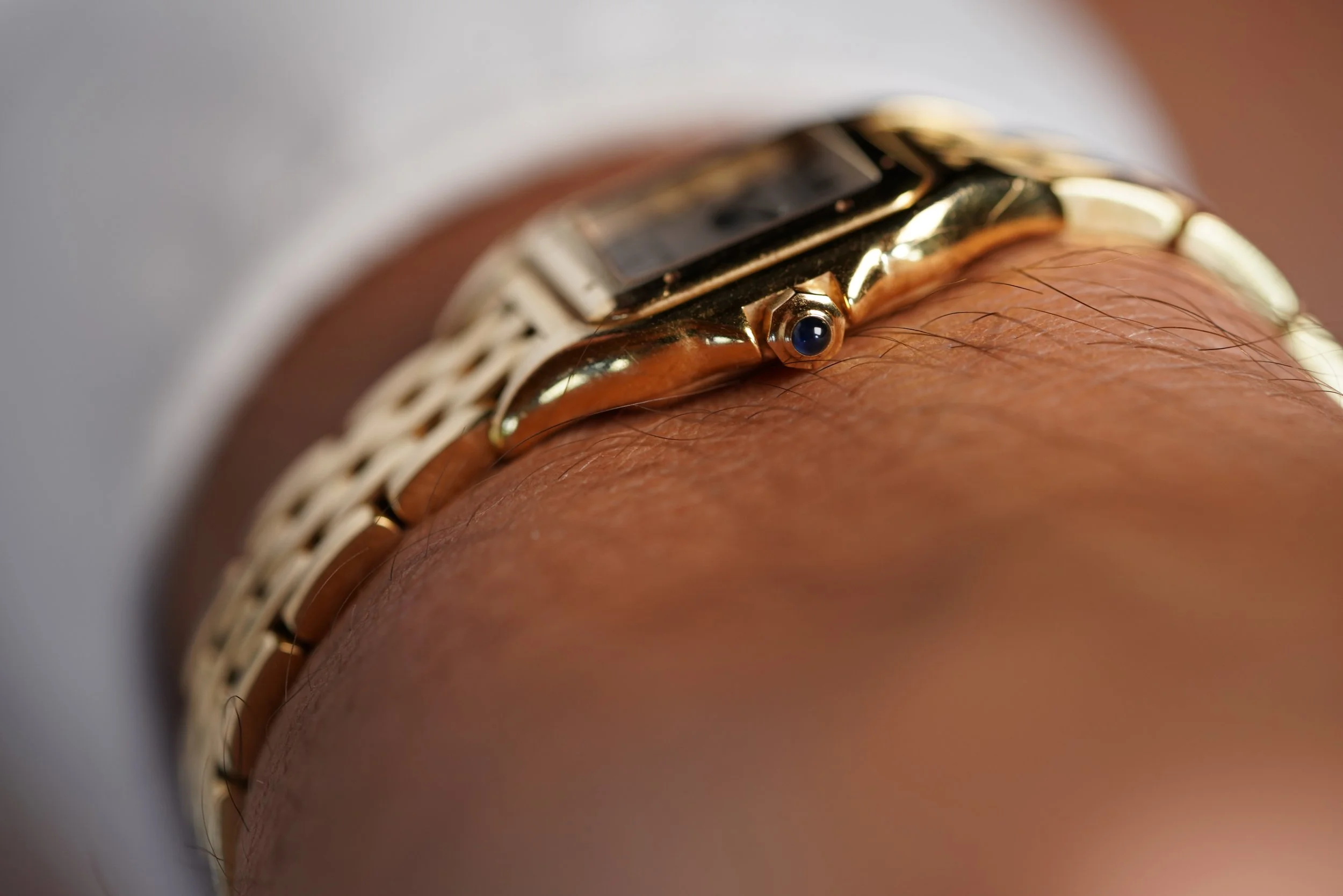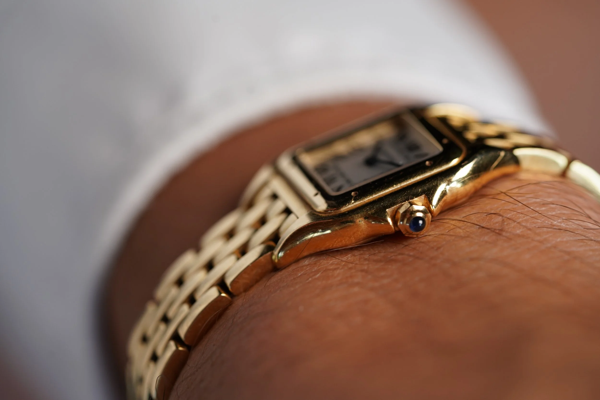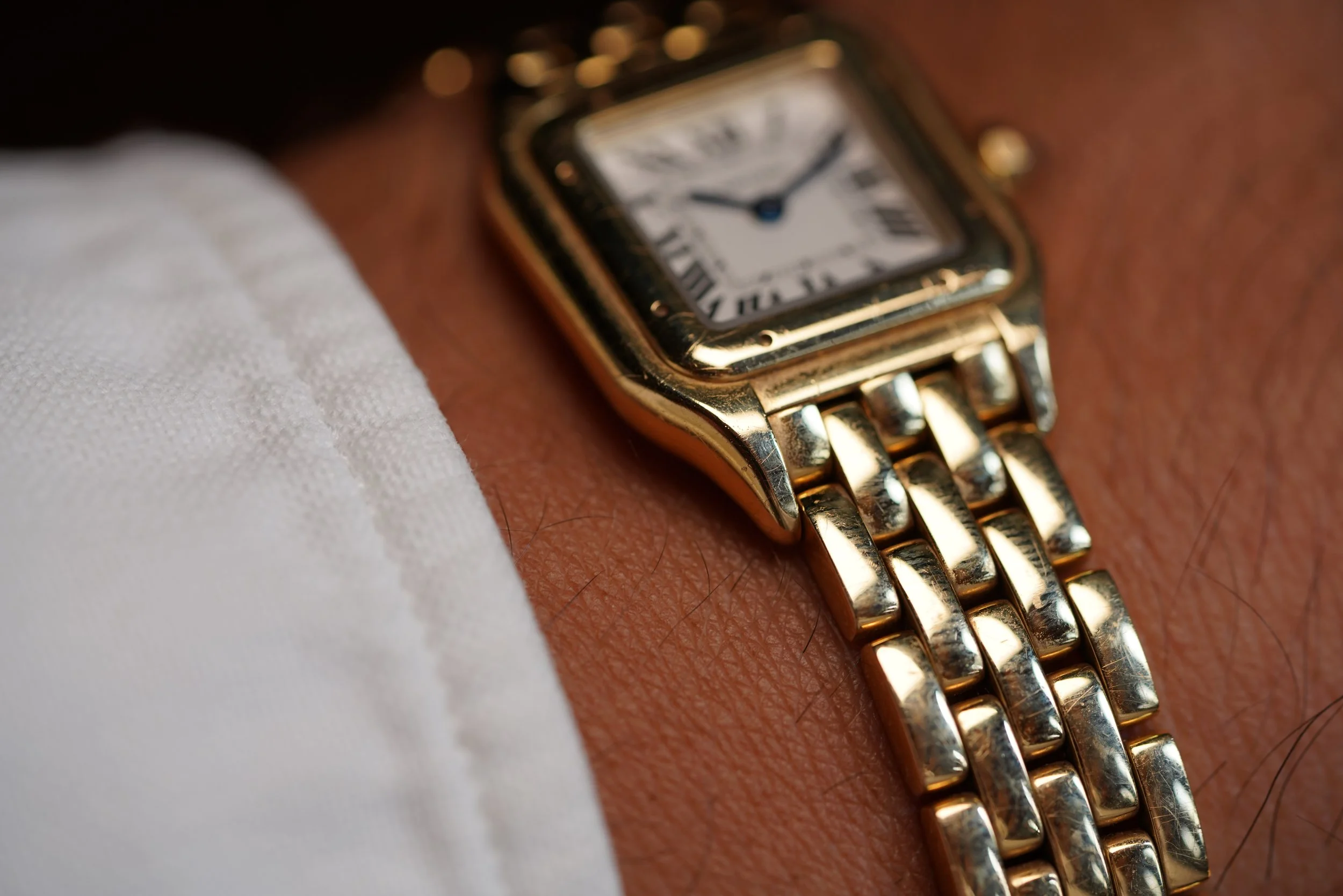 This Cartier Panthere WGPN0008 is a very special timepiece. The case measures 22mm in diameter by 31mm in length. The case is 18k yellow gold. We believe it is unpolished. The bracelet is very nice and comfortable. It was purchased in 2023. It is a quartz movement.