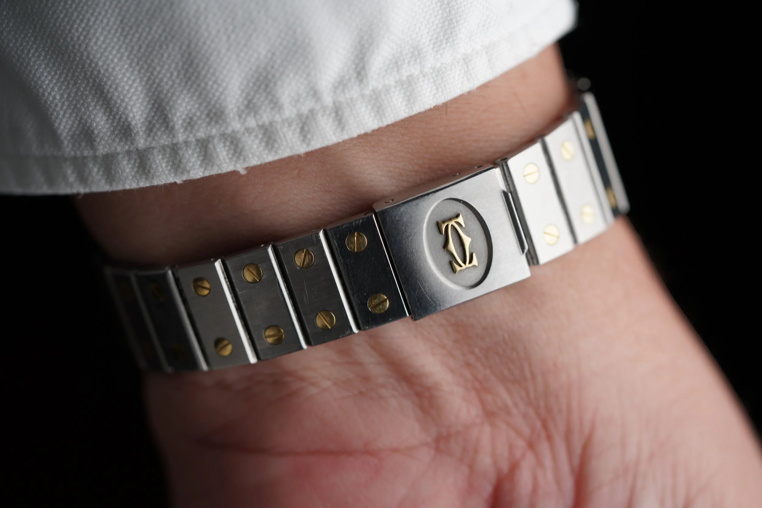 This Cartier Santos Carrée is an elegant two tone watch. It measures 29 by 41mm. The case and bracelet are in 18k yellow gold and stainless steel. It is automatically wound. It features a white dial with classic Cartier Roman numerals. There is a date aperture at 3 o’clock. The case is polished.