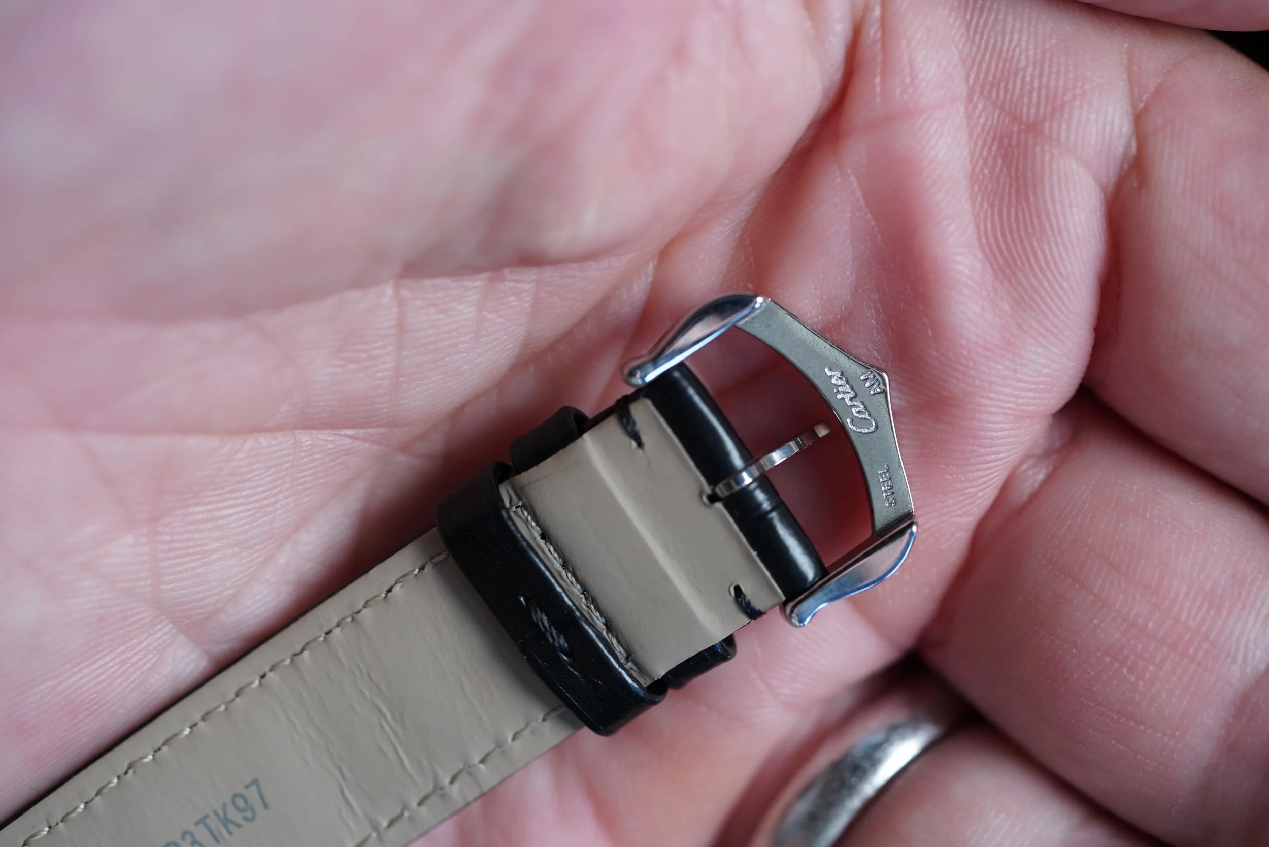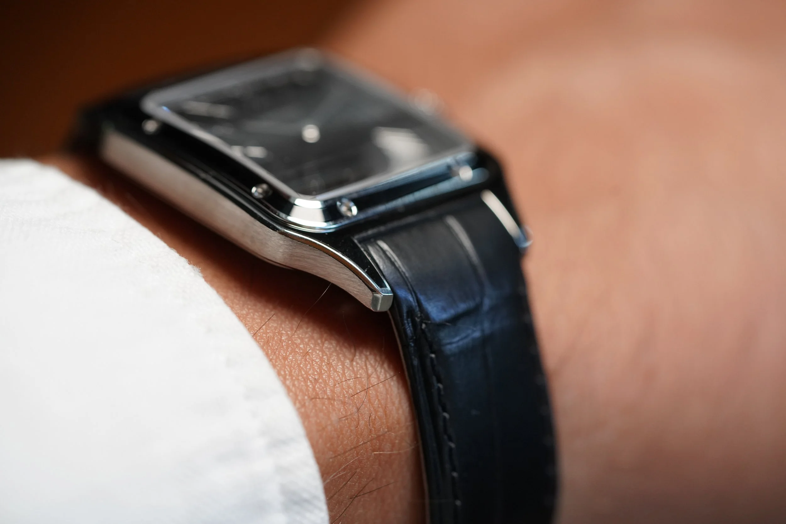 This is a very regal Cartier Santos Dumont reference WSSA0046 / 4298. The dial is a beautiful silver with Roman numerals. It measures 31.5mm by 43.5mm (lug to lug). The case is made of Stainless Steel with black enamel inlay. It is unpolished. The watch features a mechanical movement. It was sold in 2025.