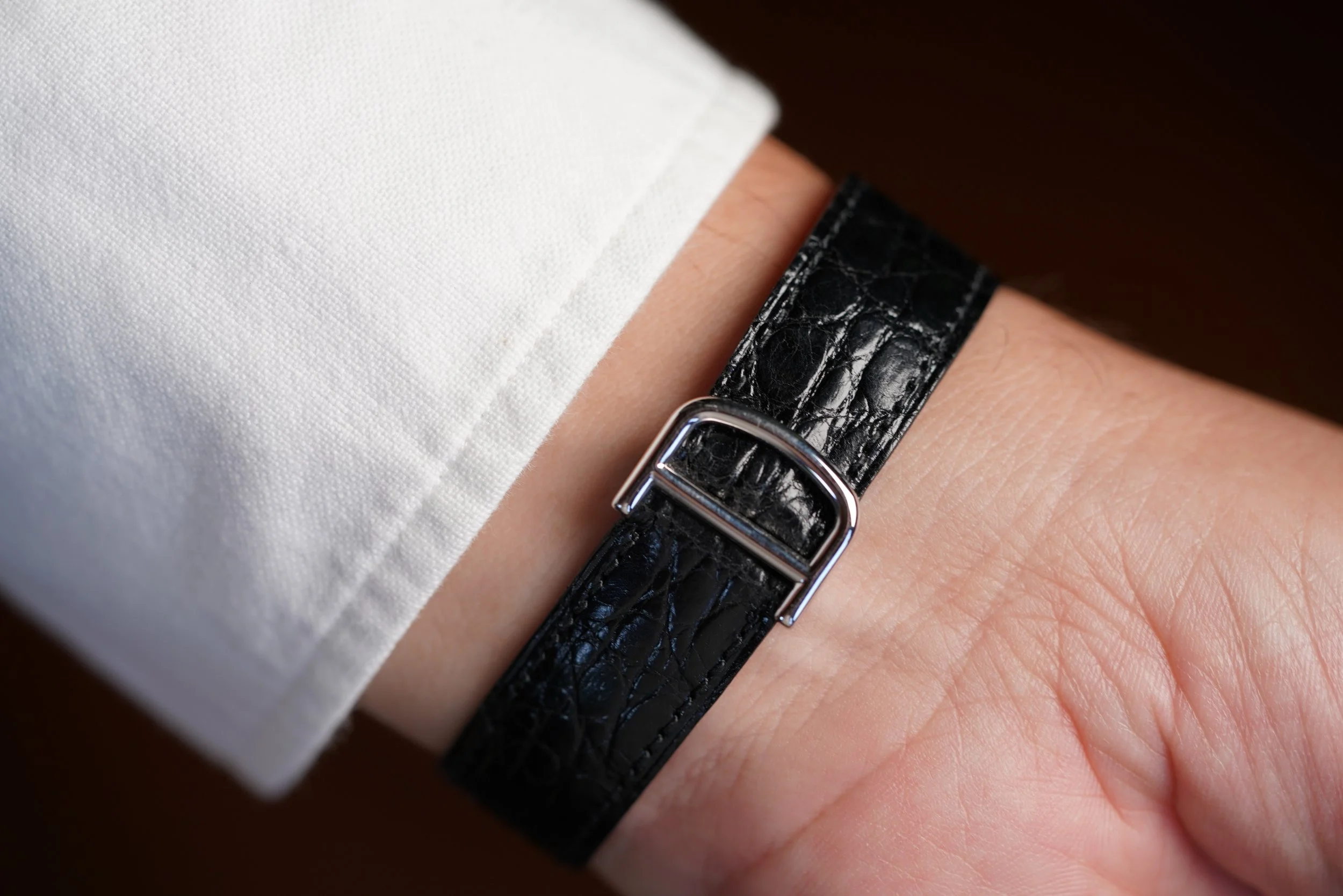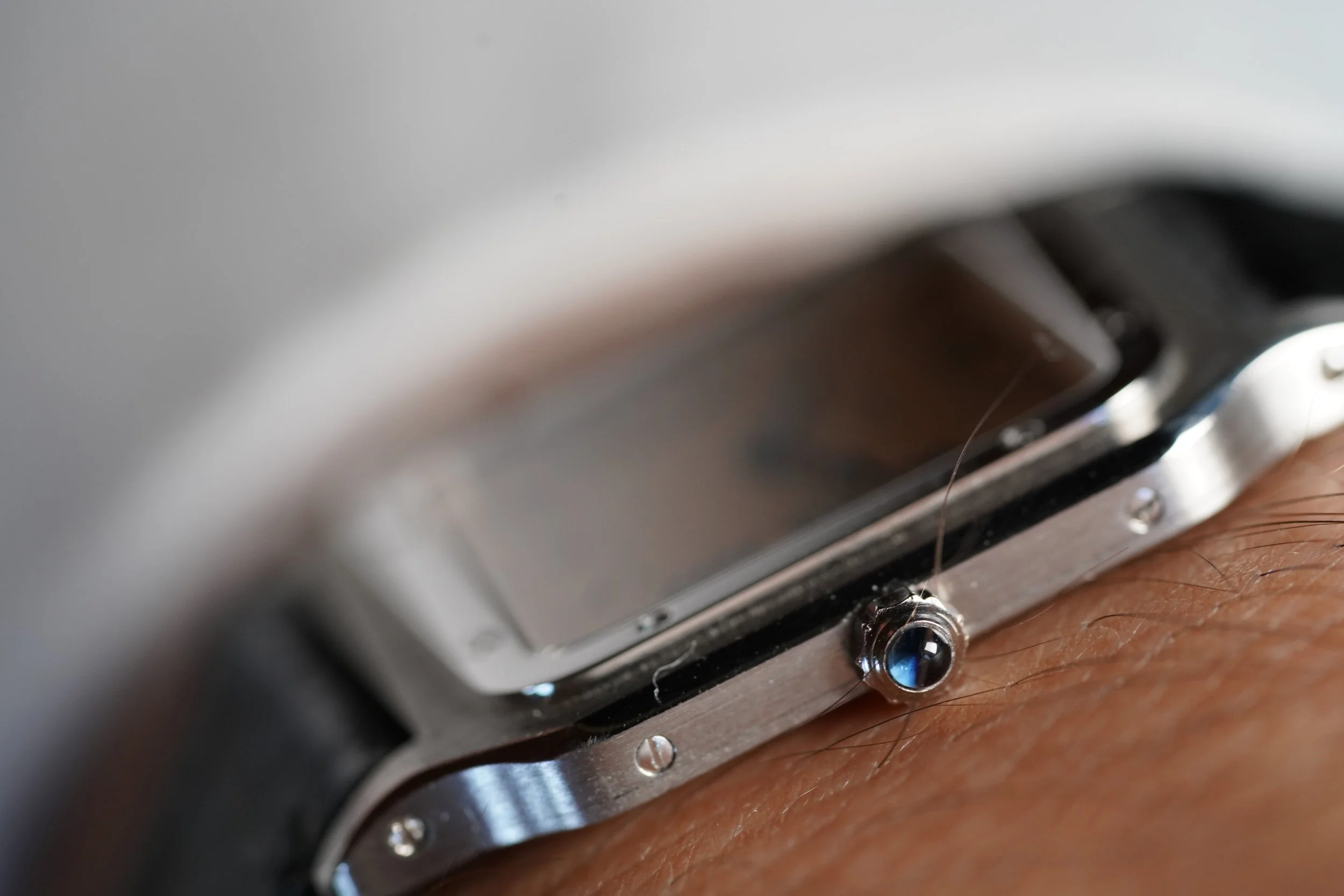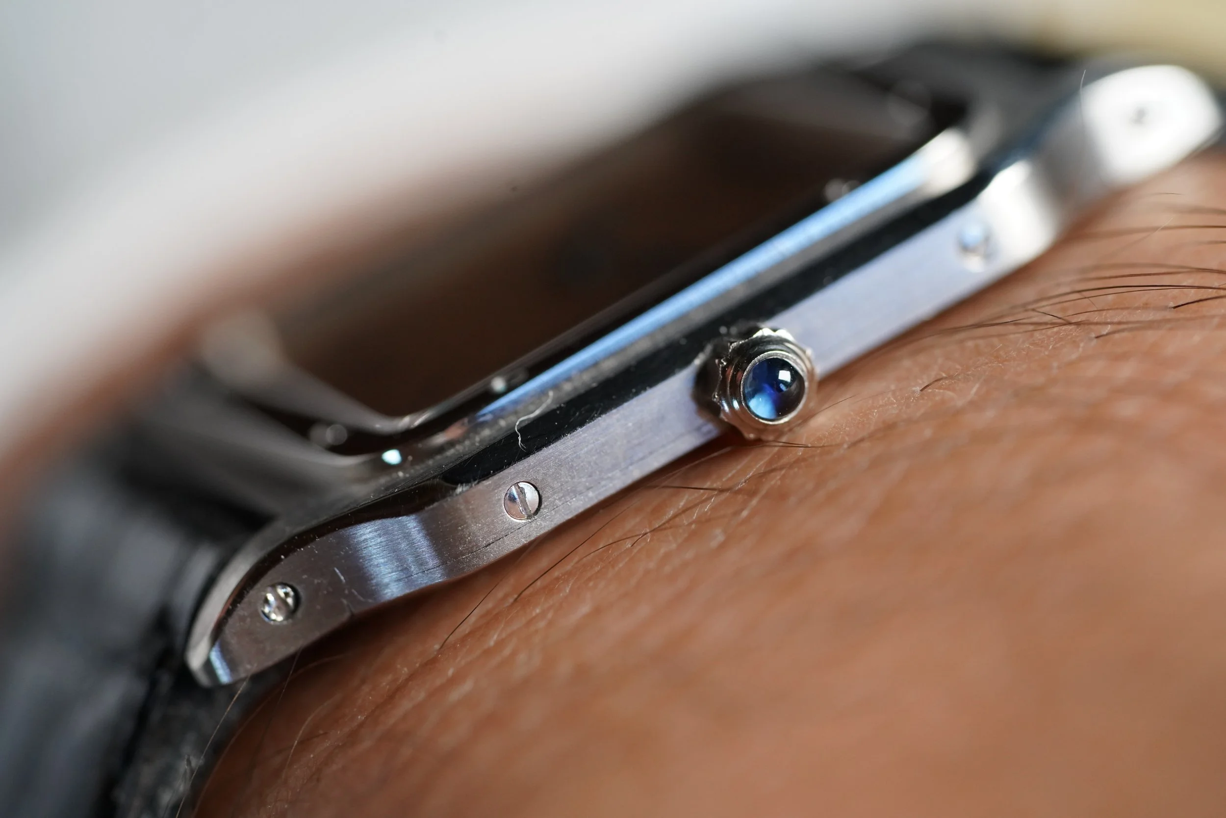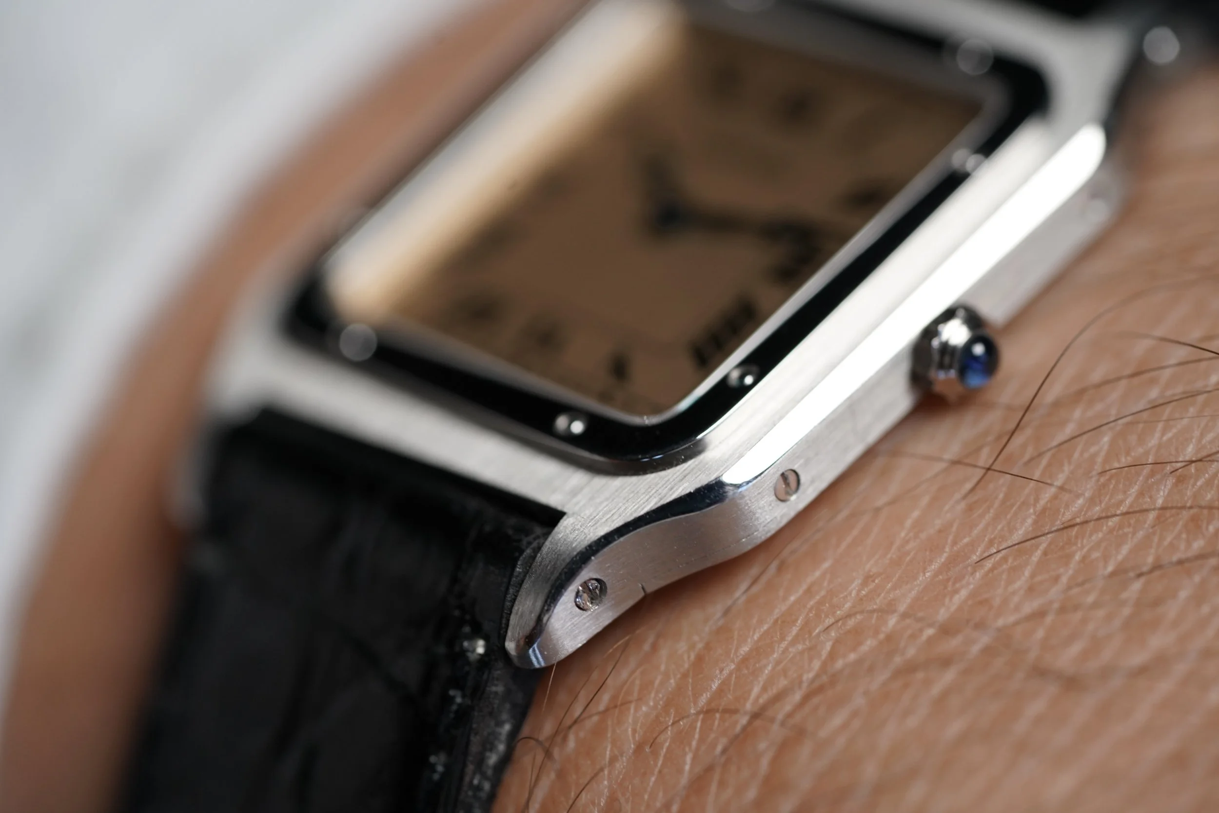 This Cartier Santos is a classic timepiece that represents one of the iconic designs dating back to 1904. This example is a limited edition with salmon dial and Breguet hands. It is a limited example of 90. The platinum case appears to be unpolished. The watch is a manual wind movement. It measures 27mm in diameter by 36mm in length.