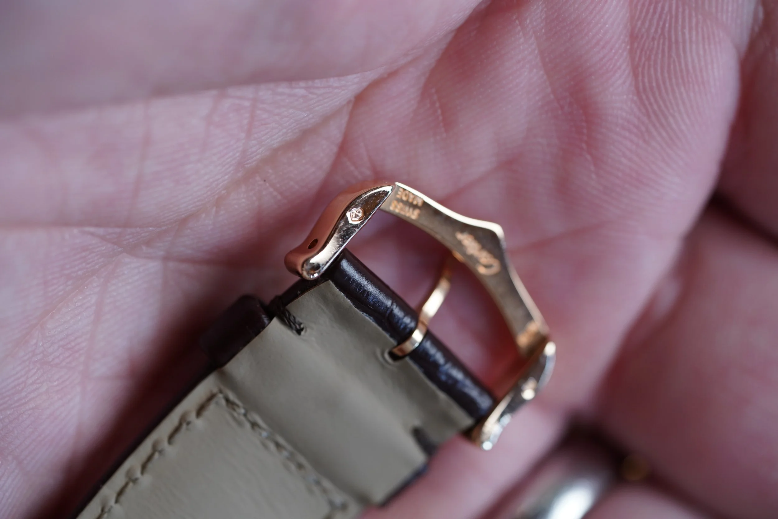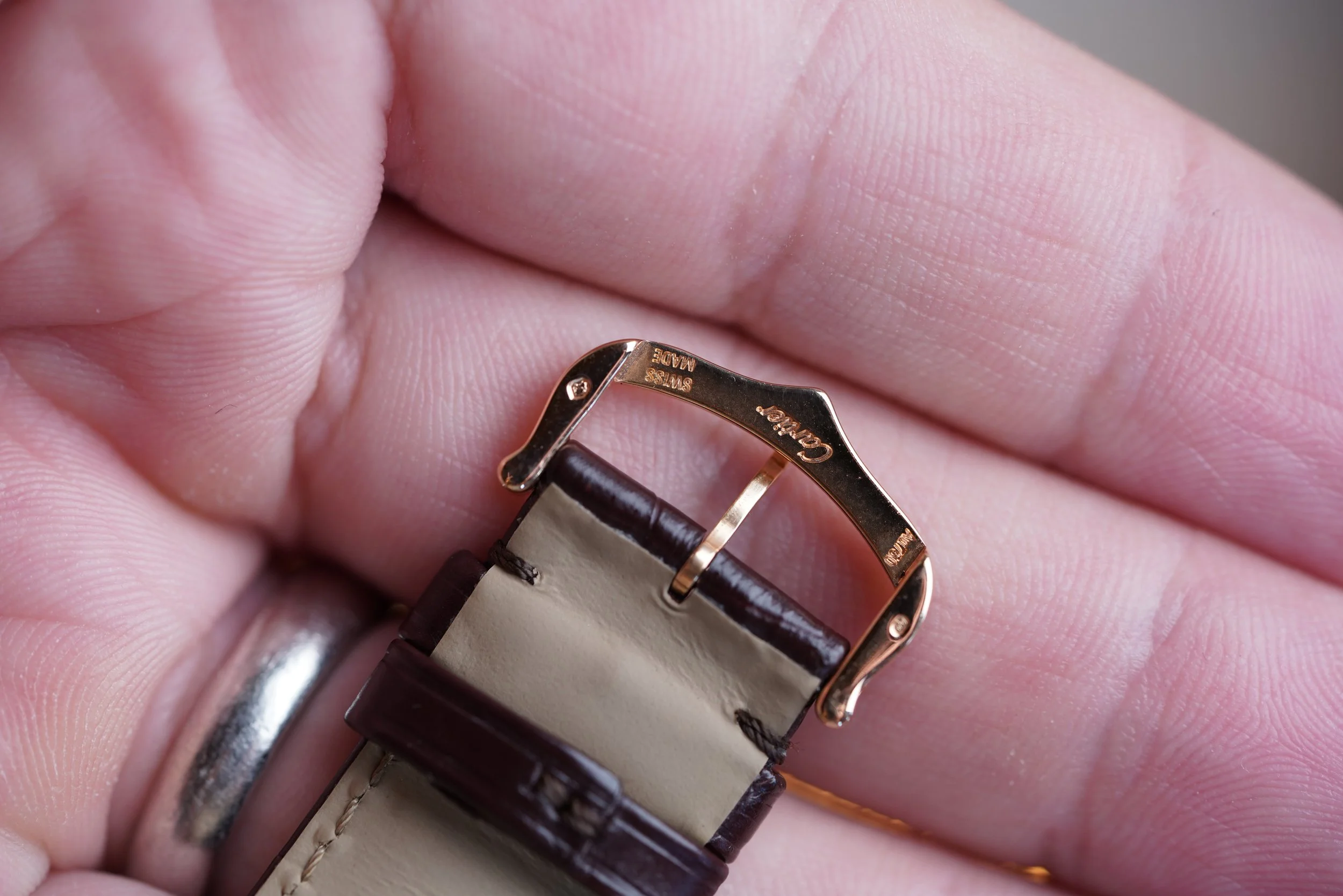 The Americaine reference 2505 is a very elegant watch. This watch is in 18k rose gold and measures approximately 26mm in diameter by 45mm in length. It features an automatic movement with a date. The watch features the classic Cartier blue sword style hands, a painted Roman Numeral dial, and a blue sapphire ‘cabochon’ crown. The rose gold case appears to be unpolished. The watch comes with a brown Cartier leather strap and rose gold buckle.
