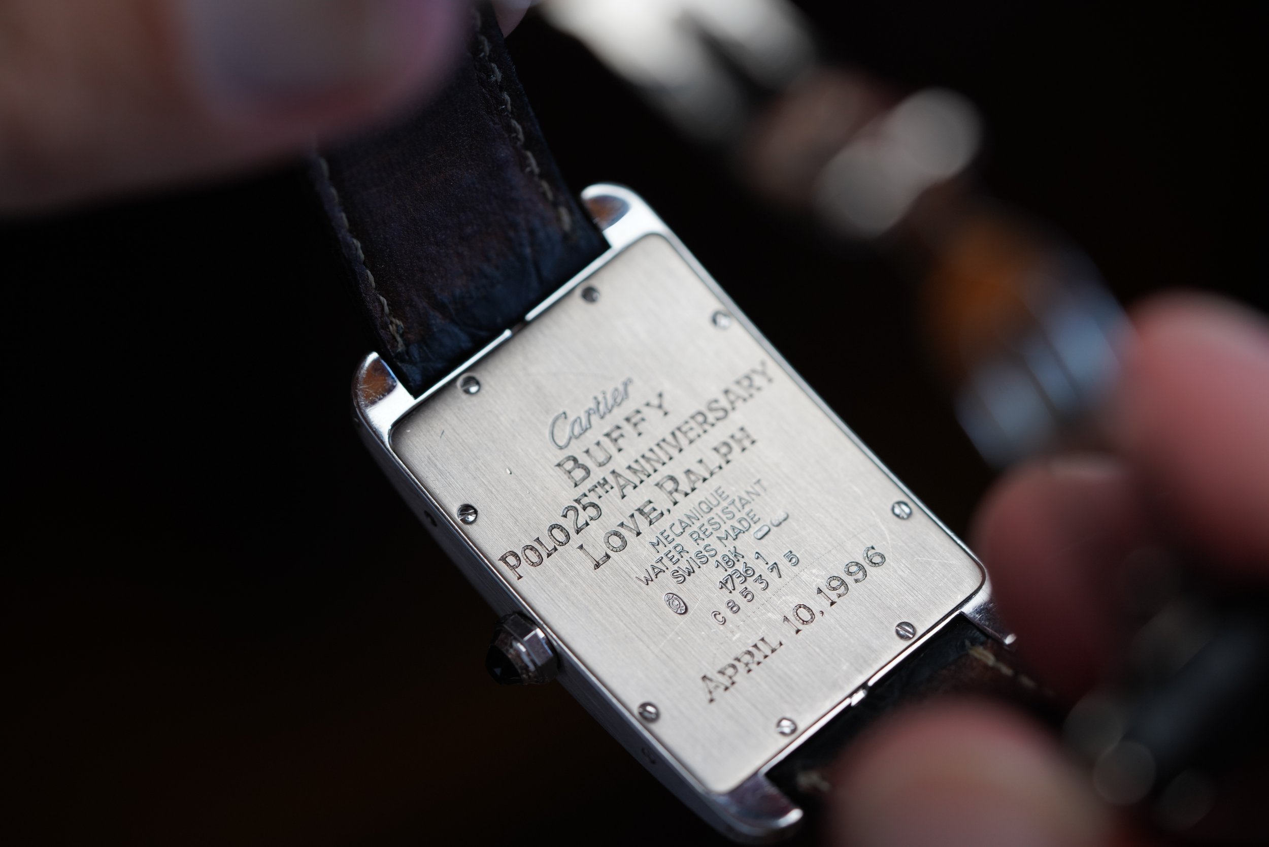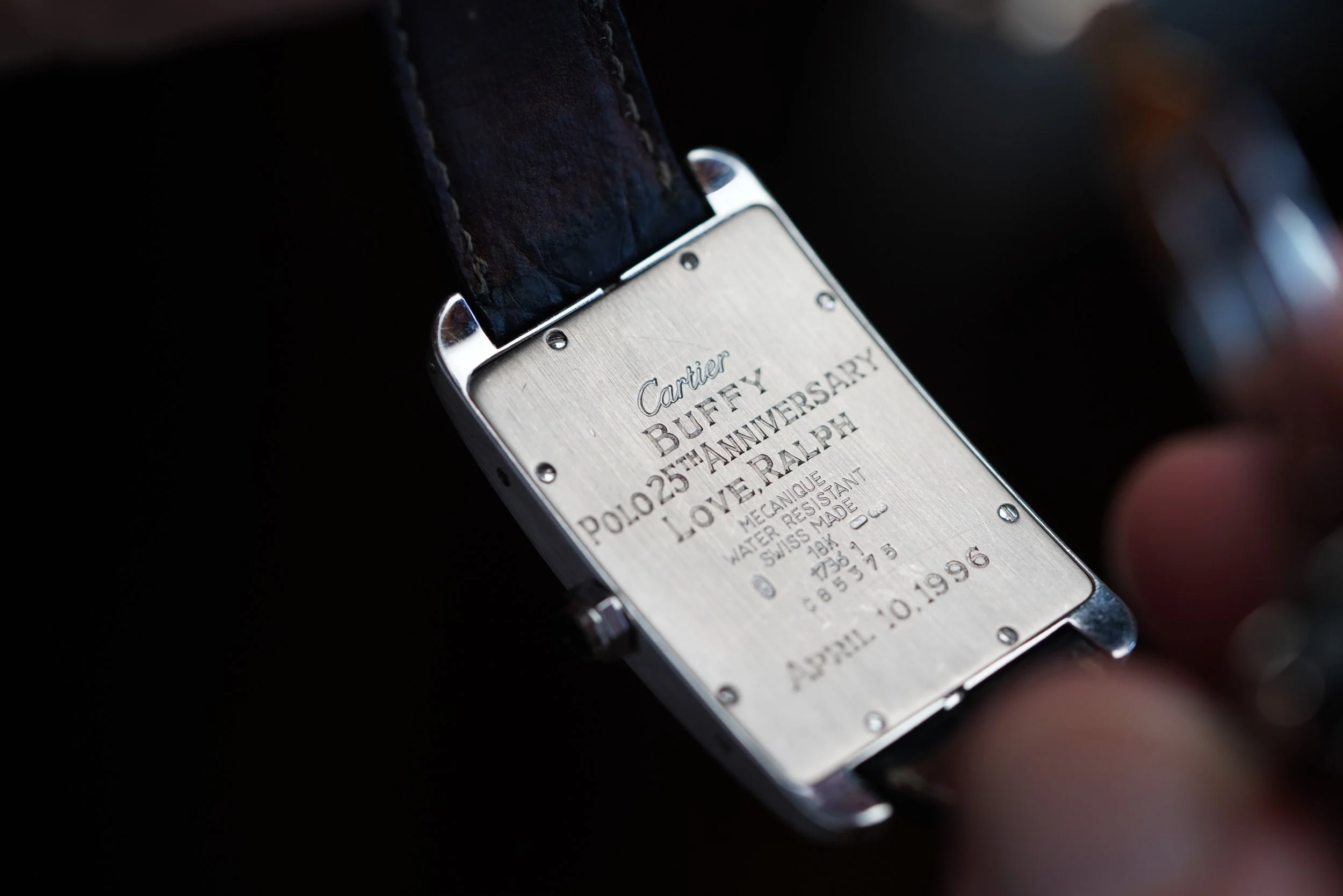 The case is made of 18k white gold and features the engraving ‘Buffy Polo 25th Anniversary Love, Ralph April 10, 1996’. This font is incredibly beautiful and done by Cartier.