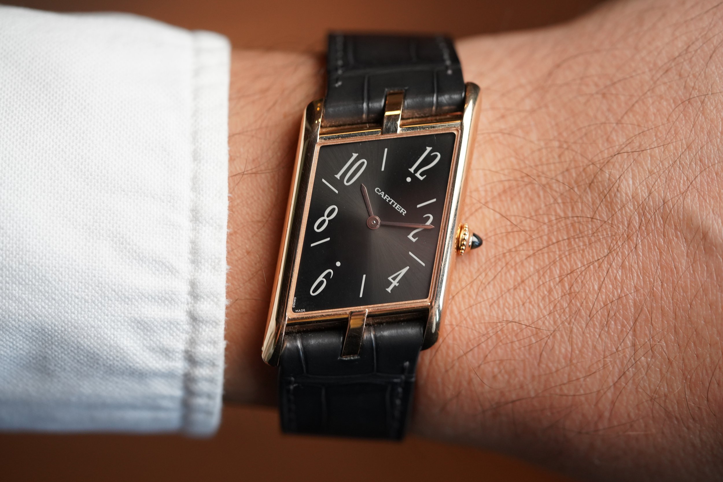 This Cartier Tank Asymétrique reference WGTA0043 is an elegant time only Rose Gold watch. The watch features the iconic diagonal case and dial design. It is a limited edition of 100 examples. The case measures approximately 44.5x 26.5mm at the longest points. It features a grey dial with white printed numerals. The watch is manually wound. It comes with a crocodile leather Cartier strap and 18k rose gold pin buckle. The watch was introduced in 2020. This example was sold in 2020.