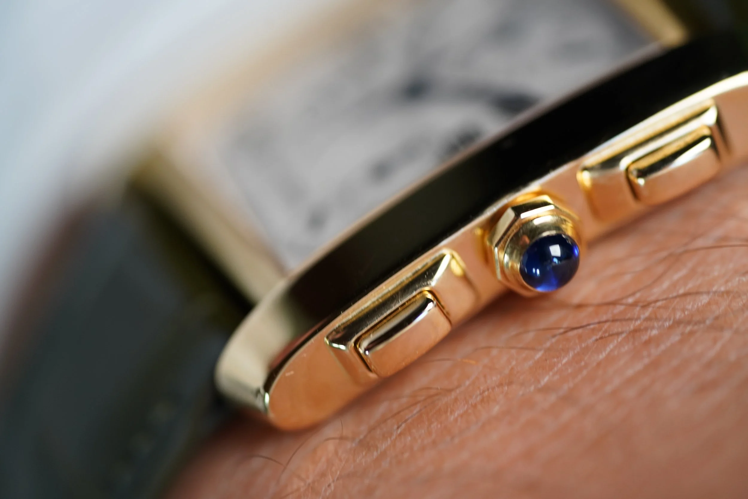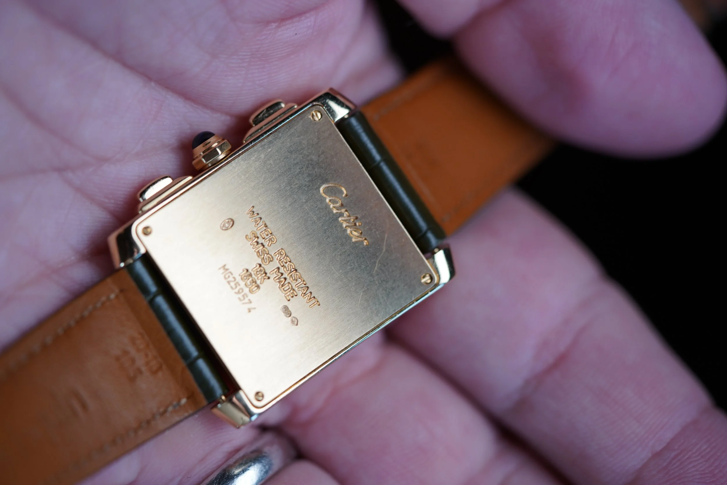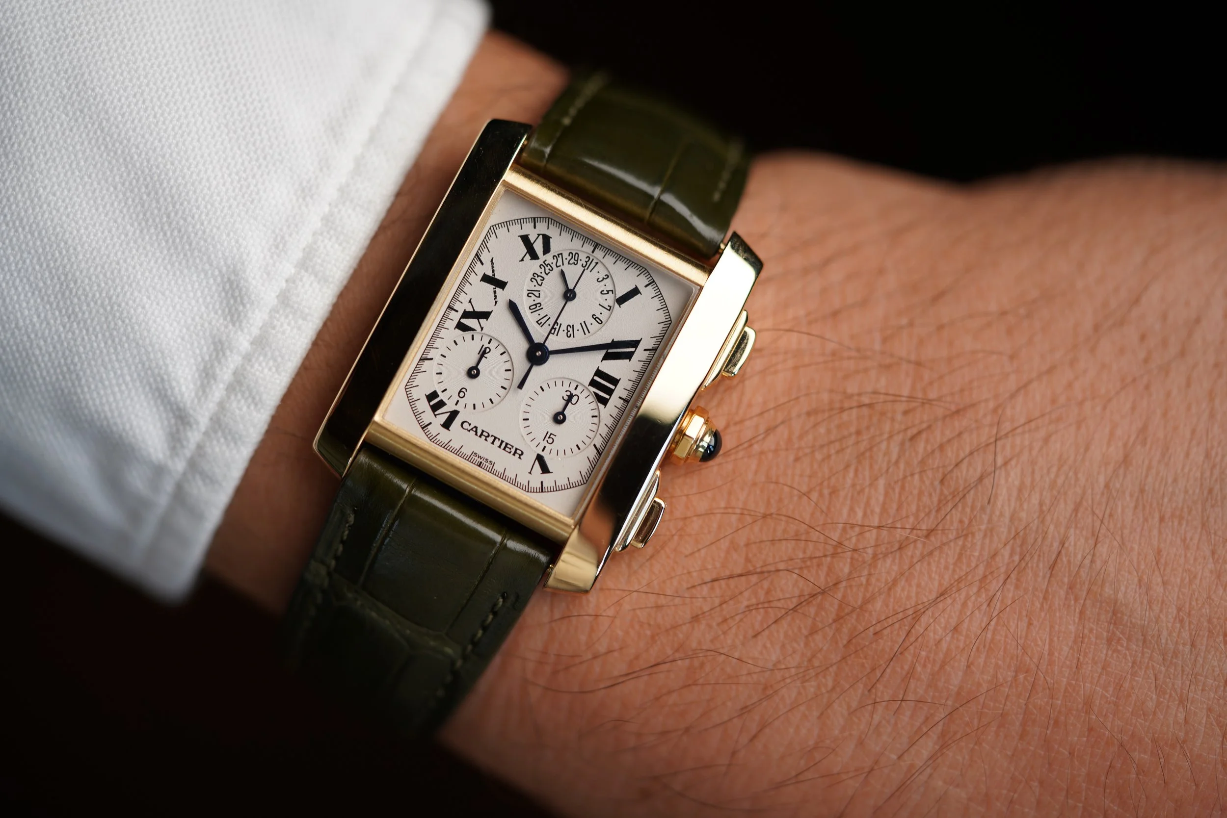This Cartier Tank Francaise is a beautiful dress watch with a date and chronograph complication. The 18k yellow gold case appears to be unpolished. It is powered by a quartz movement. The watch measures 28mm in diameter by 36mm in length. We do not know the date of production but it was sold in 1997 according to the papers.