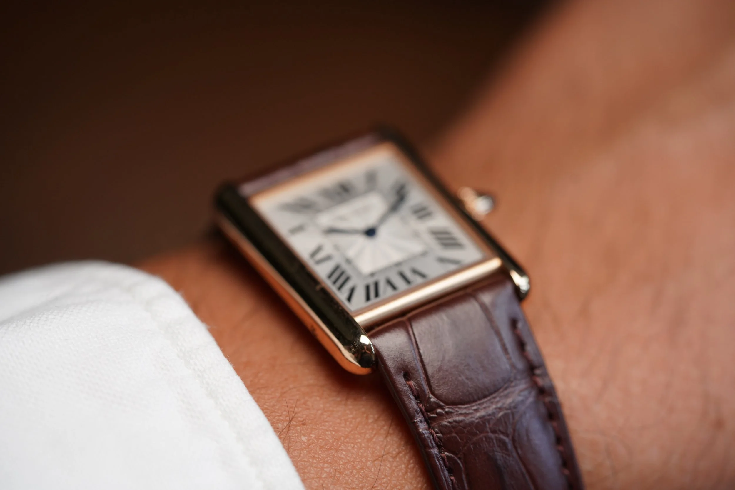 The Cartier Tank Louis is among the most prestigious of the Tank collection. This watch is in 18k rose gold and measures 25.5mm in diameter by 33.7mm in length. It features a manual-wound movement. The watch features the classic Cartier blue sword style hands and Roman numeral hour markers.