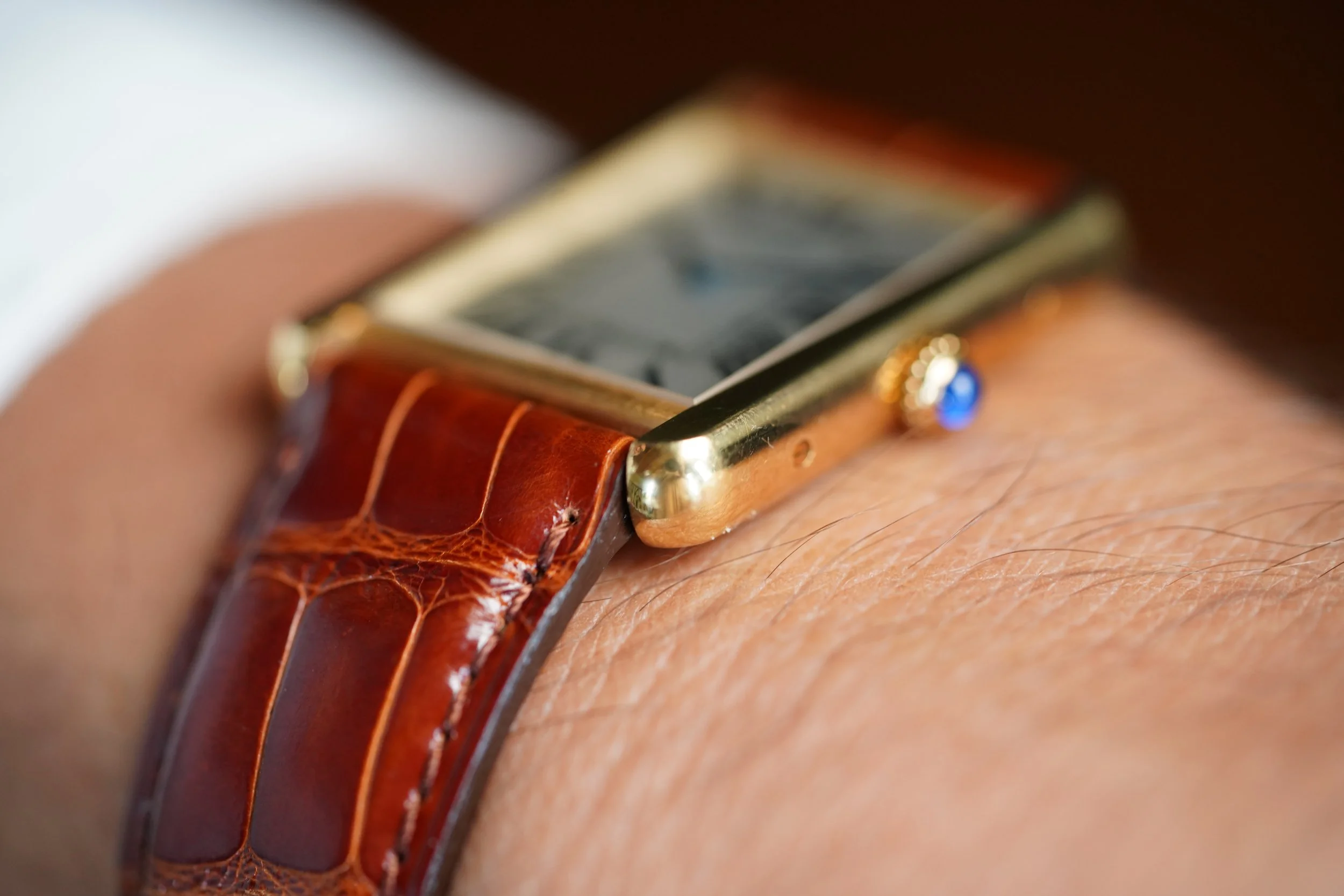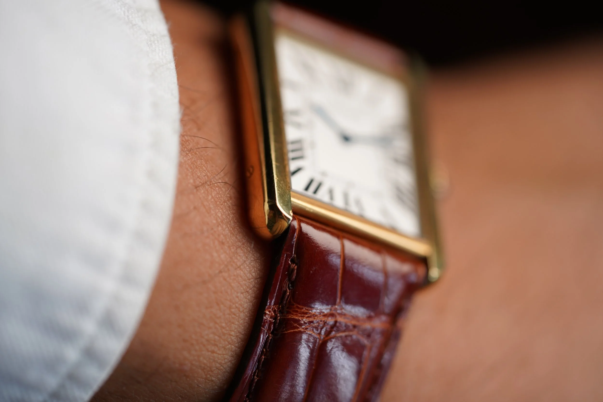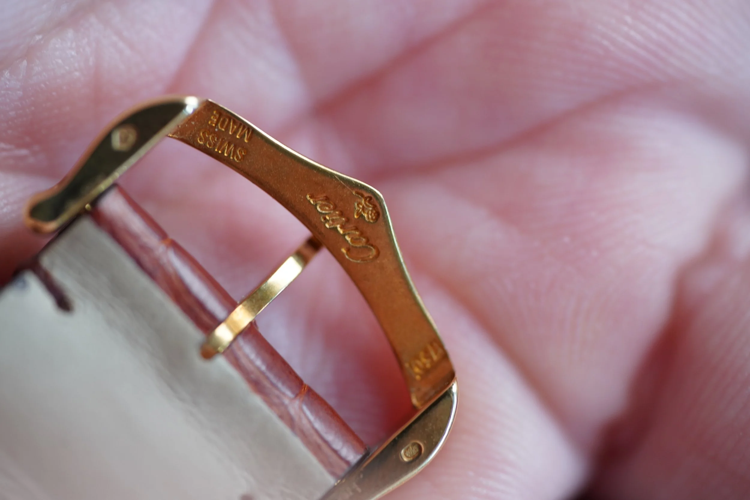 This is an elegant Cartier tank in 18k yellow gold. The case measures 27.5x35mm. It features a Cartier classic Roman numerals dial with blue sword hands. The case appears to be unpolished. The watch comes with a Cartier brown leather strap and a gold Cartier pin buckle. We do not know the date of production.