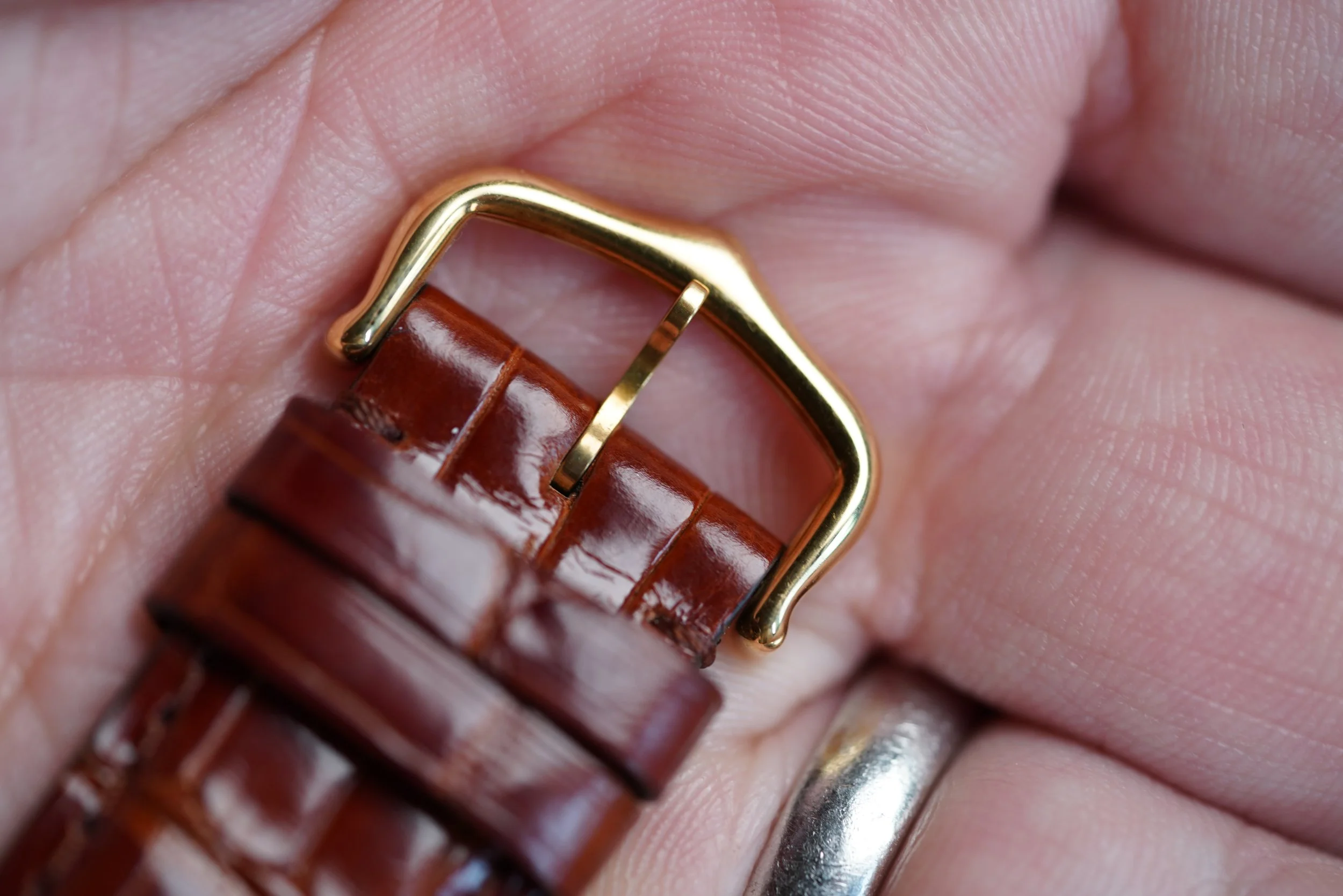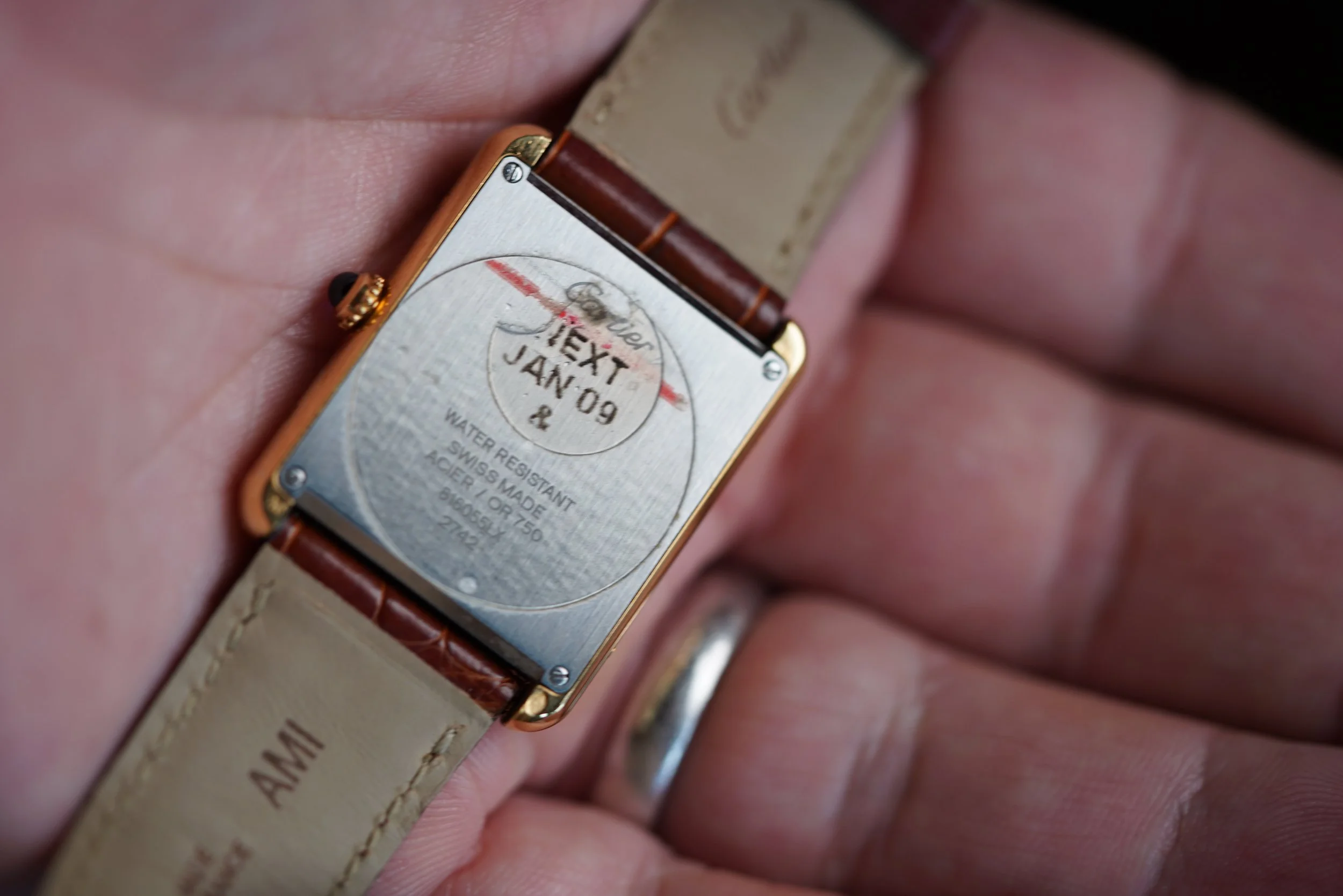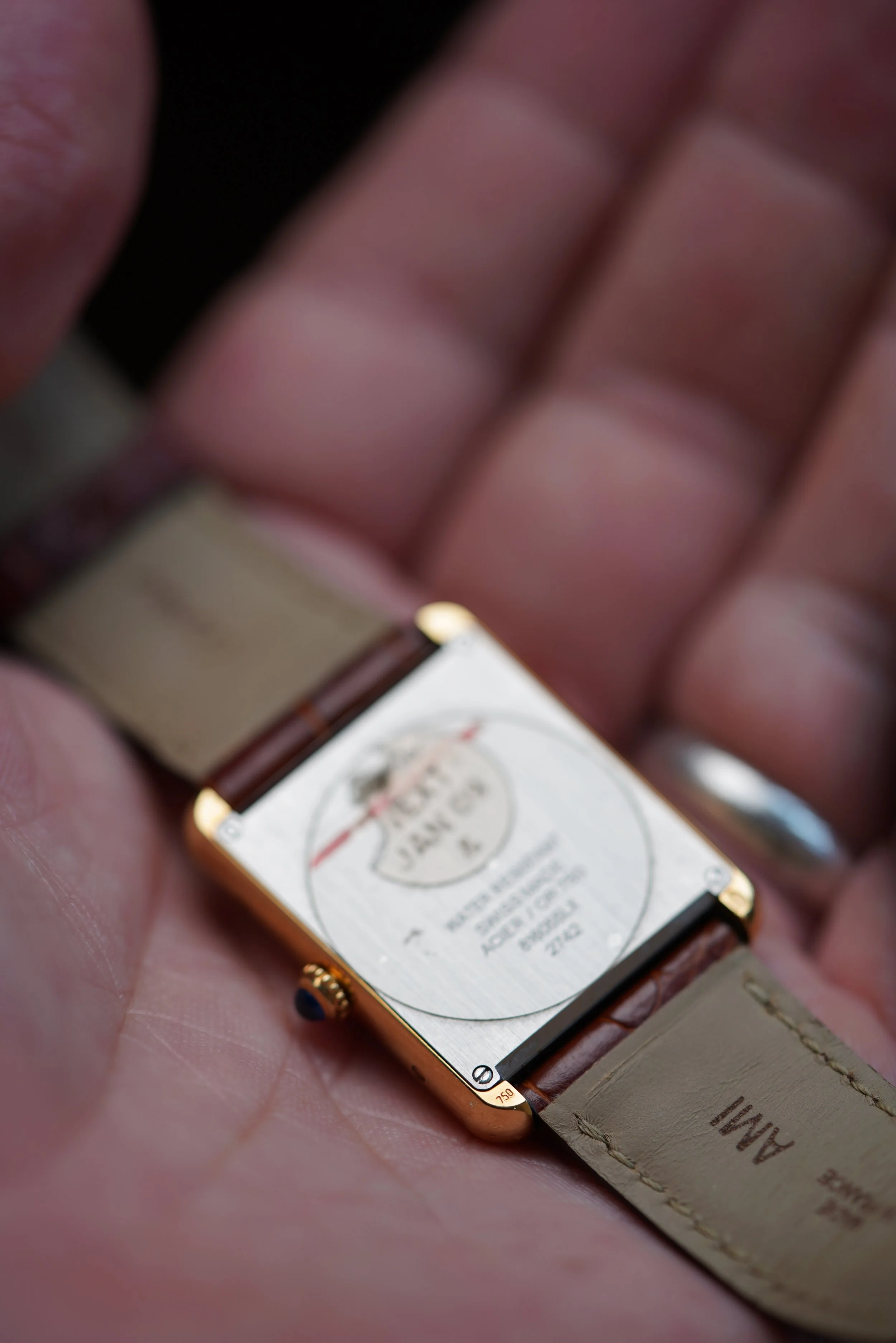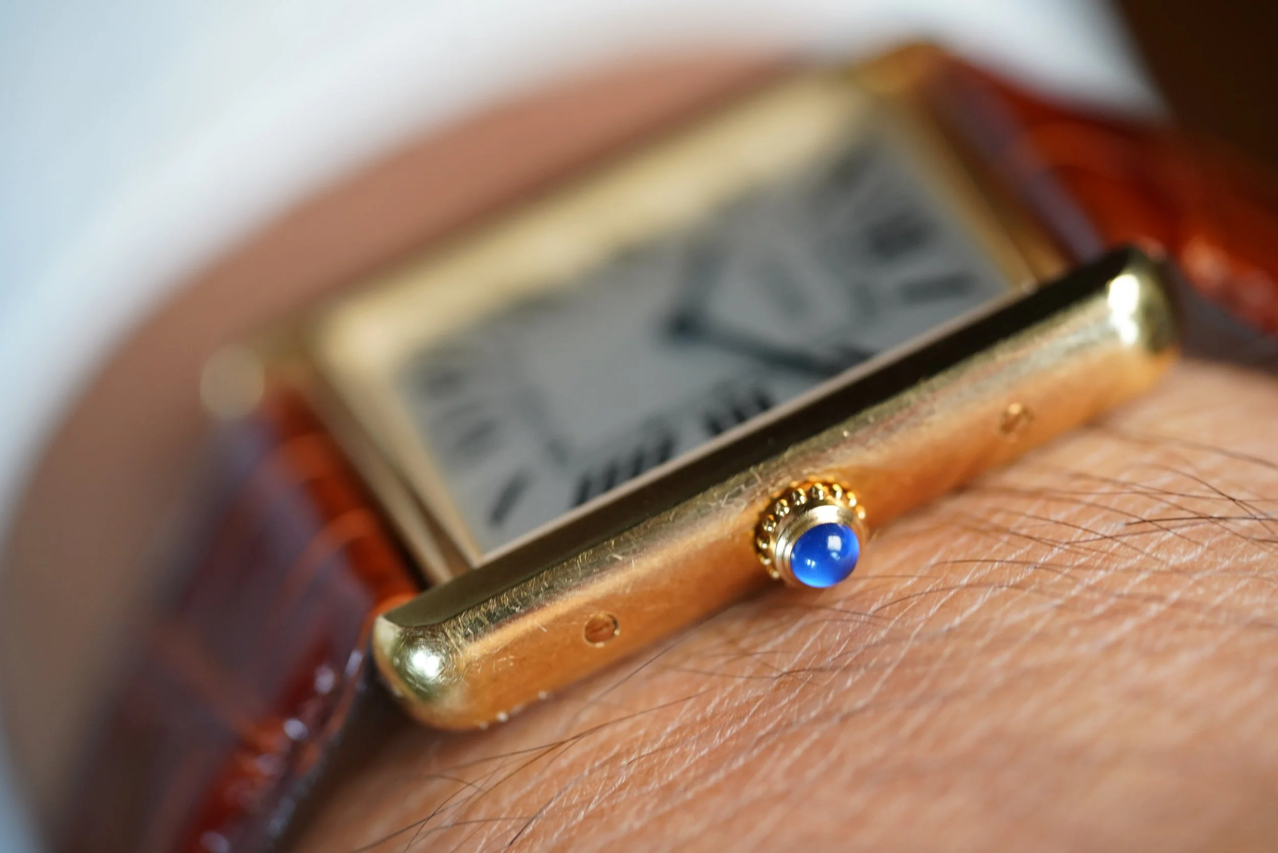 This is an elegant Cartier tank in 18k yellow gold. The case measures 27.5x35mm. It features a Cartier classic Roman numerals dial with blue sword hands. The case appears to be unpolished. The watch comes with a Cartier brown leather strap and a gold Cartier pin buckle. We do not know the date of production.