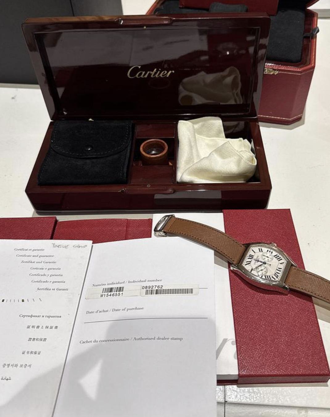 The watch comes as a “full set” with the original box and papers. We do not know the service history, but it is running well. The watch is a Cartier Collection Privée Cartier Paris watch. (CPCP).
