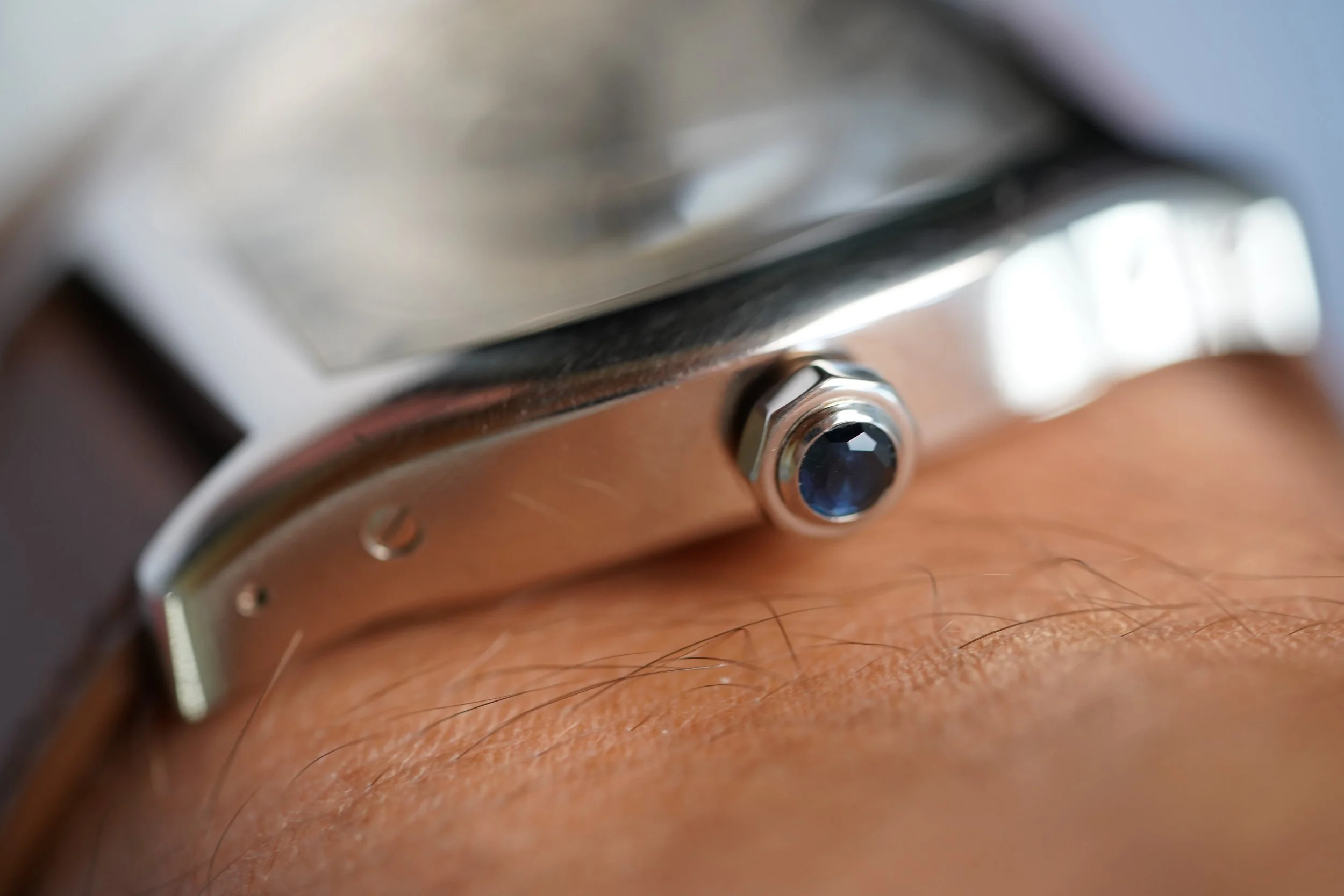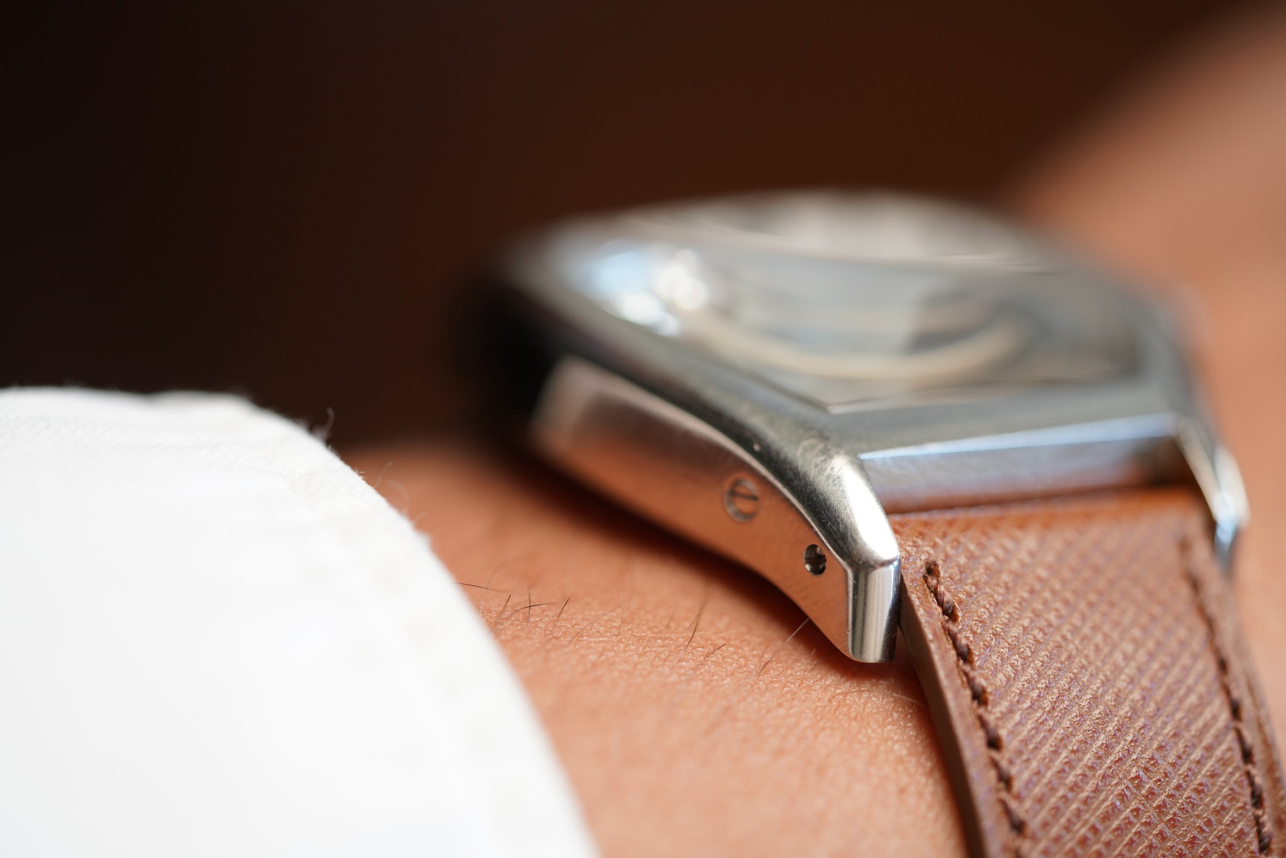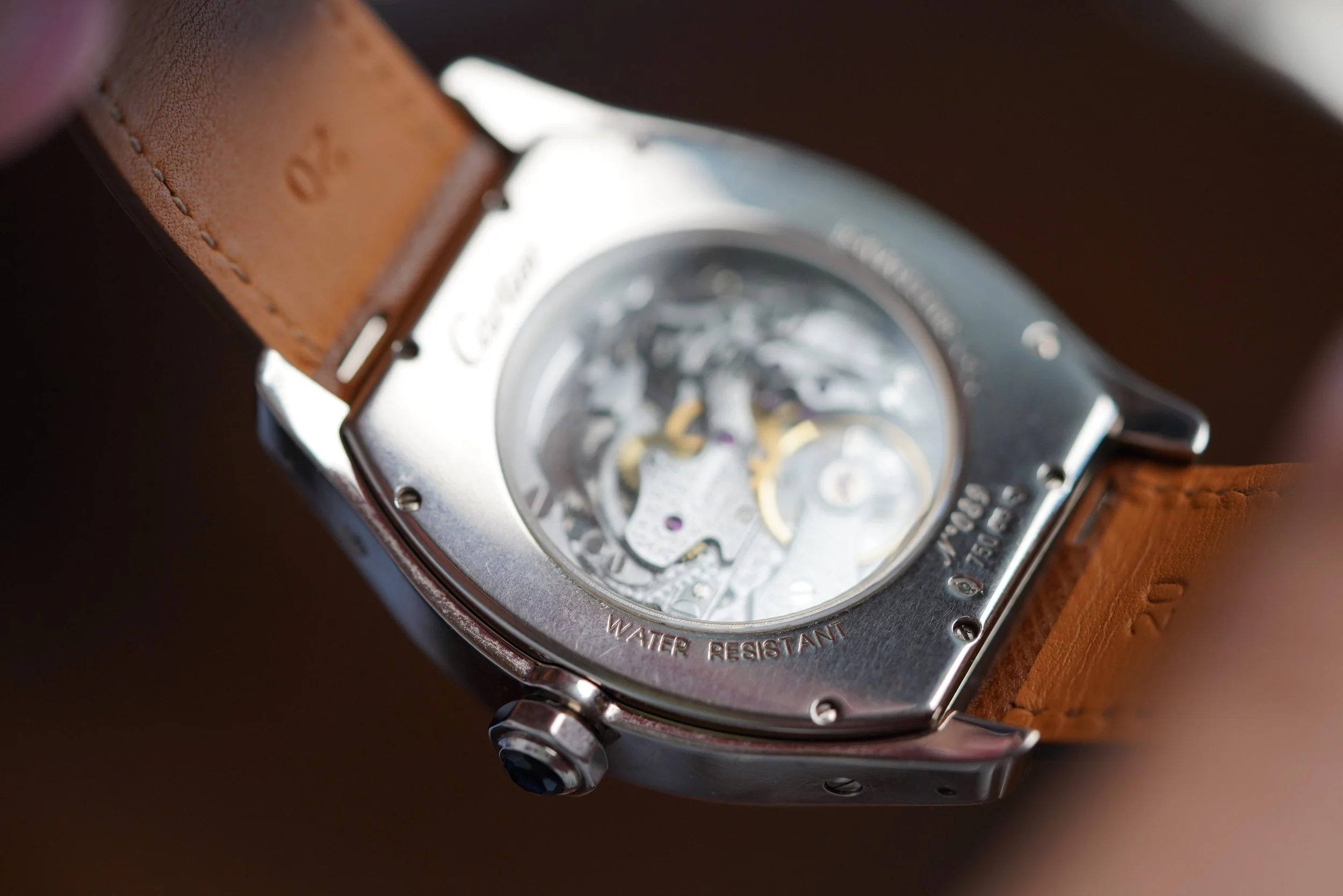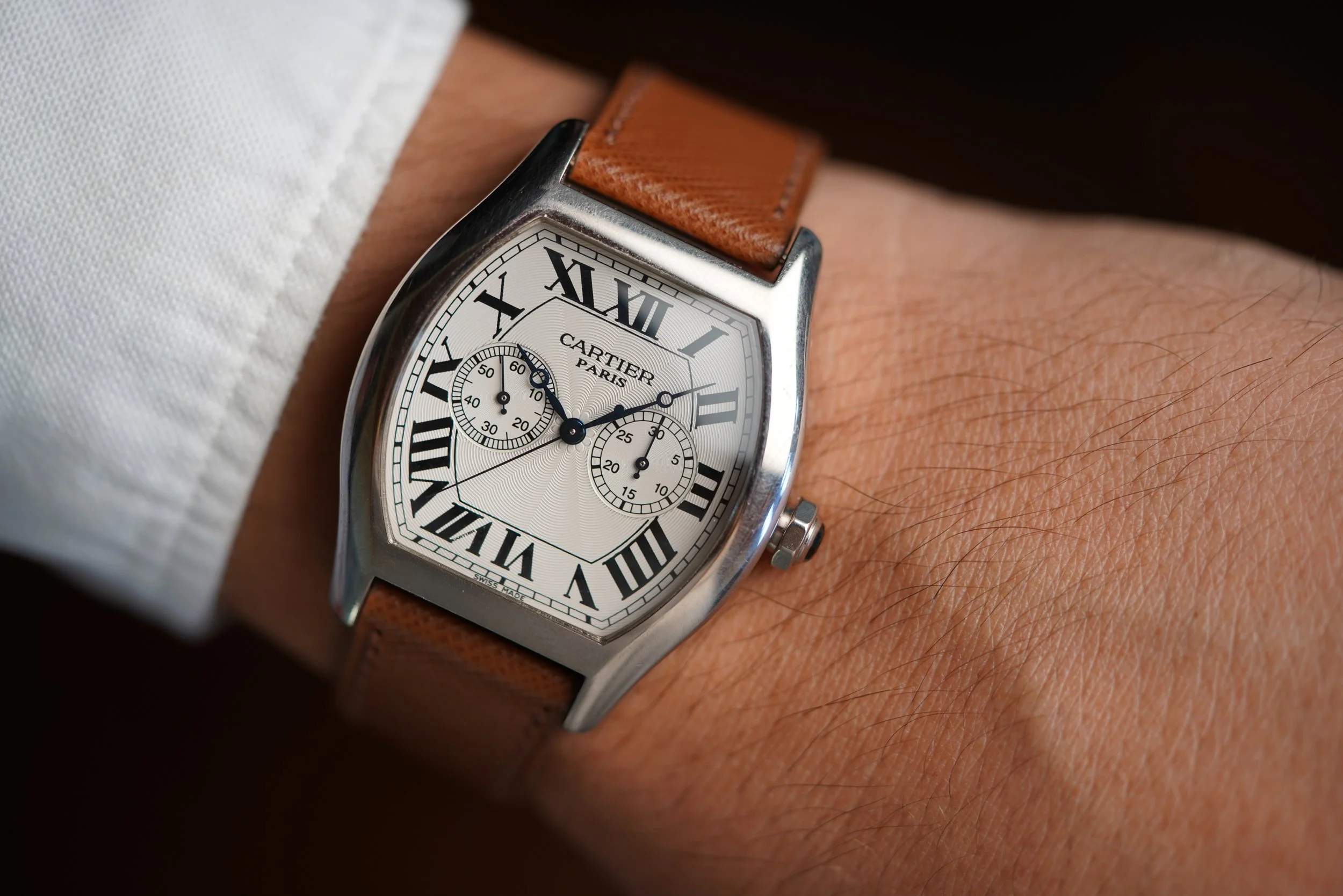 This Cartier Tortue Monopoussoir reference W1546551, 2762 is an elegant chronograph operated by (as the name suggests in French) a singular pusher built into the winding crown. The white gold “tortue” case measures about 38mm in diameter at the widest point. The lug-to-lug is approximately 48mm. The watch features an exhibition caseback and sapphire cabochon crown. The movement was a collaboration between Vianney Halter, Fançois-Paul Journe, and Denis Flageollet!