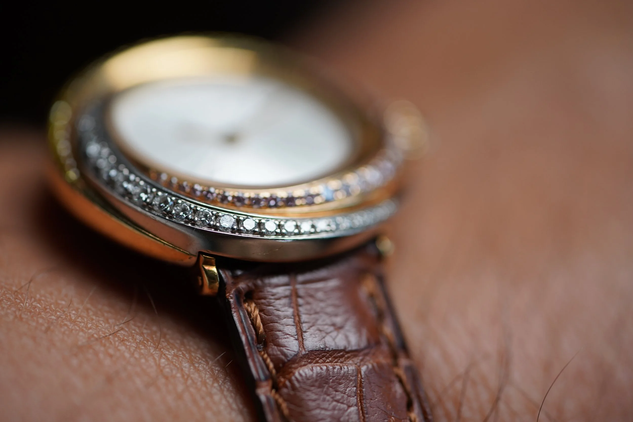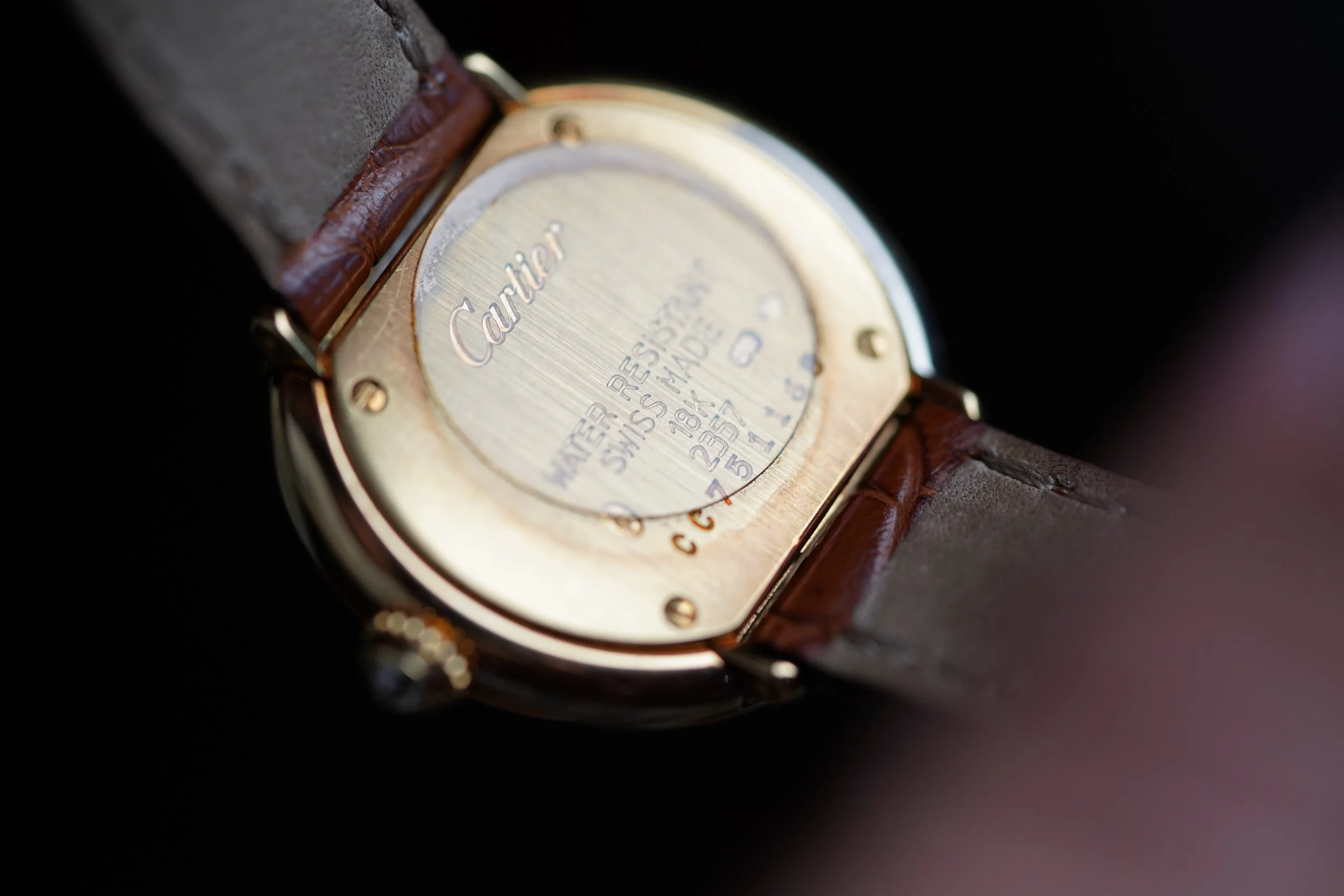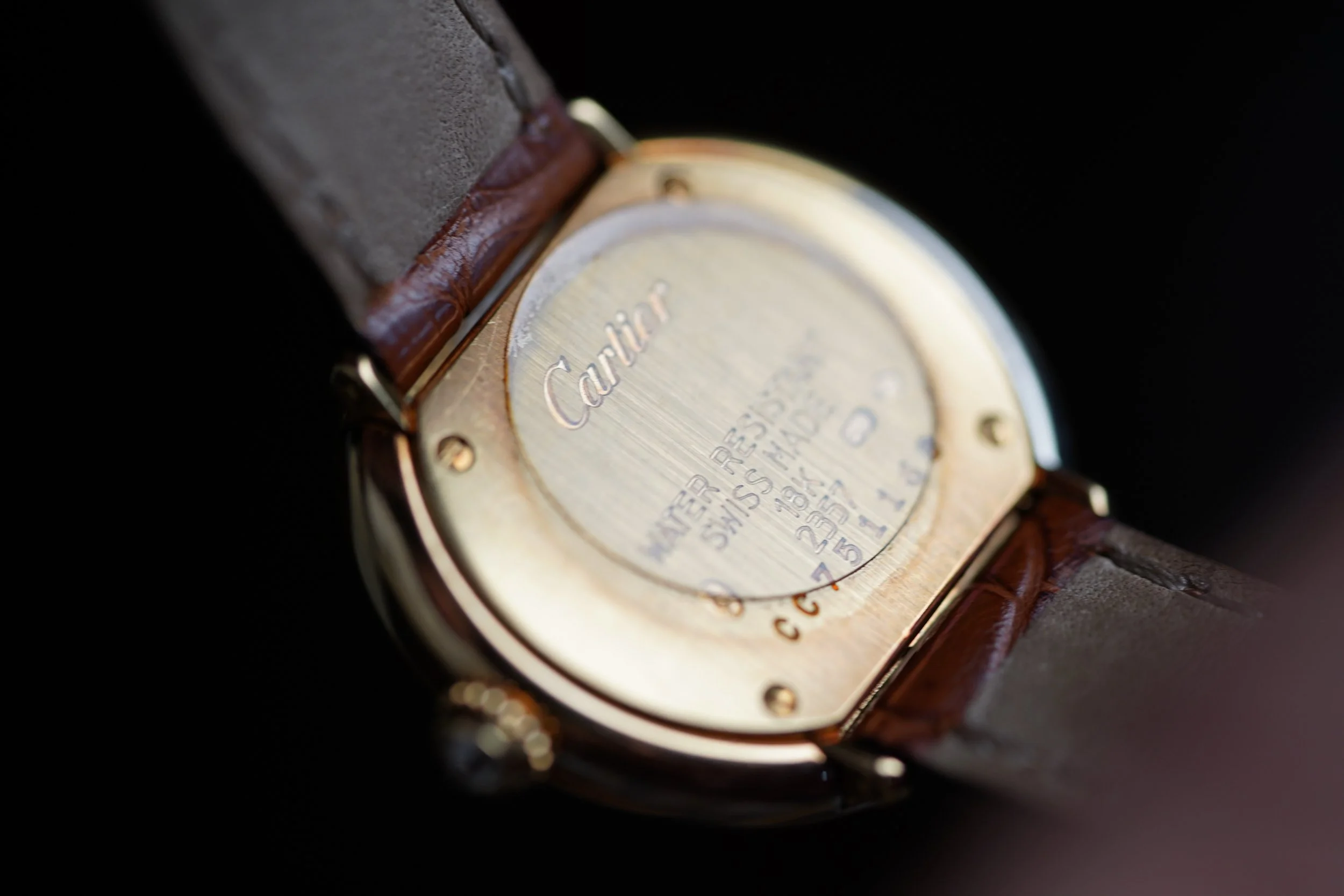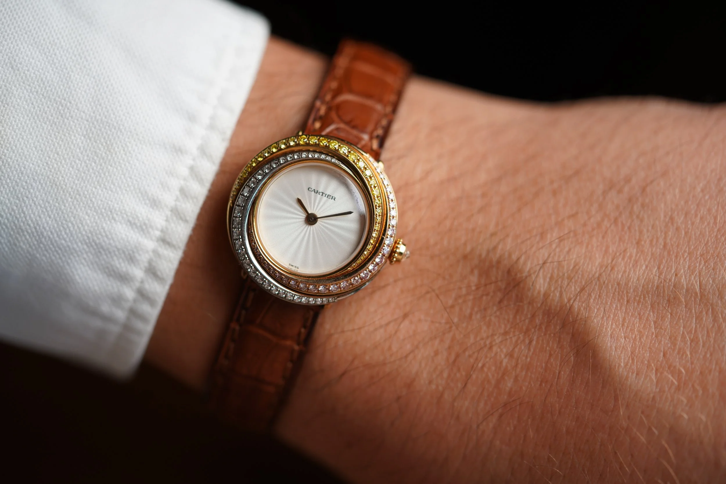 This Cartier wristwatch is a very elegant timepiece. It features the signature Trinity ring design with diamond set bezel in rose gold, white gold and yellow gold. It measures approximately 27mm in diameter. It is paired on a deployant Cartier buckle and leather strap. The case is unpolished.