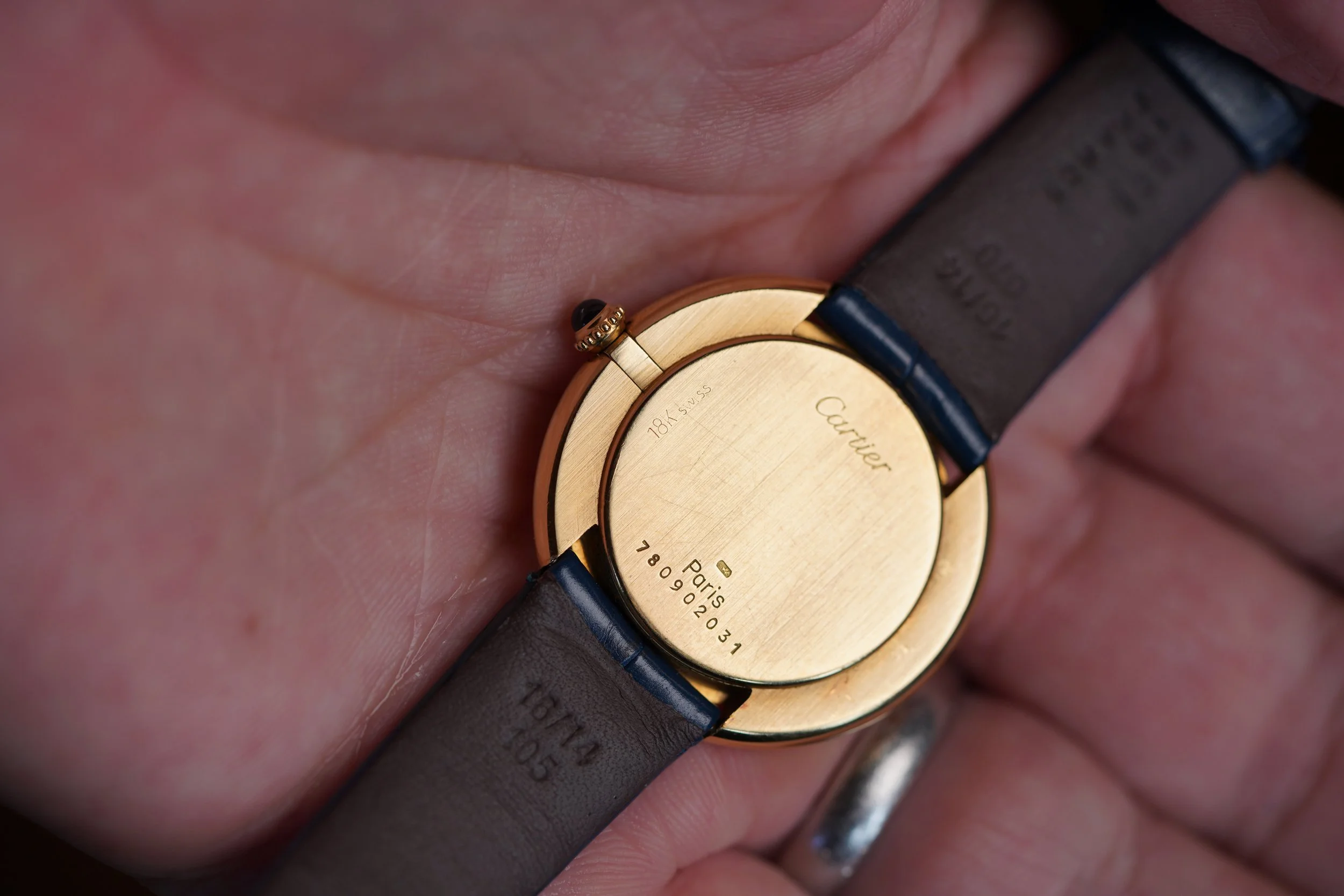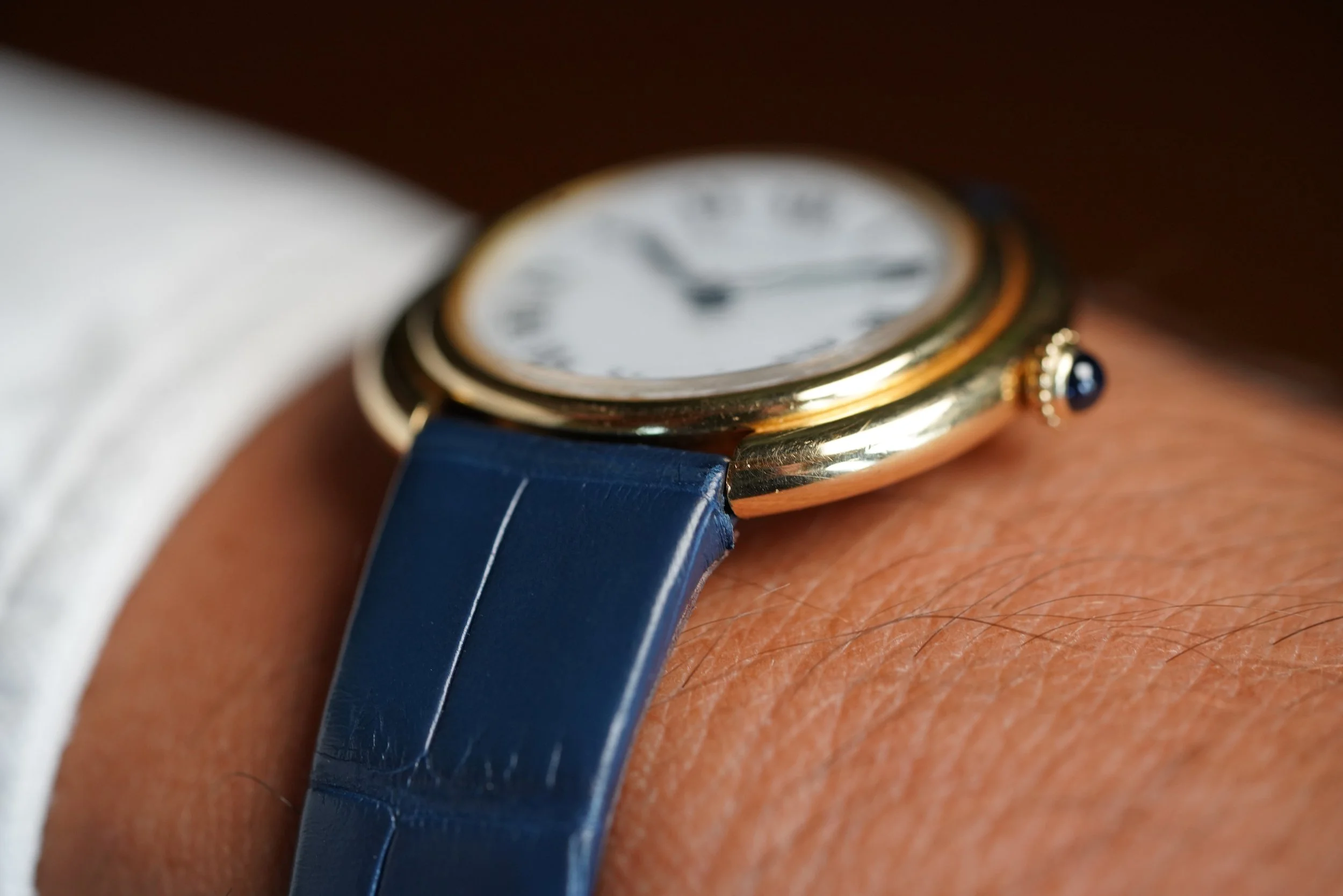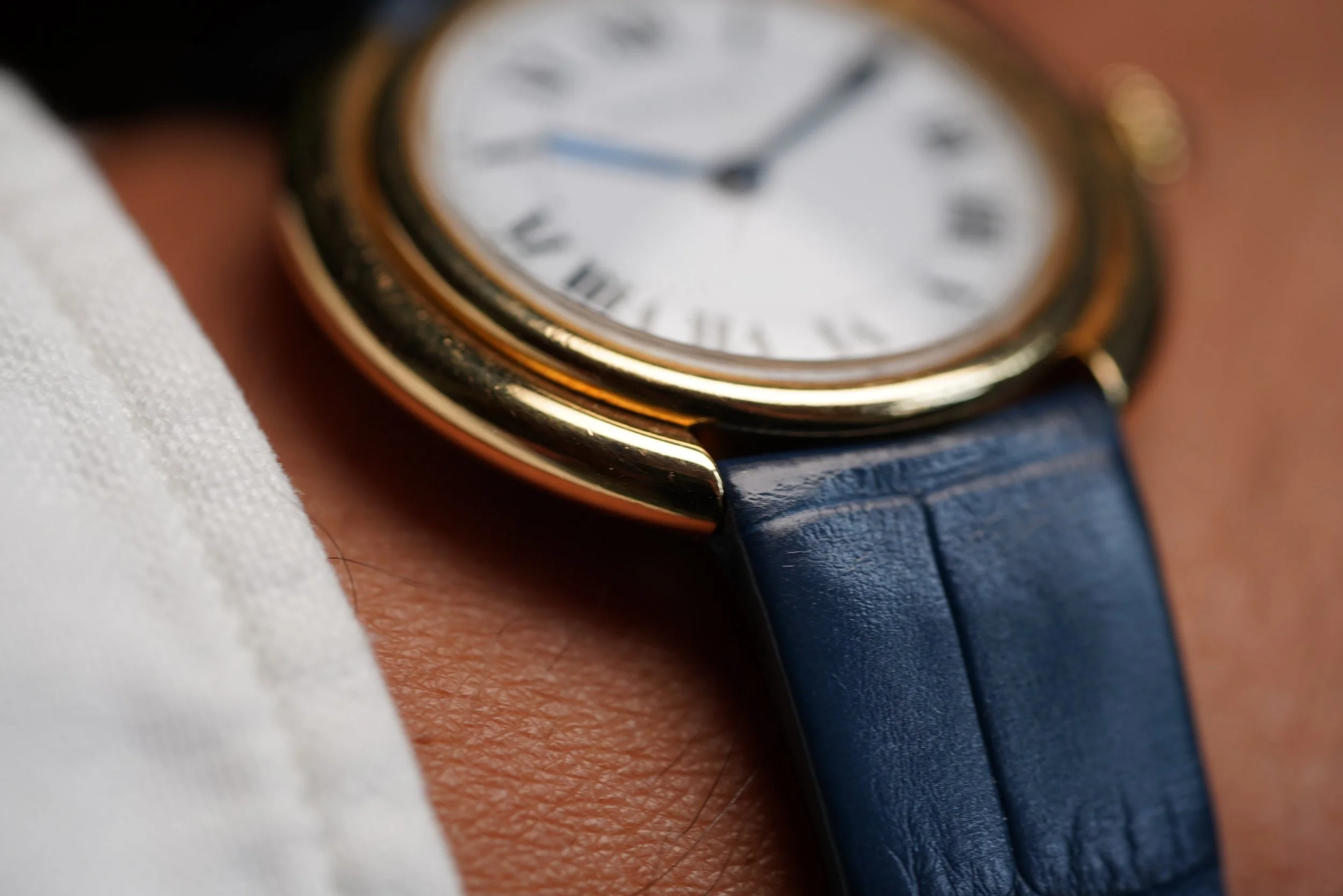 The Cartier Vendome is a super cool vintage model. The case is 33mm in diameter. The 18k yellow gold case appears to be unpolished. It features a manually wound movement. The watch dates to the 1980s. It is paired on a beautiful Camille Fournet blue strap. It has a gold plated anonymous buckle. The dial is in great condition. It comes from a great collector.