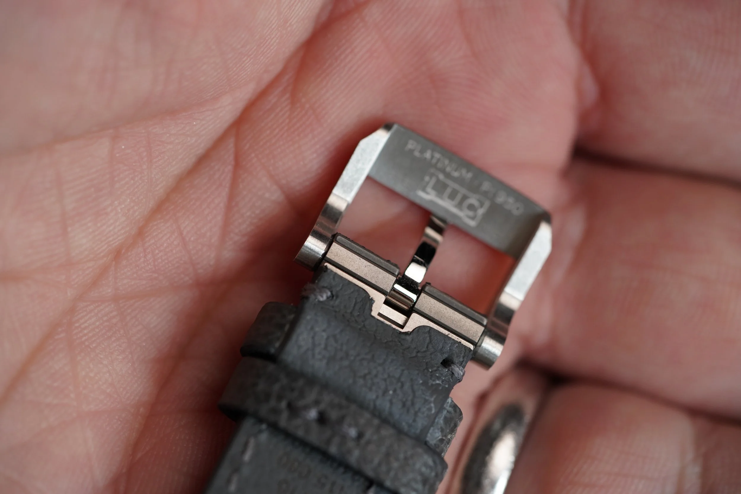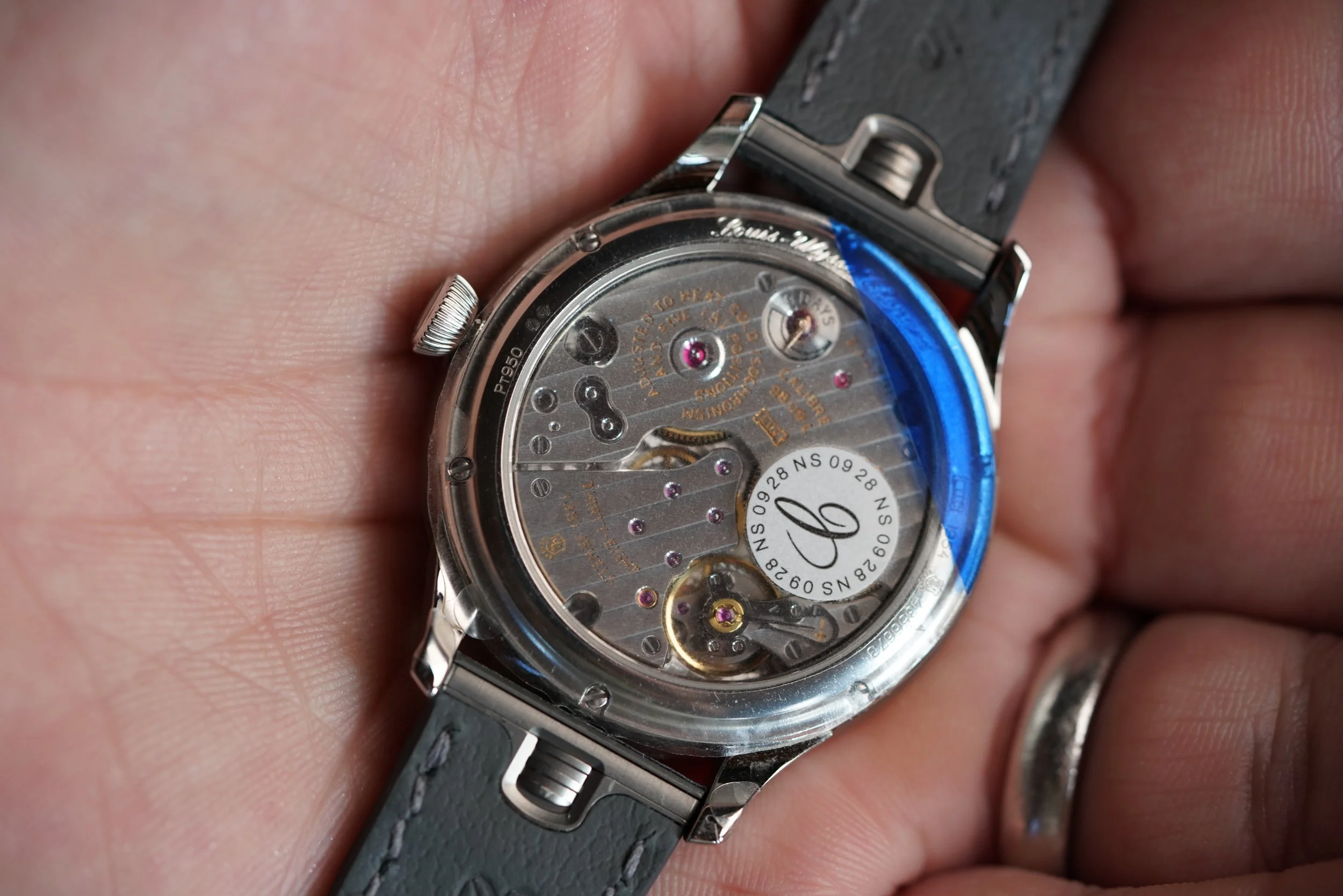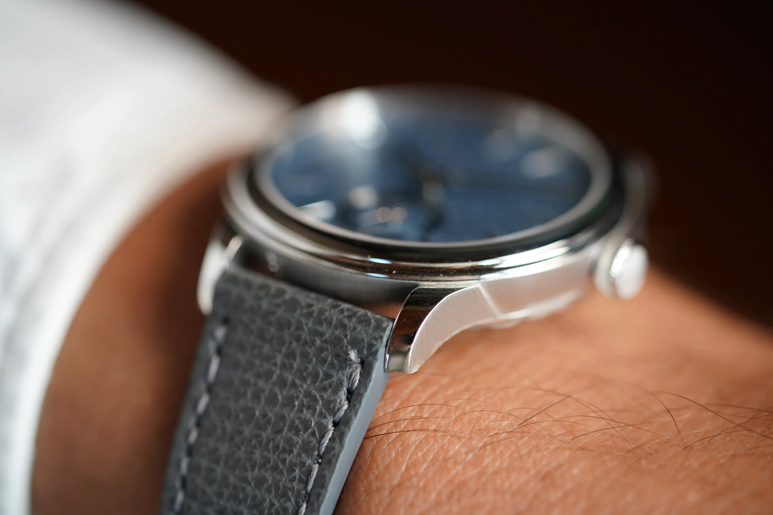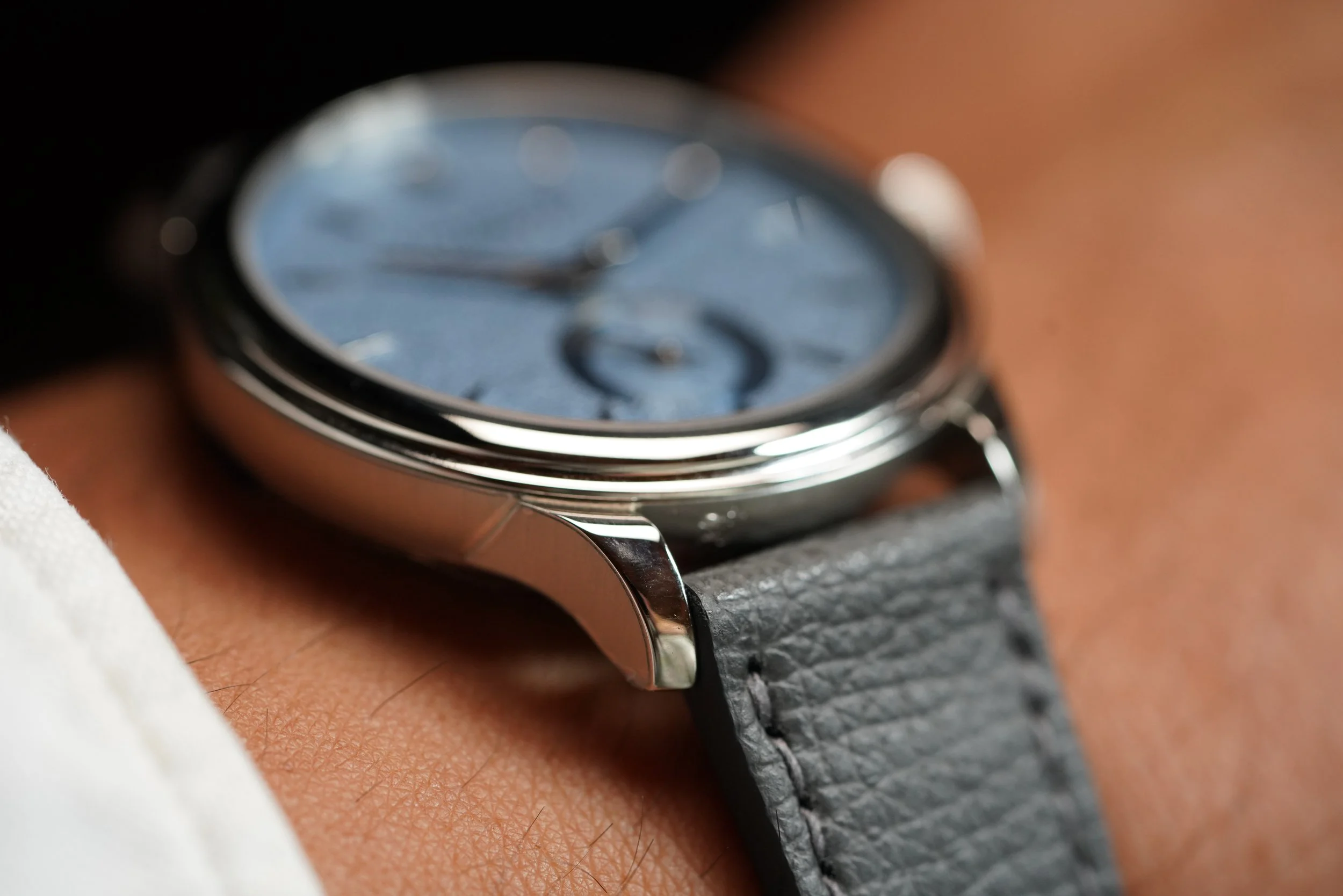 The watch measures at 39mm (approximately 46mm lug to lug) and features a stunning light blue “frosted” Guilloché dial. There is a sub-register that displays small seconds as well as the date. The watch features a four-barrel nine day power reserve COSC-certified movement. The platinum case bears a small bee hallmark between the bottom lugs.