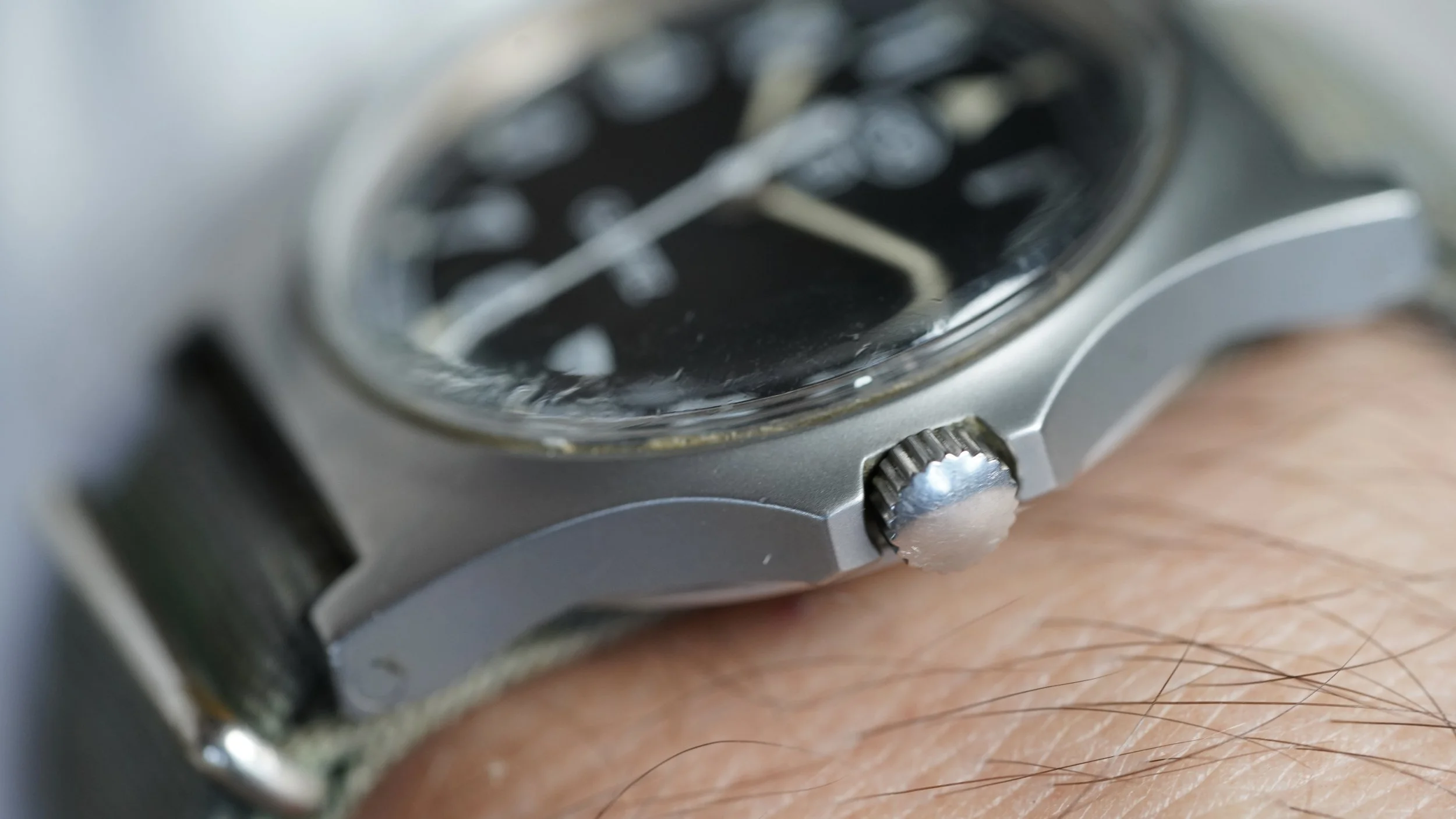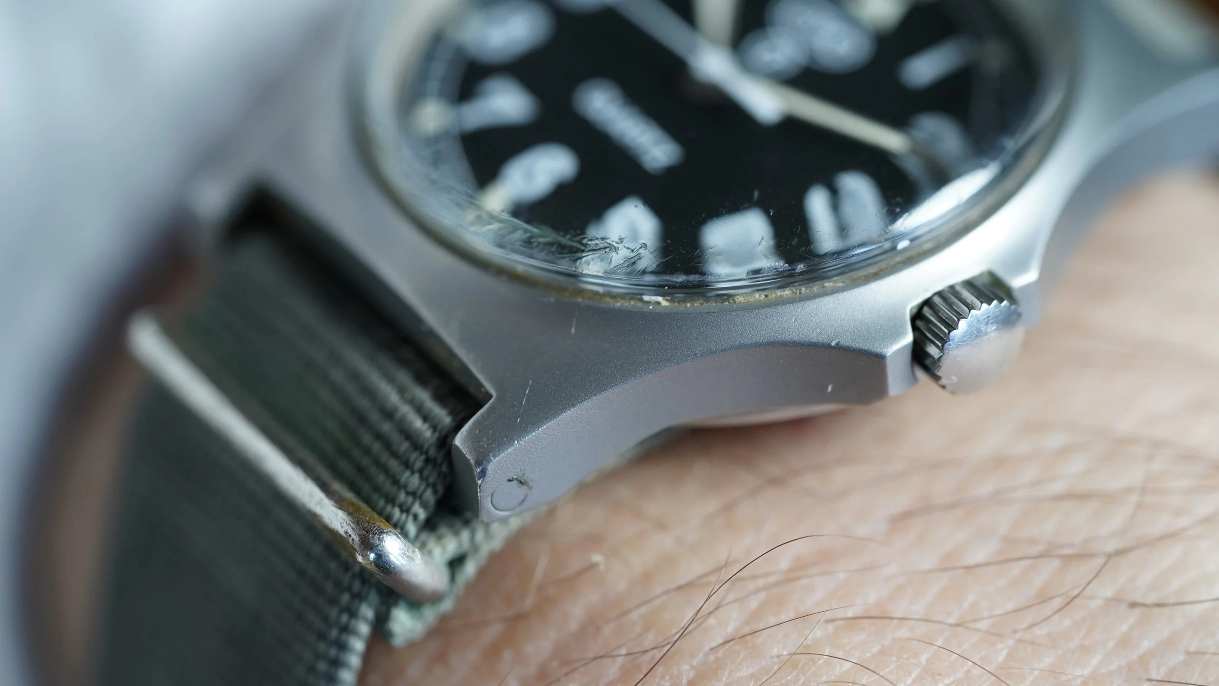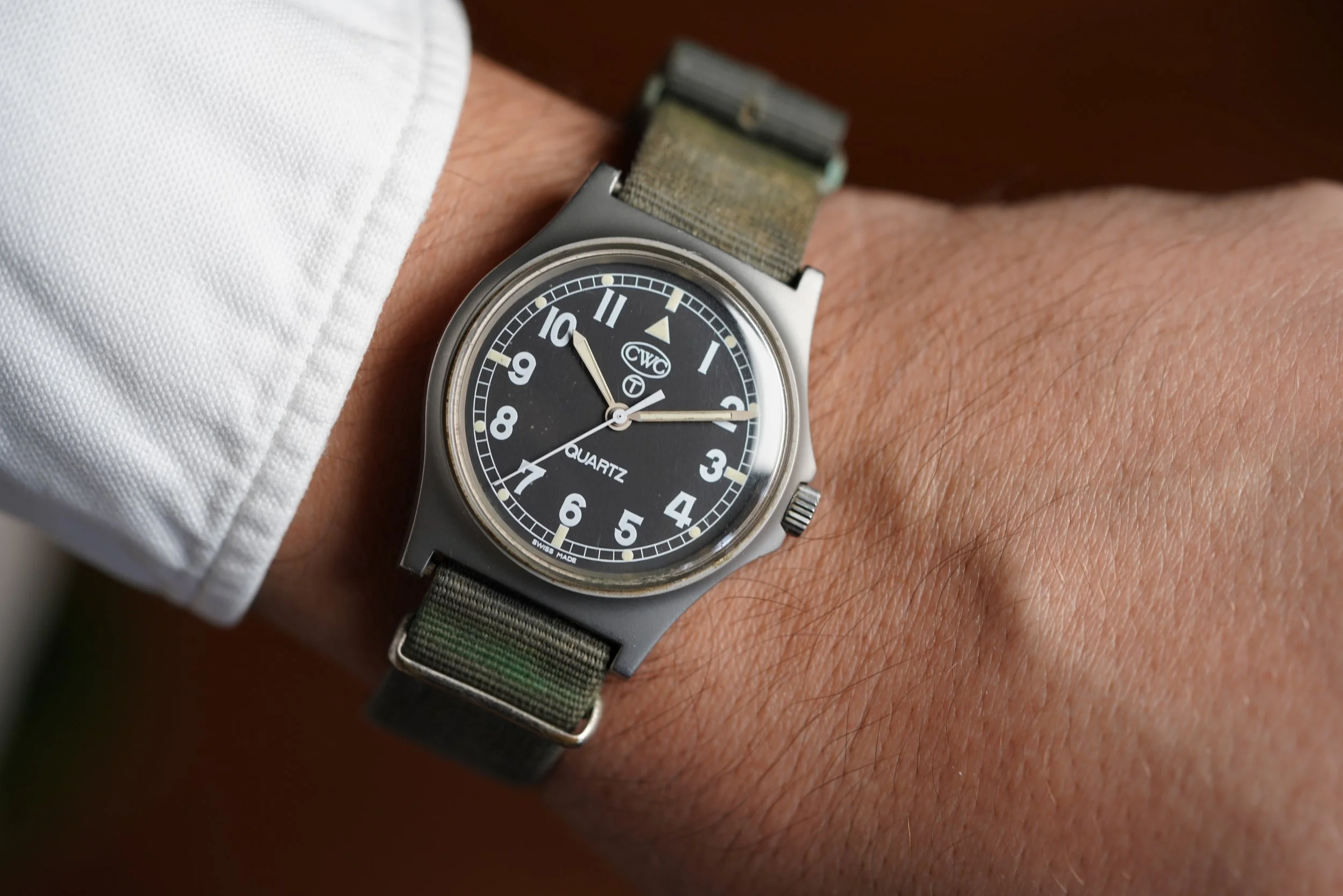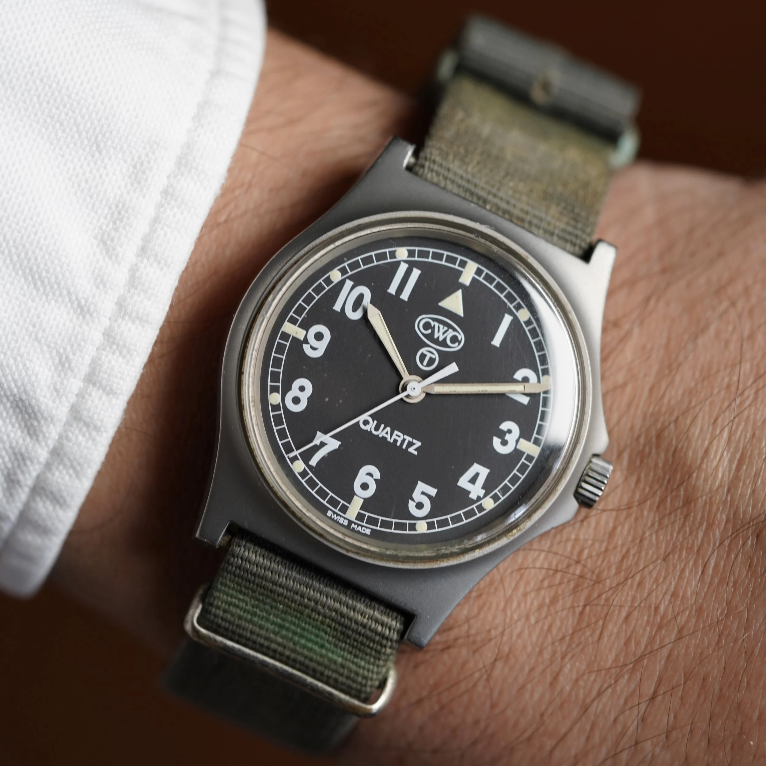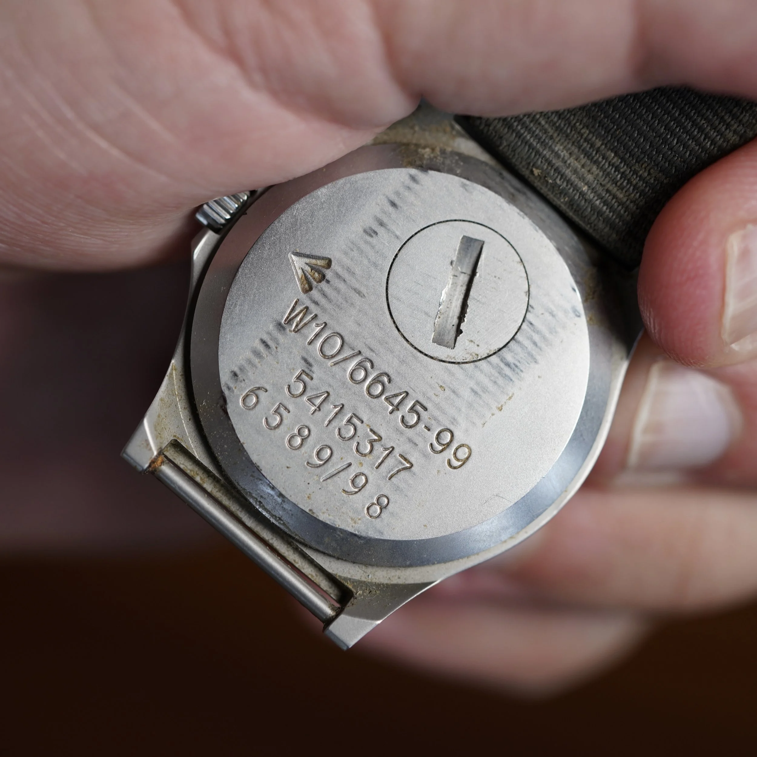 This CWC British Military W10 watch dates to 1998. It is a very cool watch issued for the British Military. The case measures 36mm in diameter (42mm lug to lug). It appears to be unpolished and appears to be on the original strap.