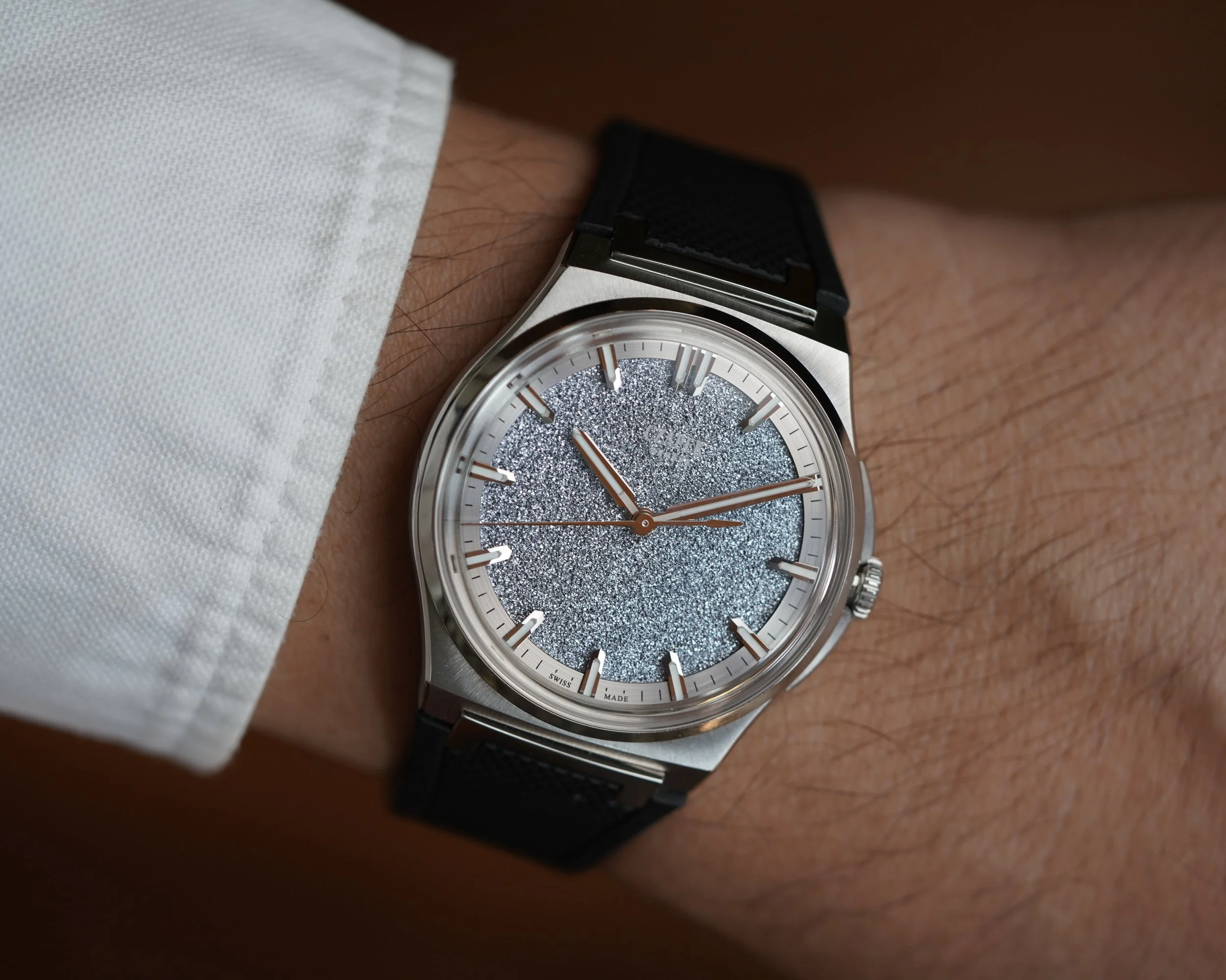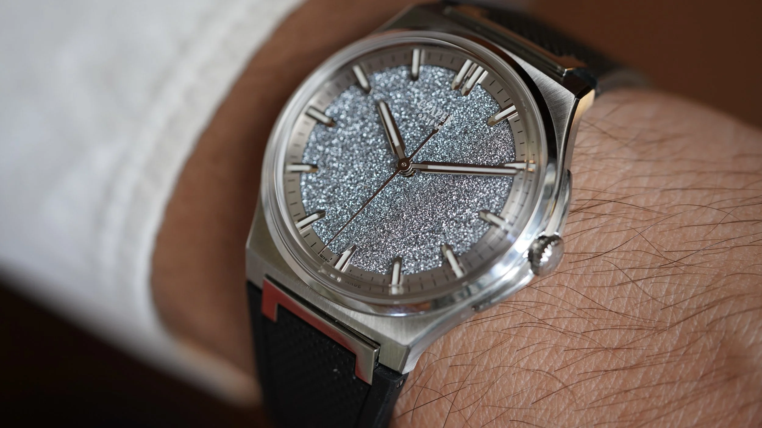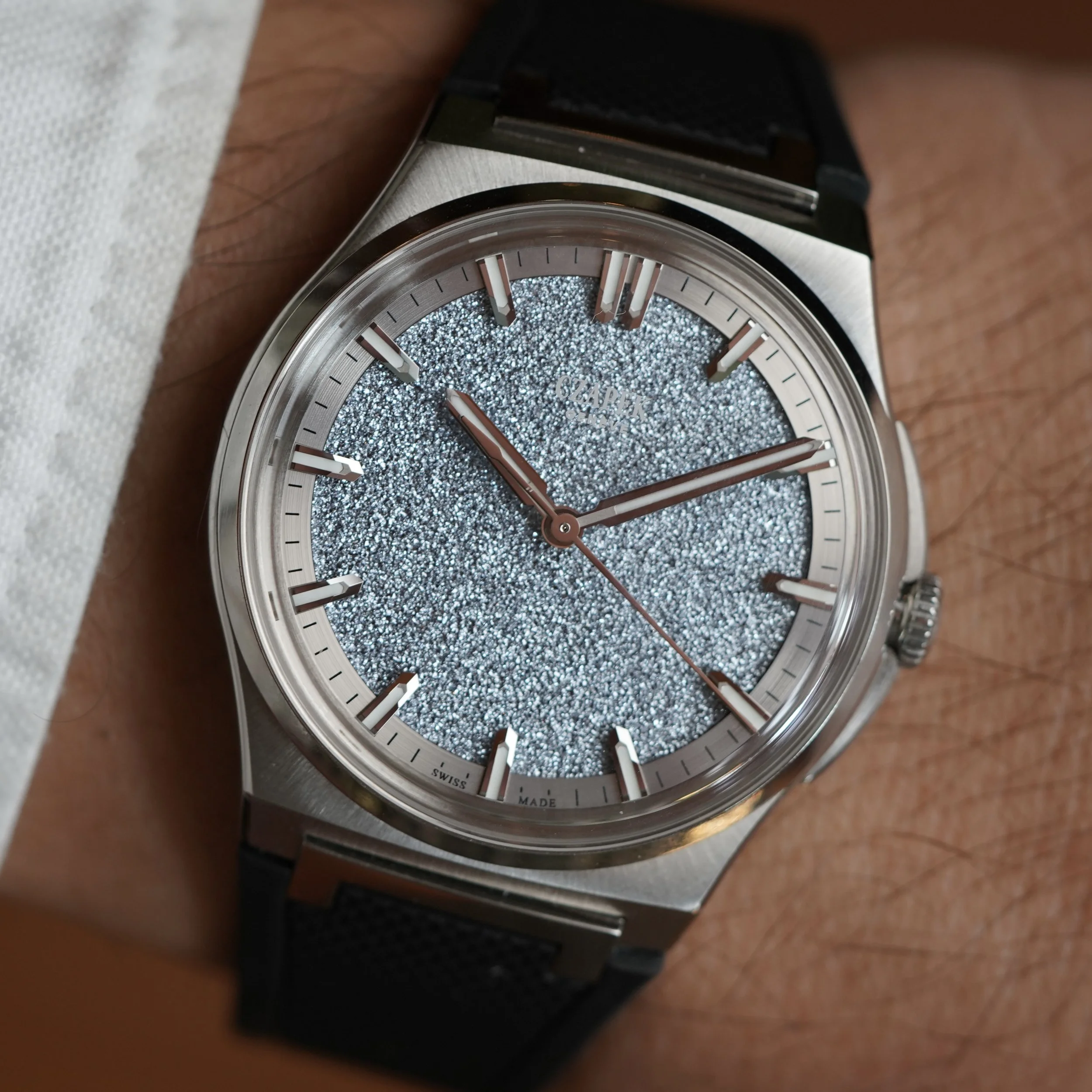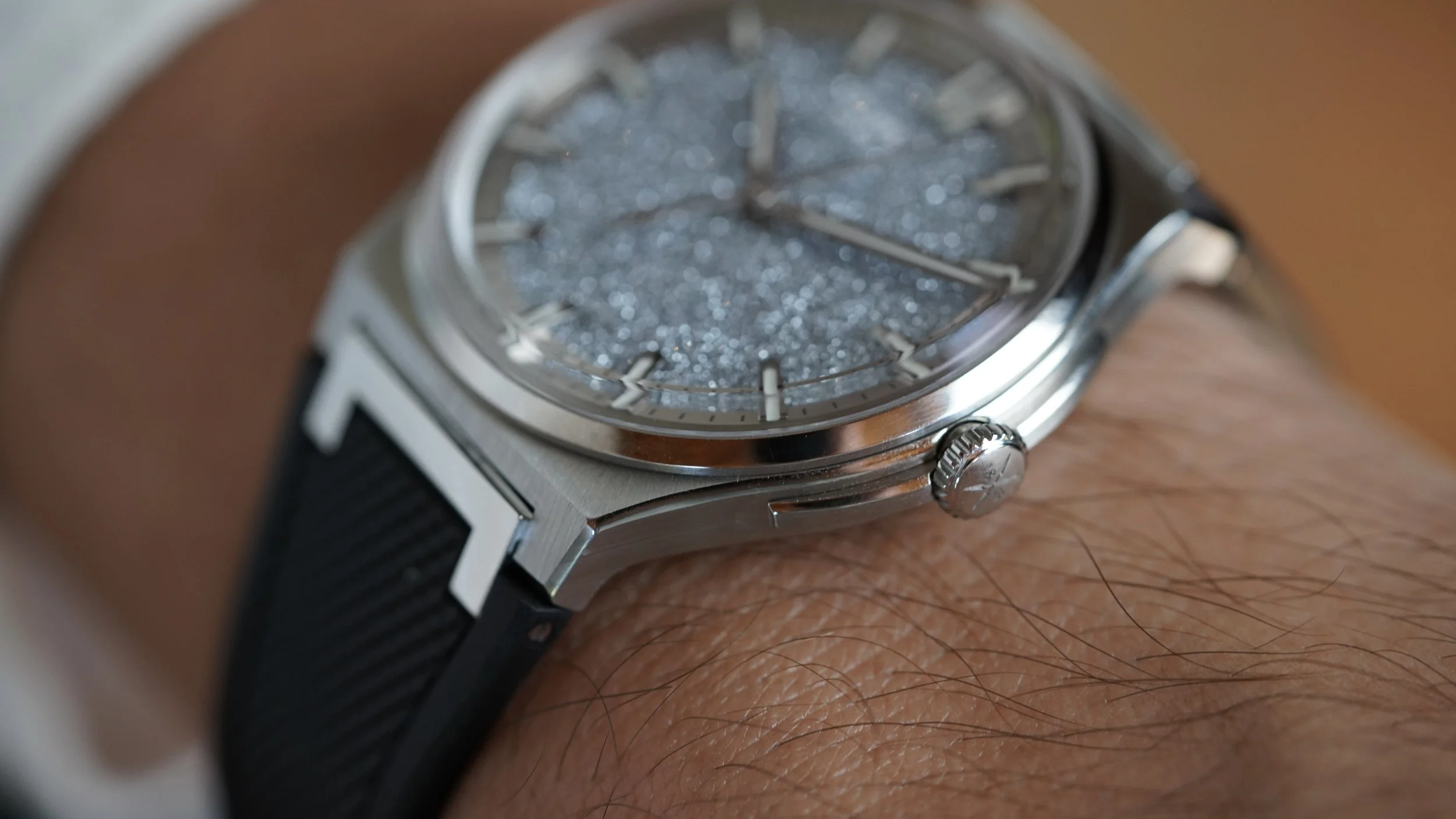 This Czapek Frozen Star is a limited edition watch of 38 pieces originally released at Watches and Wonders in 2022. It was met with incredible enthusiasm and was one of the most popular releases from the manufacturer. The stainless steel case, which measures 38.5mm in diameter, features an integrated bracelet design that supports both an original rubber strap with steel butterfly clasp, or original stainless steel bracelet, which both come with the watch. The watch features an exhibition caseback, displaying the in-house SXH5 movement with platinum rotor. The star of the show however, is the crystallized Osmium dial. Osmium is a notoriously difficult metal to work with as it is incredibly hard and dense.