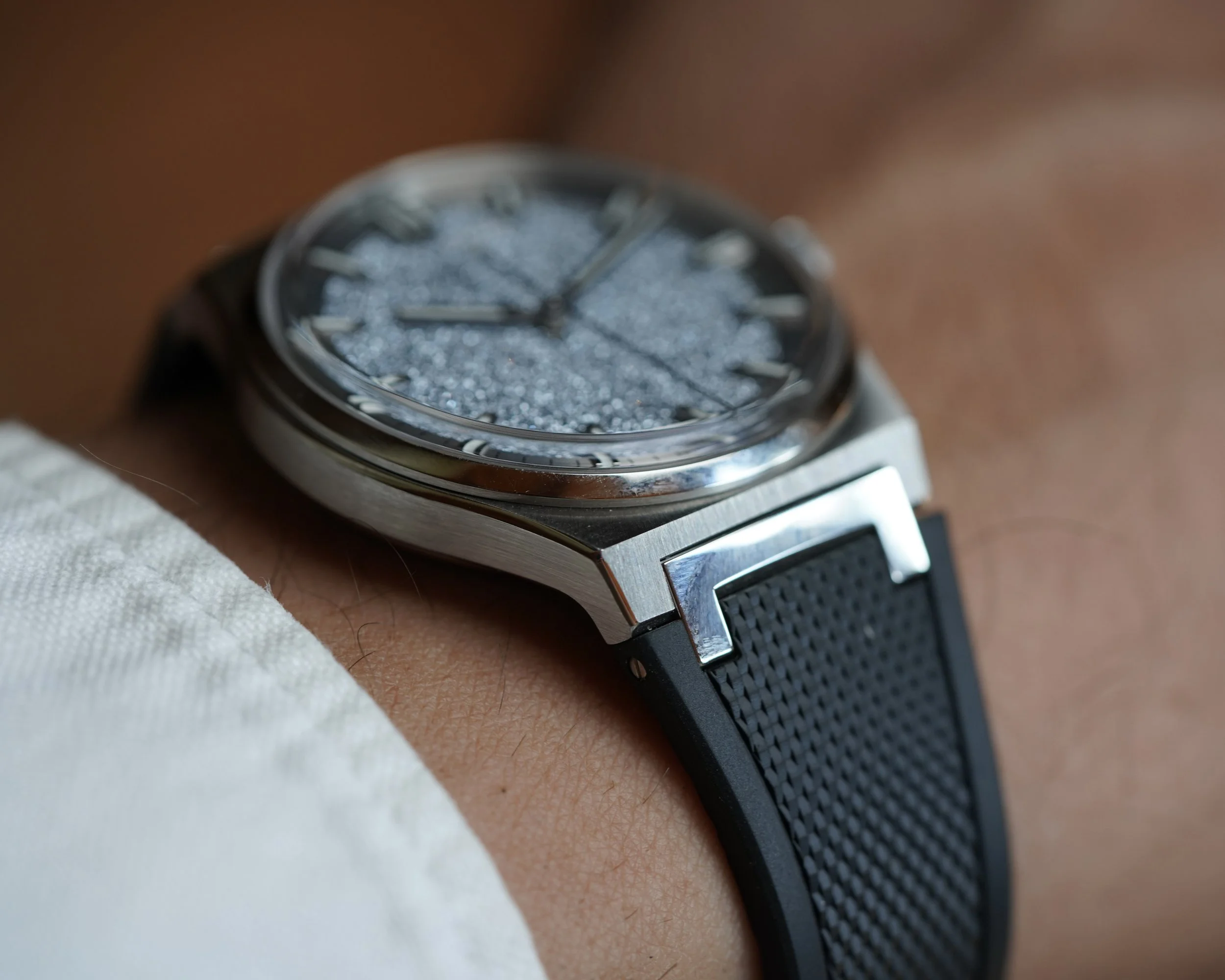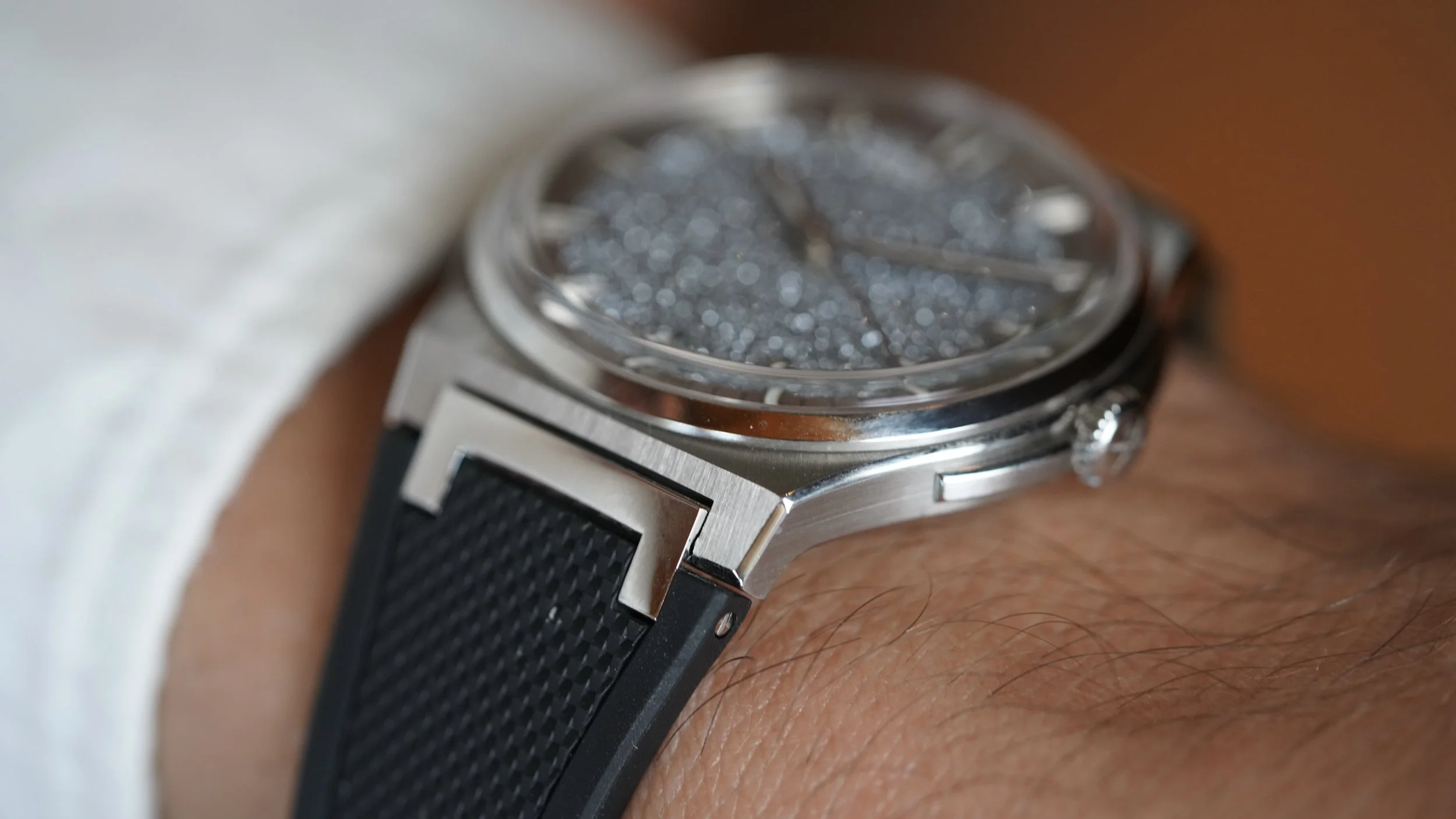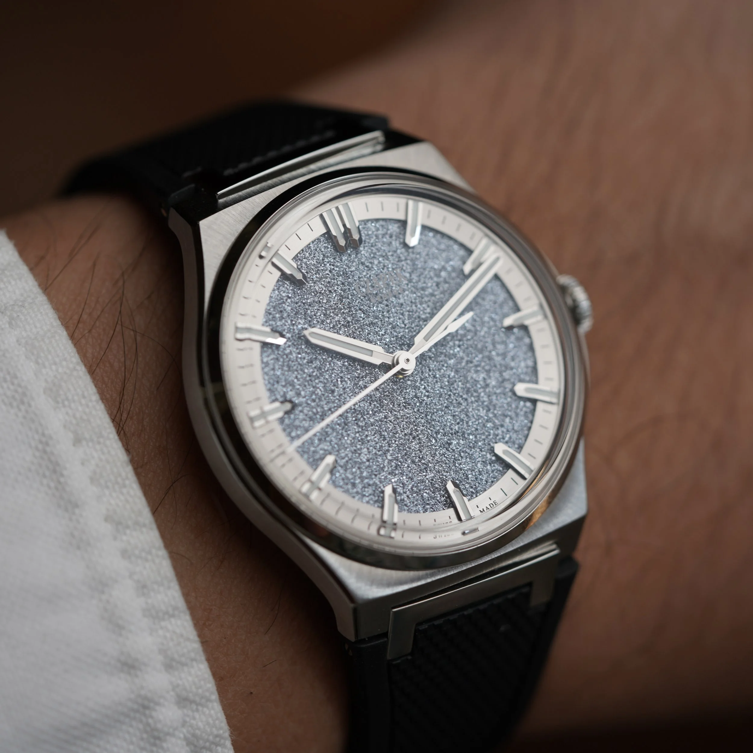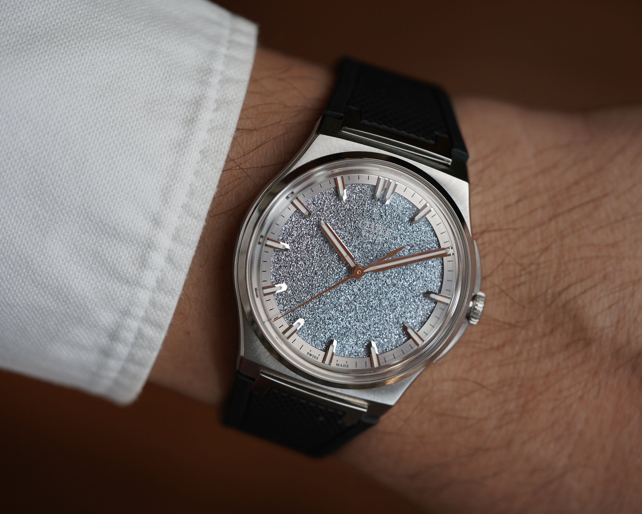 This Czapek Frozen Star is a limited edition watch of 38 pieces originally released at Watches and Wonders in 2022. It was met with incredible enthusiasm and was one of the most popular releases from the manufacturer. The stainless steel case, which measures 38.5mm in diameter, features an integrated bracelet design that supports both an original rubber strap with steel butterfly clasp, or original stainless steel bracelet, which both come with the watch. The watch features an exhibition caseback, displaying the in-house SXH5 movement with platinum rotor. The star of the show however, is the crystallized Osmium dial. Osmium is a notoriously difficult metal to work with as it is incredibly hard and dense.