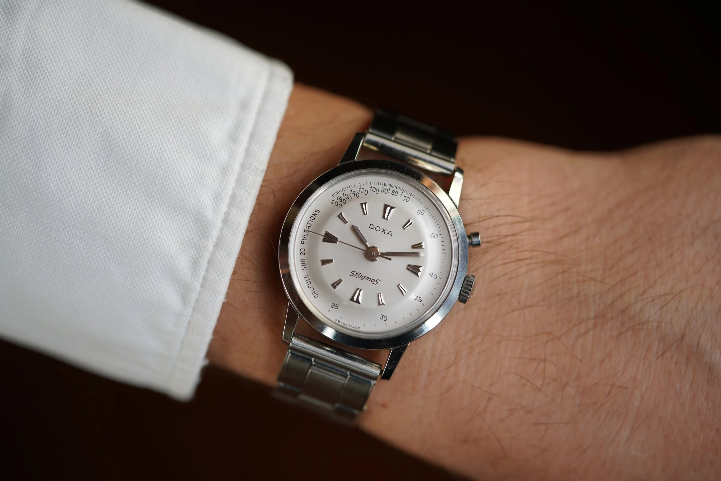 This Doxa Sfygmos was originally designed as a tool to help doctors measure a patient's heart rate. This model is the reference 7003-4 and is an uncommon watch. The case is made of stainless steel. It measures approximately 35mm in diameter and approximately 42mm lug-to-lug. The dial is non-luminous. It is in excellent condition and the dial is extremely attractive with great hour markers. It features the original crystal that magnifies the center of the dial.