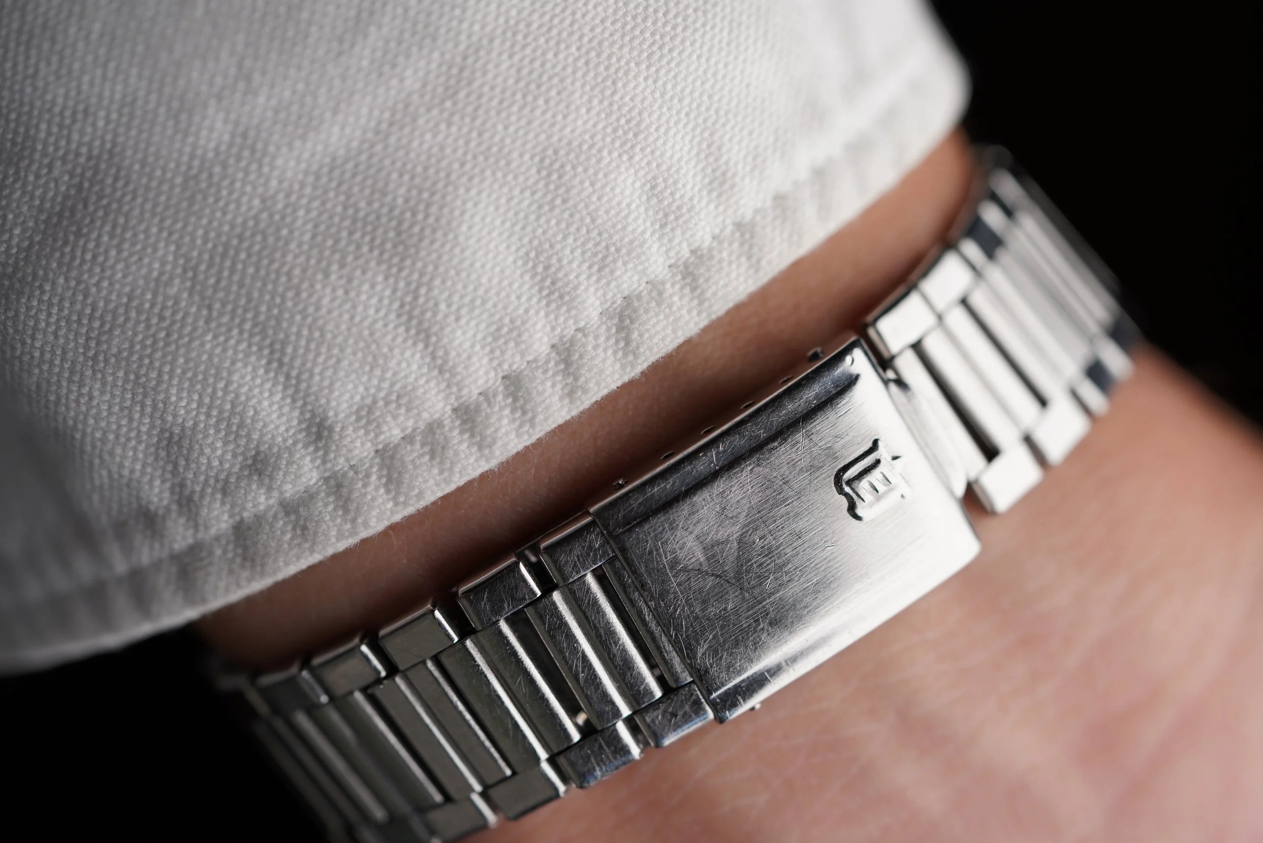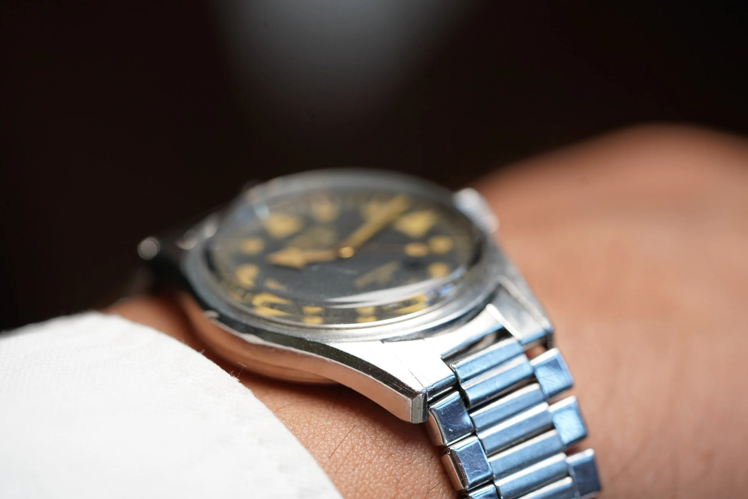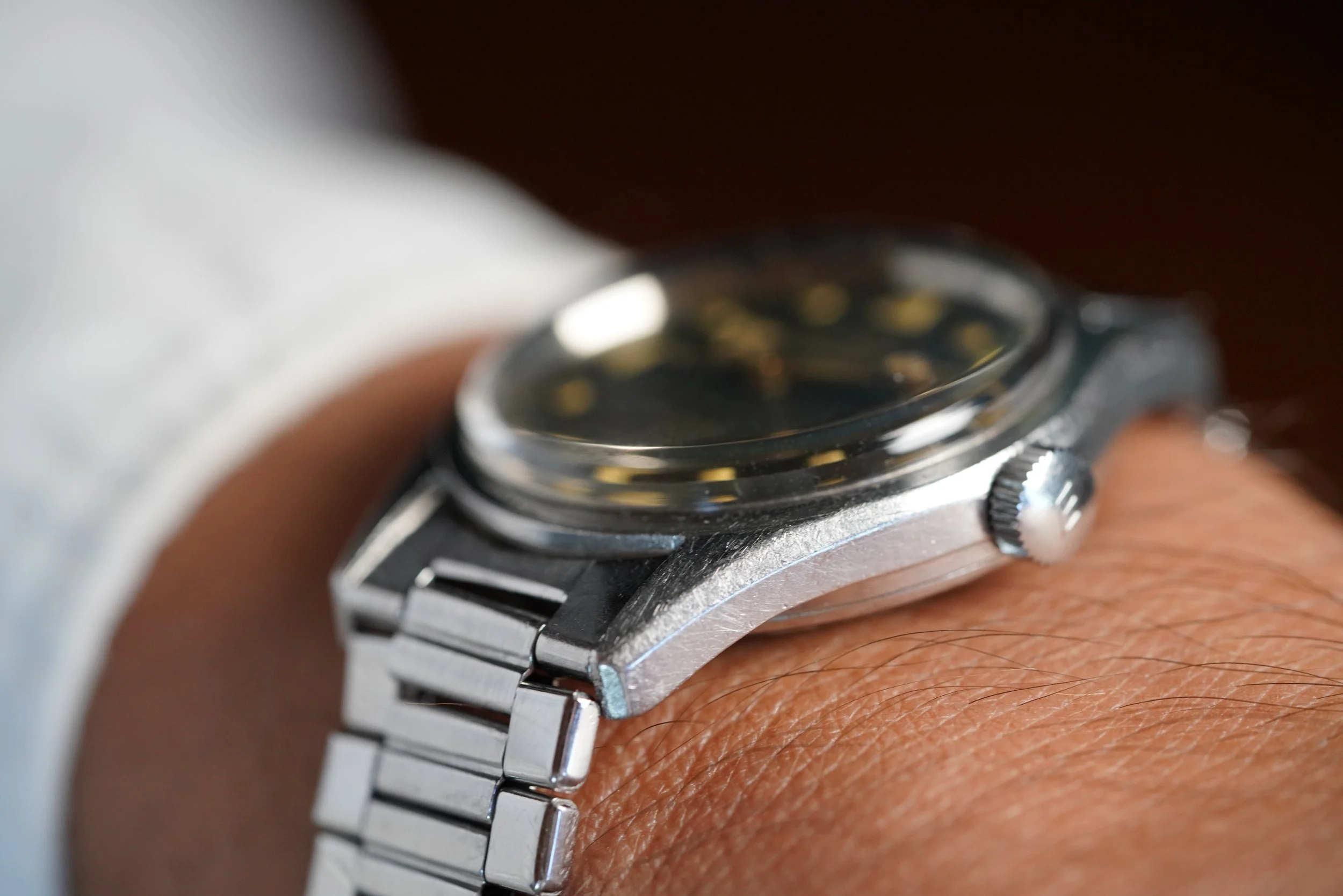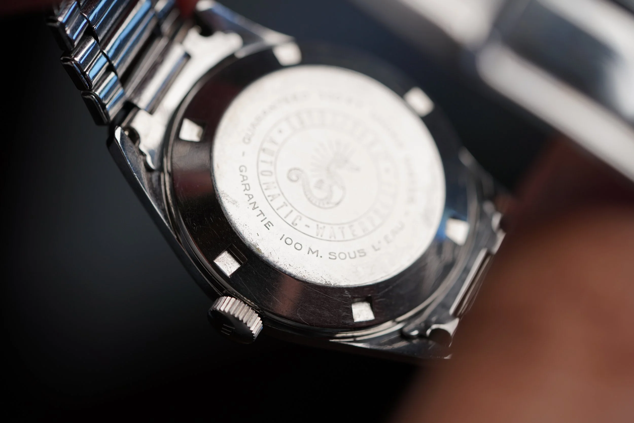 The Eberhard Scafograf 200 is a unique and rare vintage dive watch. It features large circular and triangular luminous hour markers. It comes on an original Eberhard bracelet made by Gay Freres. It will fit a wrist approximately 7 inches.