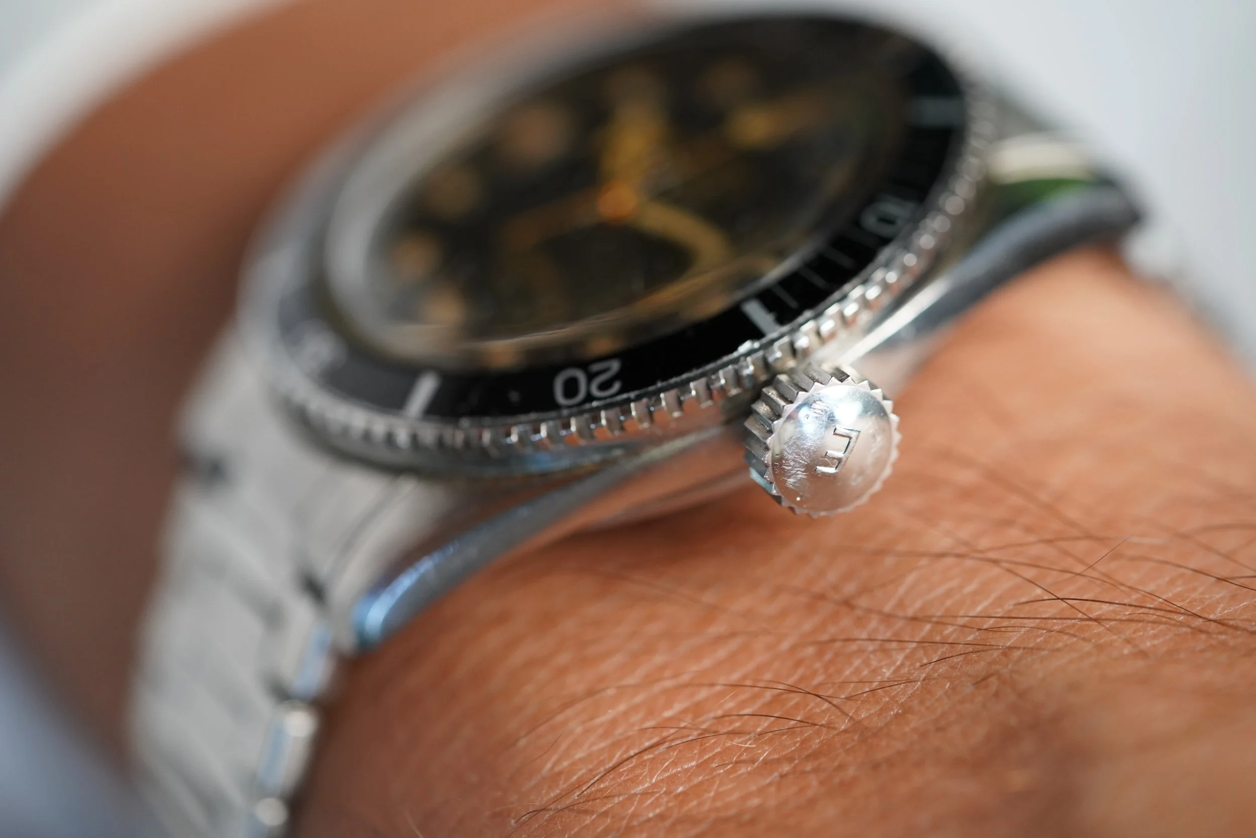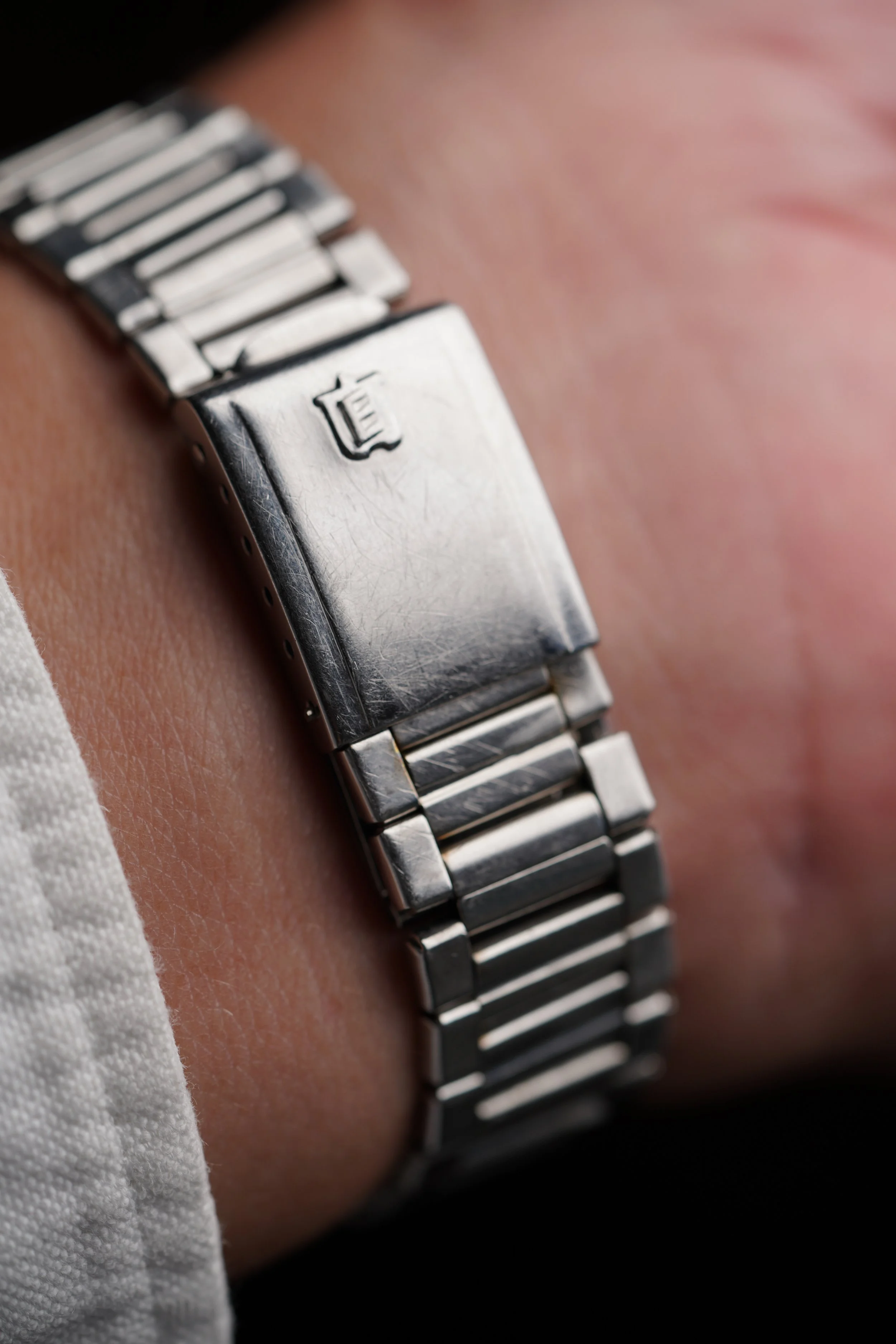 The Eberhard Scafograf 200 is a unique and rare vintage dive watch. It features large circular and triangular luminous hour markers. It comes on an original Eberhard bracelet made by Gay Freres. It will fit a wrist approximately 7 inches. The endlinks are aftermarket. The bracelet is period correct.