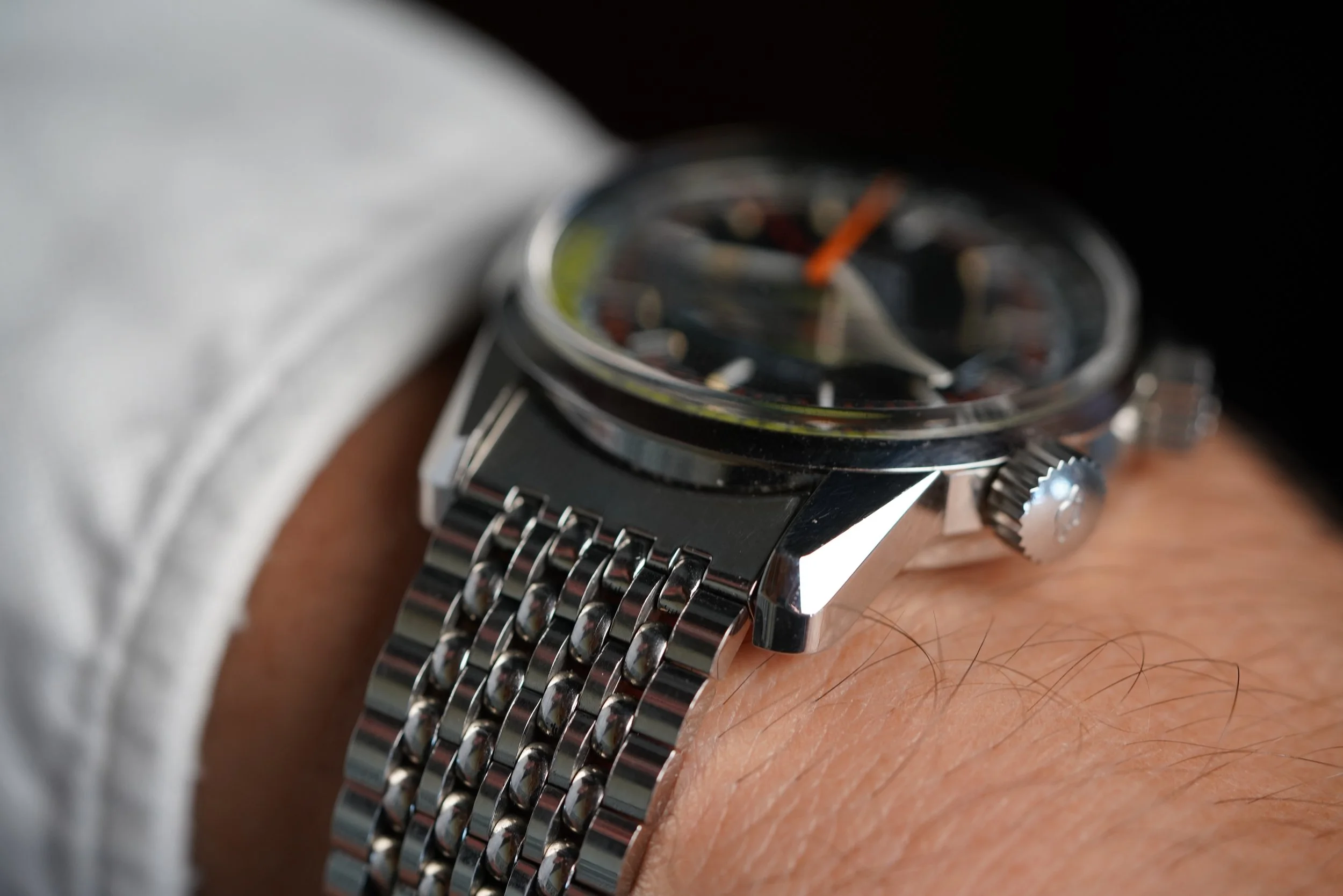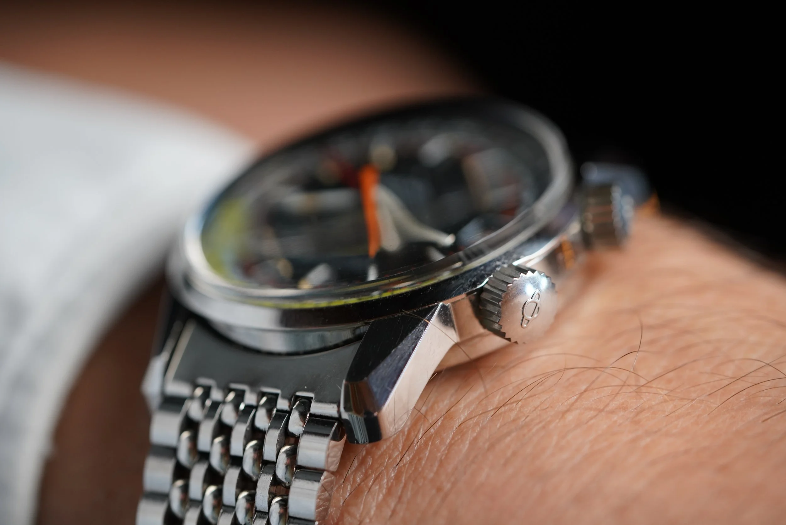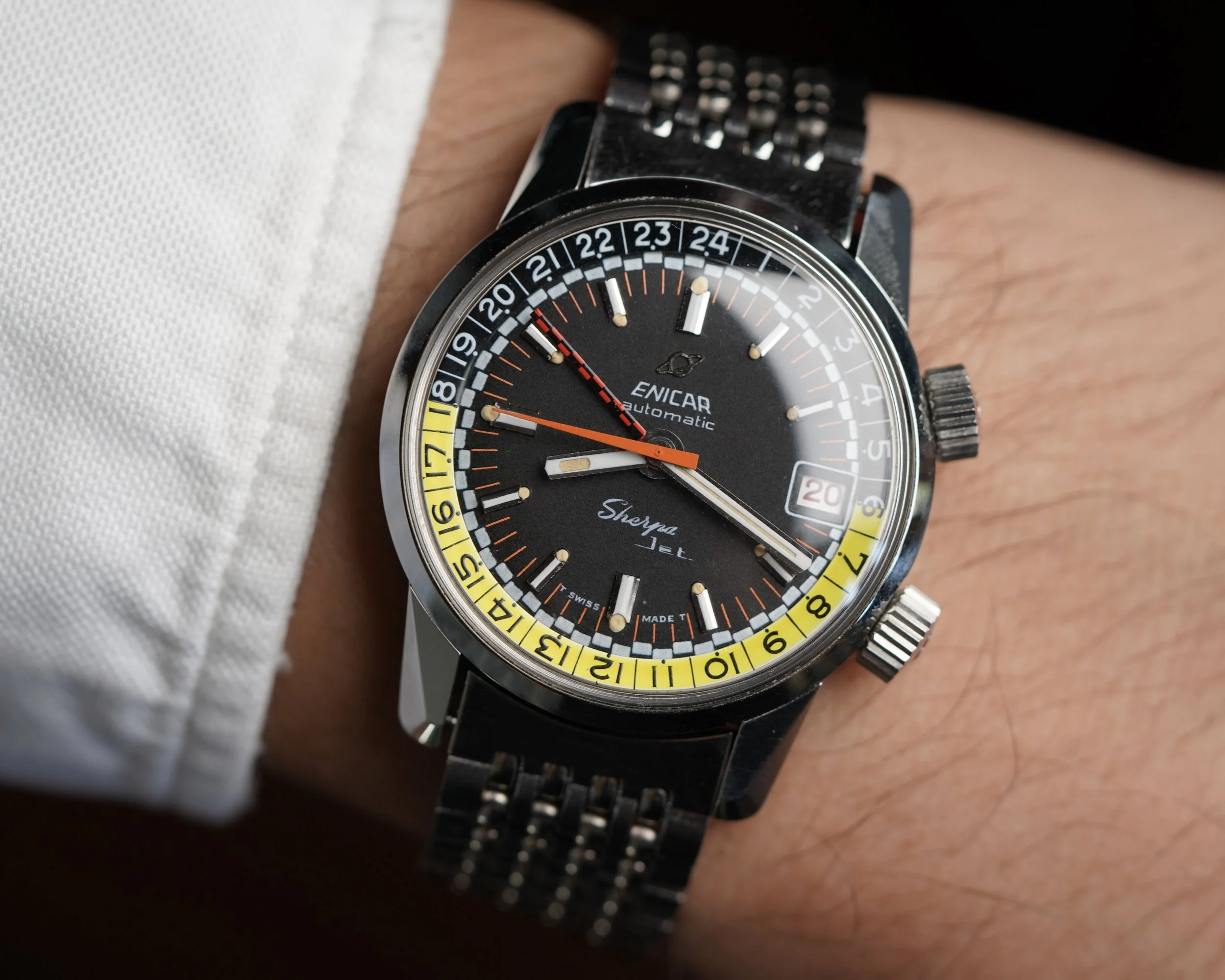 This Enicar Sherpa reference 148-35-02 is an incredible example. The condition is outstanding. It features a yellow and black rotating inner bezel and black dial. The stainless steel case measures approximately 36.5mm in diameter and 44mm lug-to-lug. It is paired with an aftermarket steel bracelet.