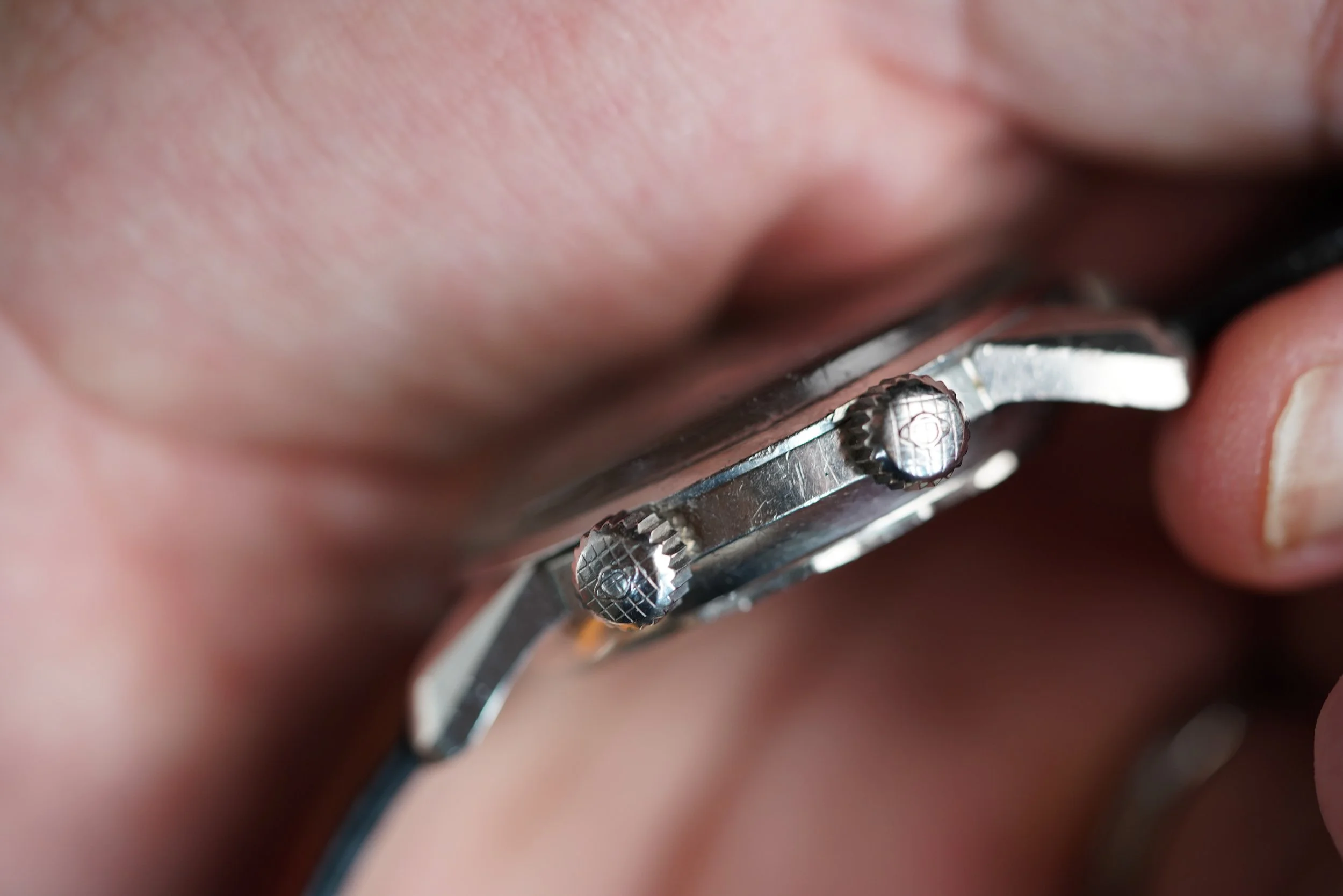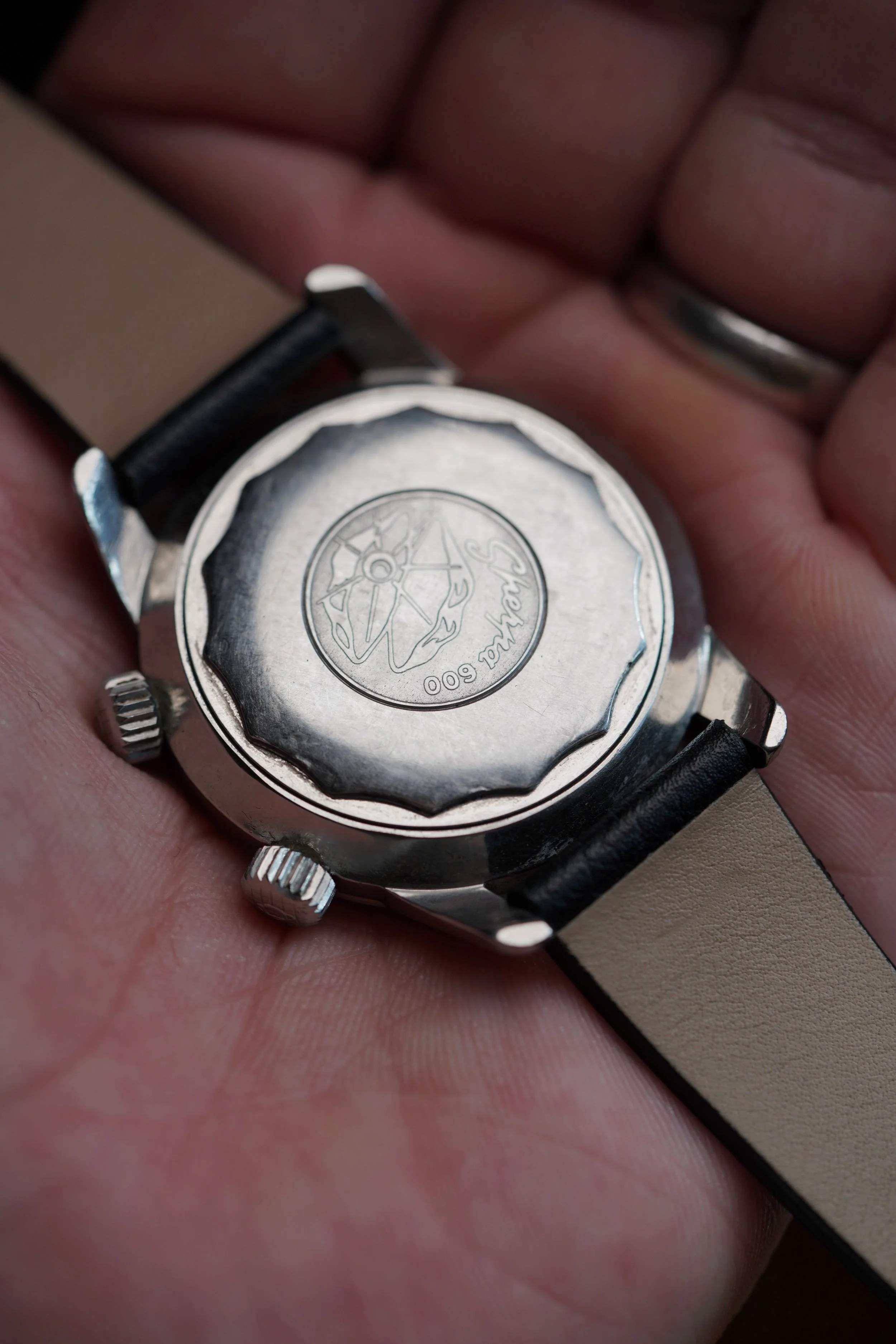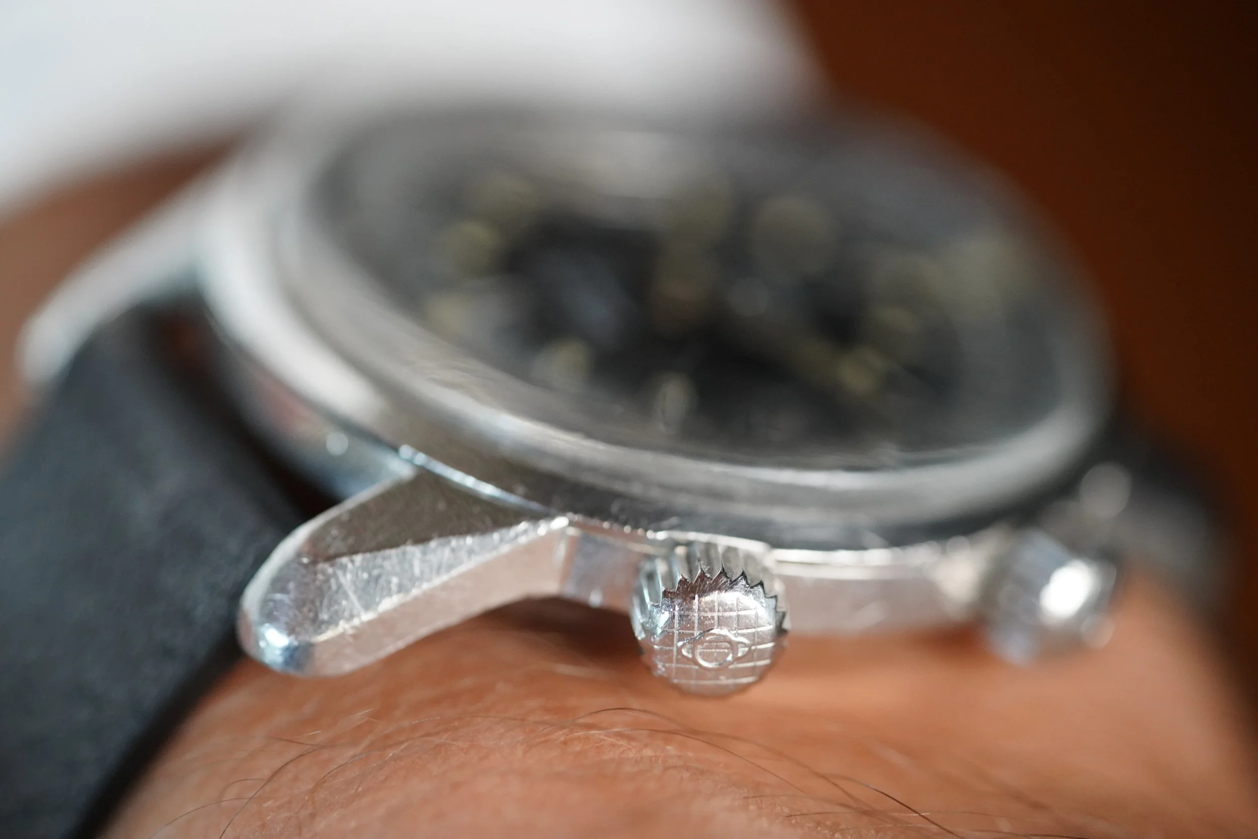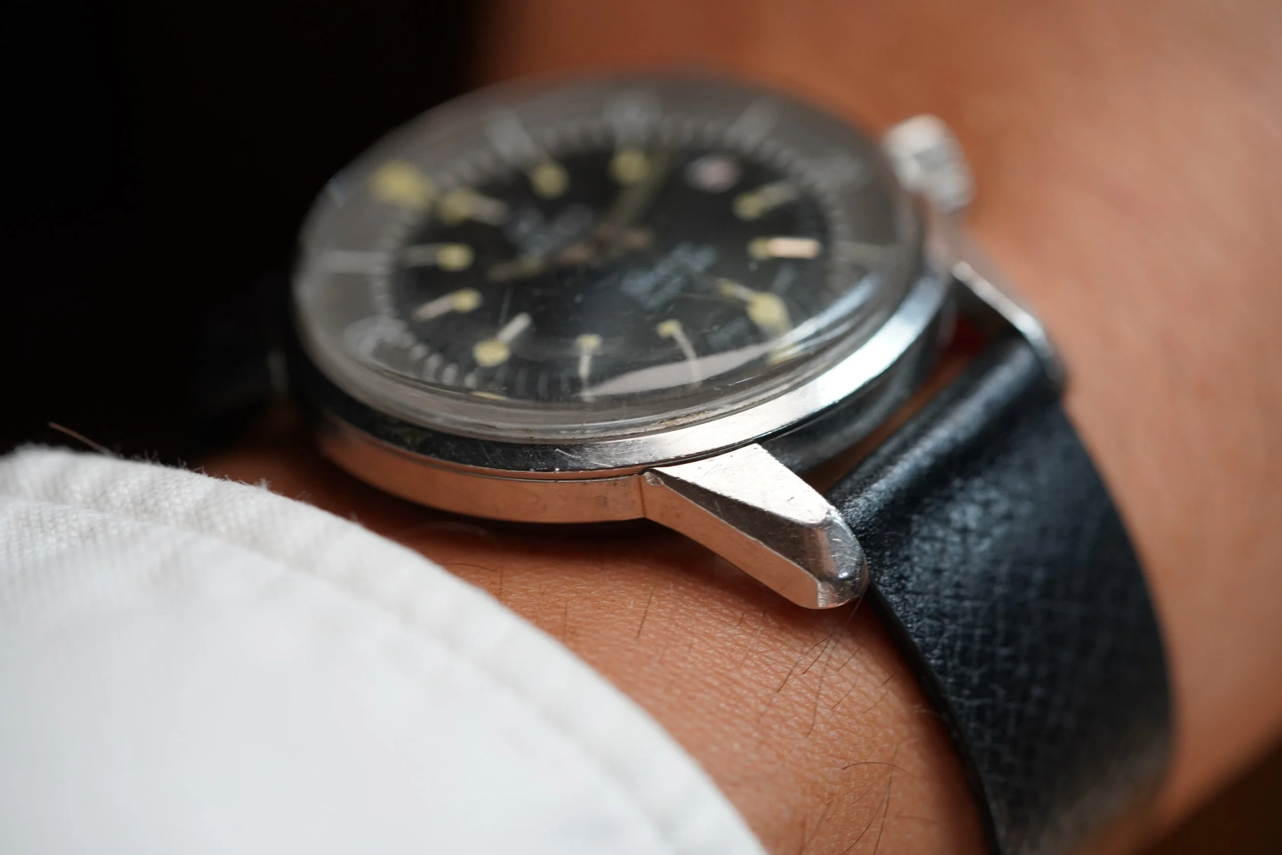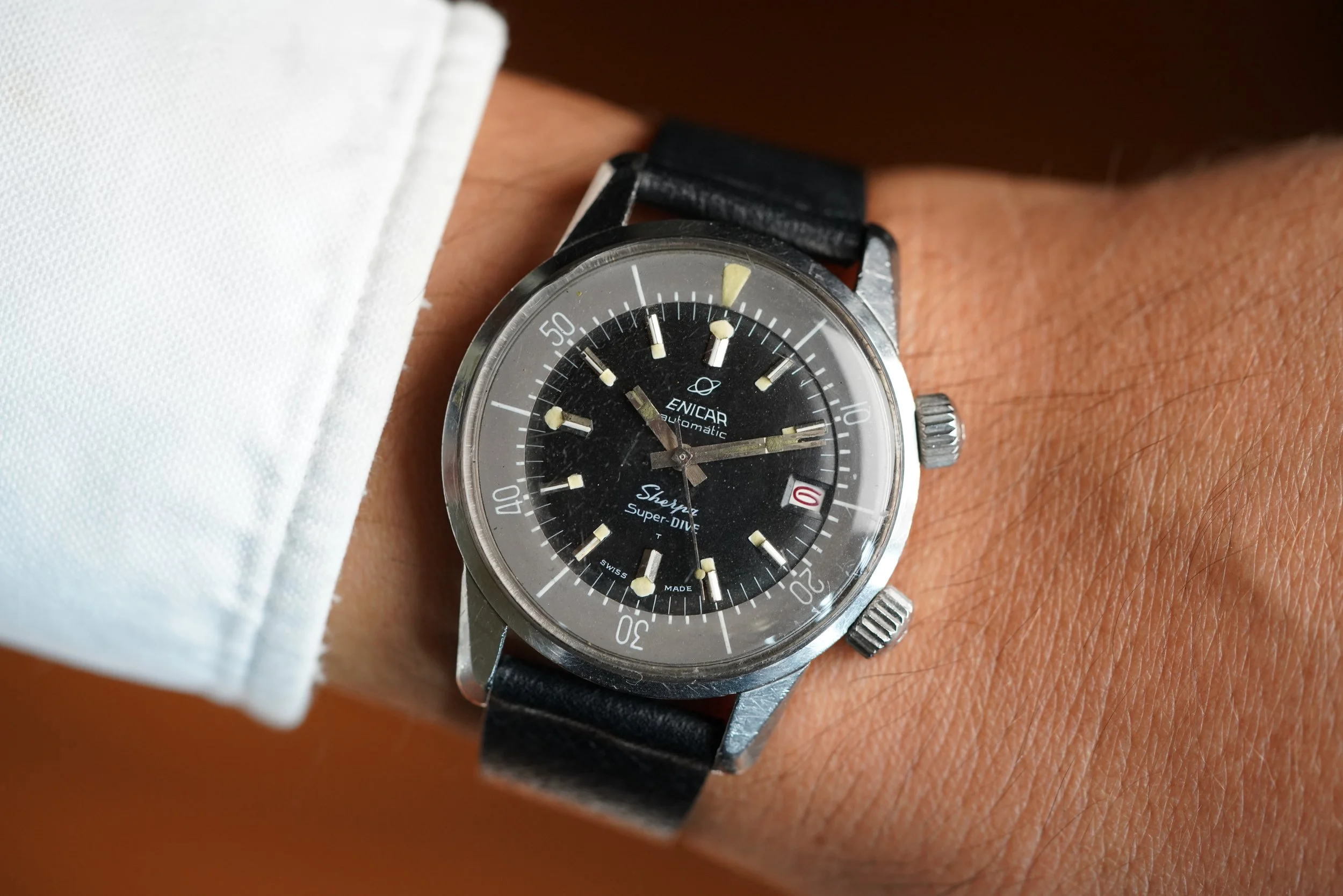 The Enicar Sherpa Super Dive models are extremely cool and uncommon watches. This example is in very fun with a matte black dial. The case made by E. Piquerez SA (also called EPSA). Enicar was way ahead of other companies with the large dimensions. The case appears to be unpolished and is approximately 40mm in diameter.