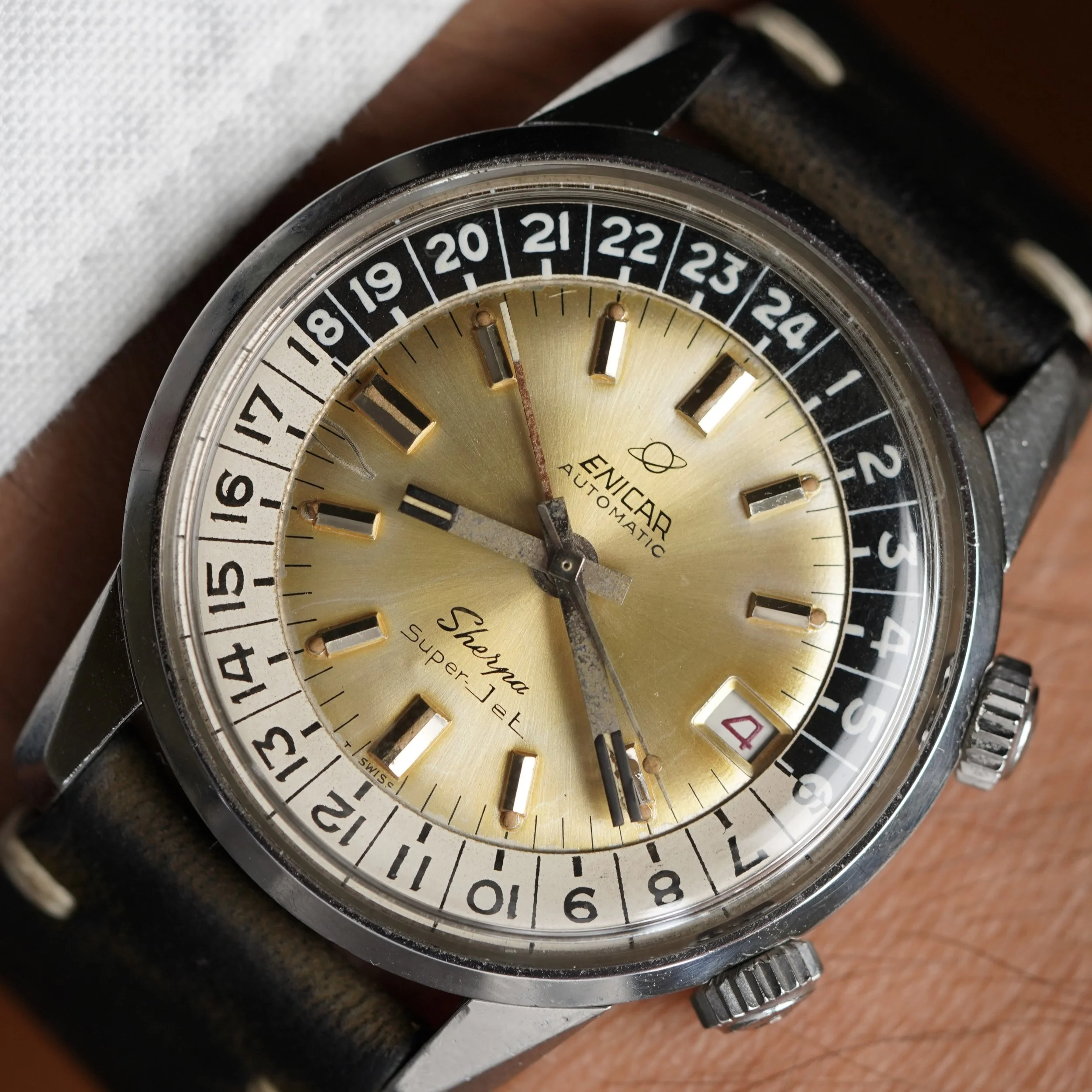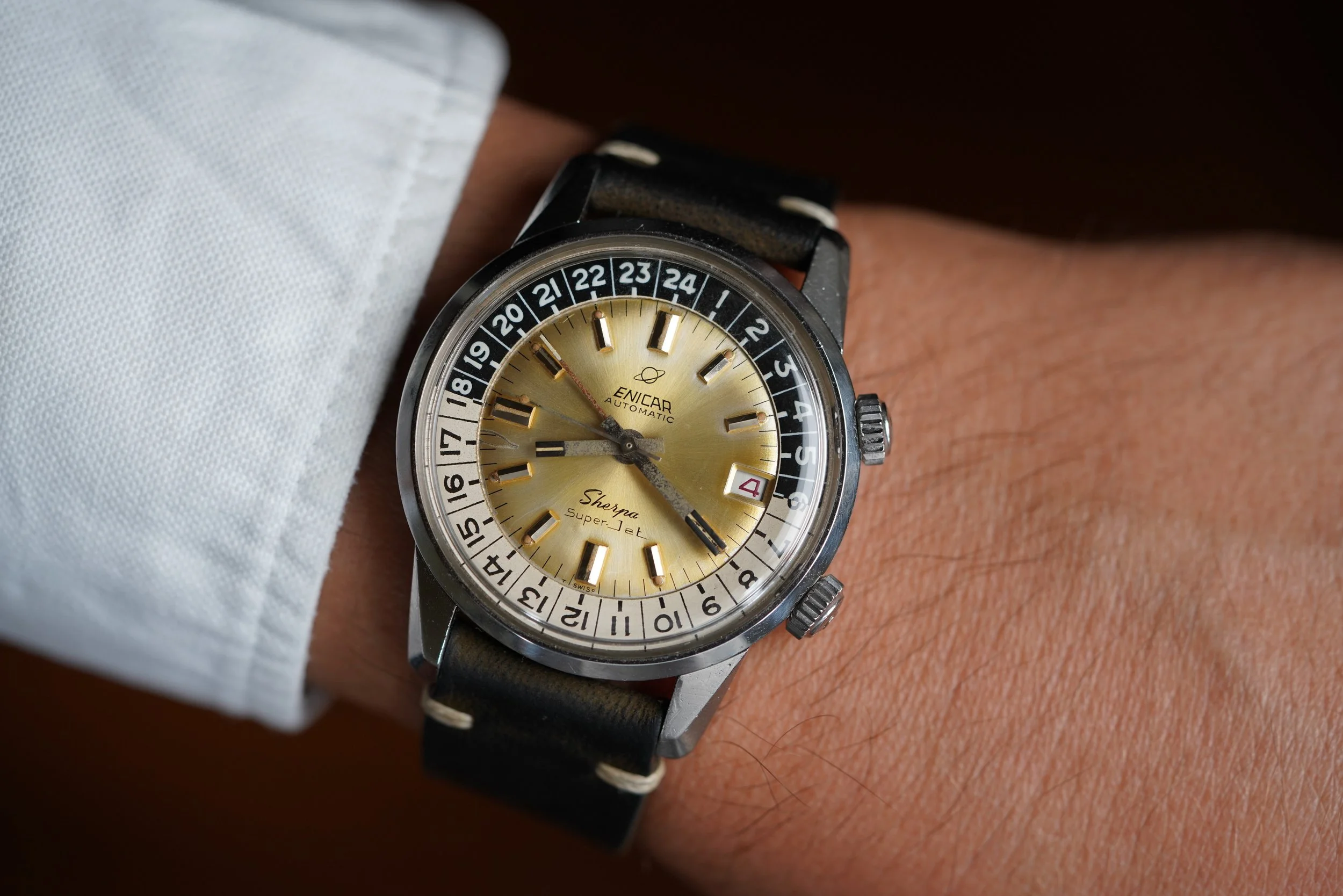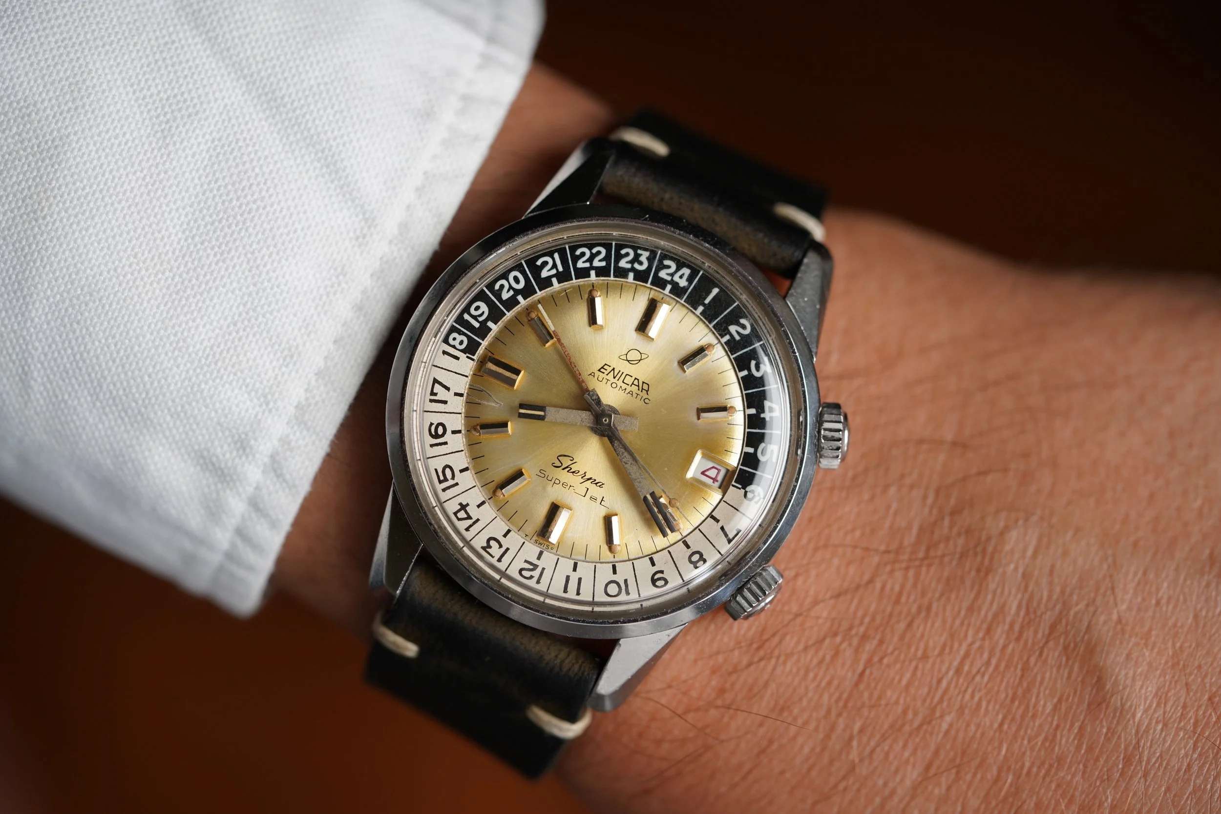 The Enicar Sherpa Super Jet models are extremely cool and uncommon watches. This example is in very fun with a silvery champagne dial. The case made by E. Piquerez SA (also called EPSA). Enicar was way ahead of other companies with the large dimensions. The case appears to be unpolished and is approximately 40mm in diameter.