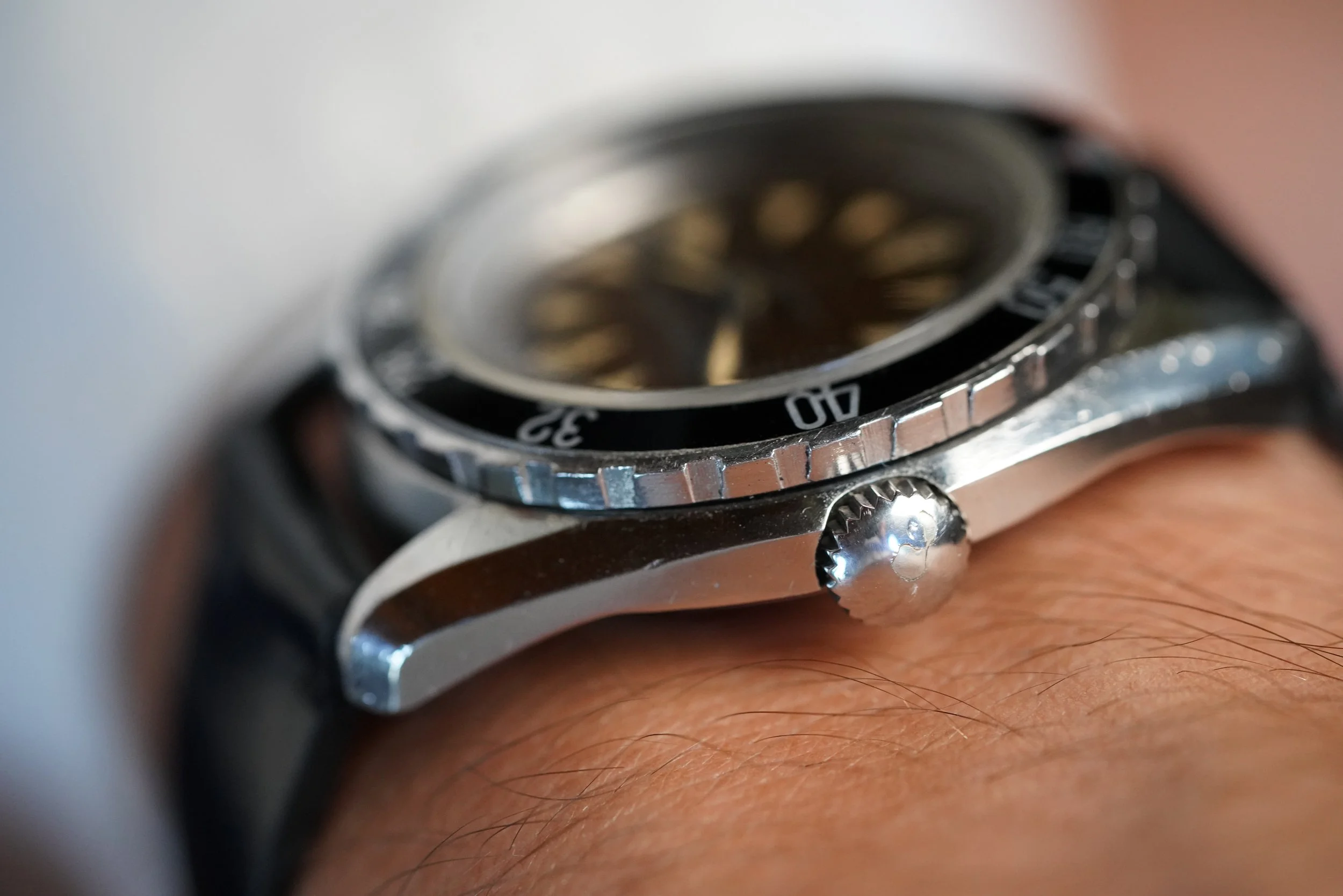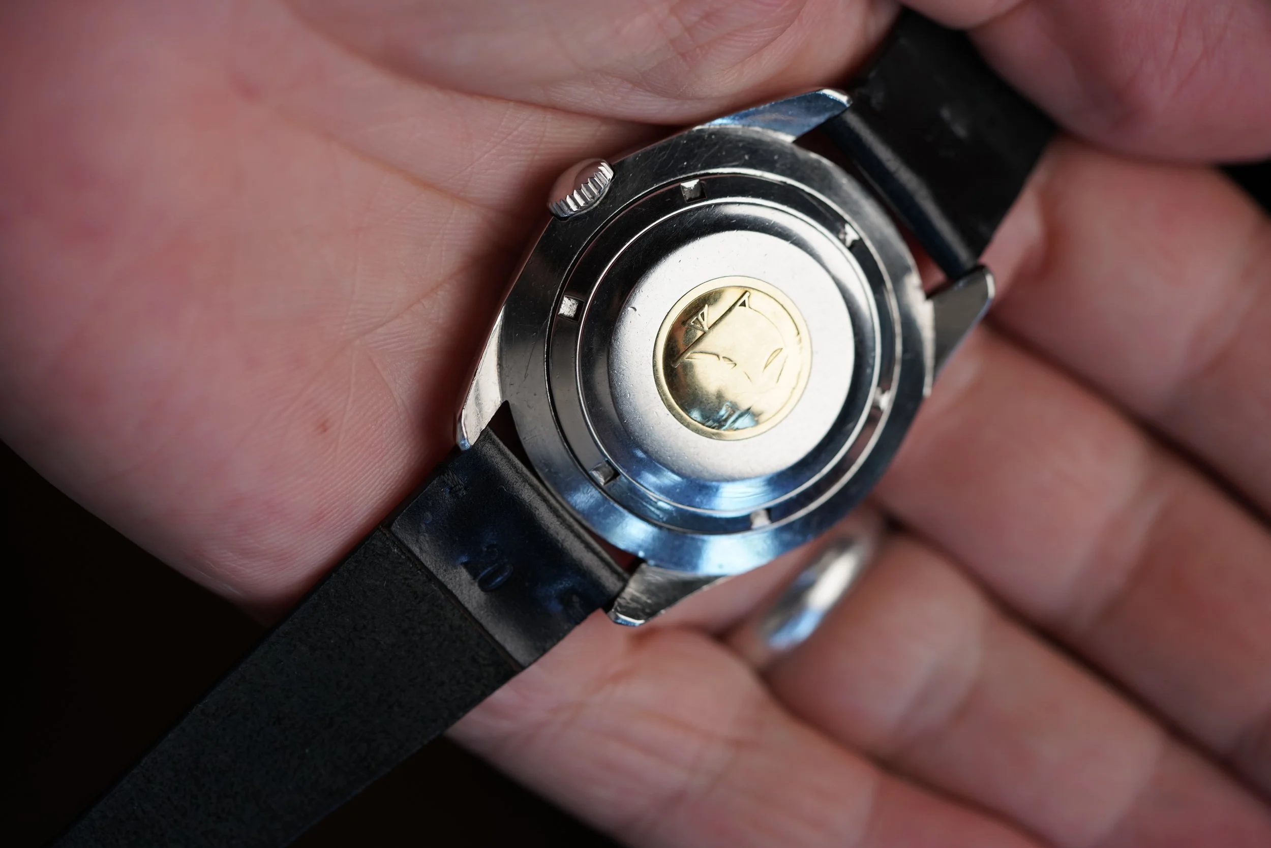 This Eterna-Matic Super-Kontiki reference 130PTX/1 is a very cool model. The dial is a beautiful tropical brown. It features the rare triangular hour markers seen in dive and expedition watches of the era. The luminous material on the dial and hands are original. The bezel insert is a service insert. The case measures 40mm in diameter. It has been lightly polished, but is attractive and even.