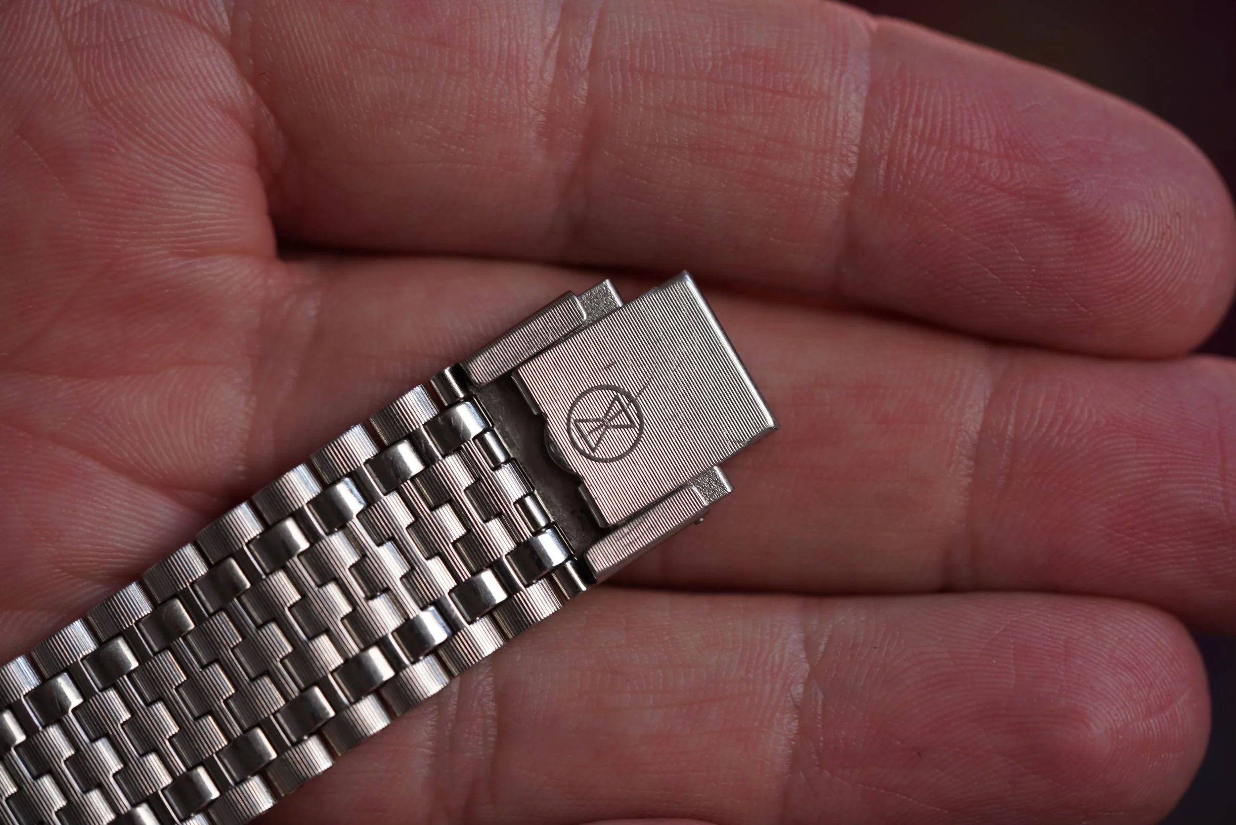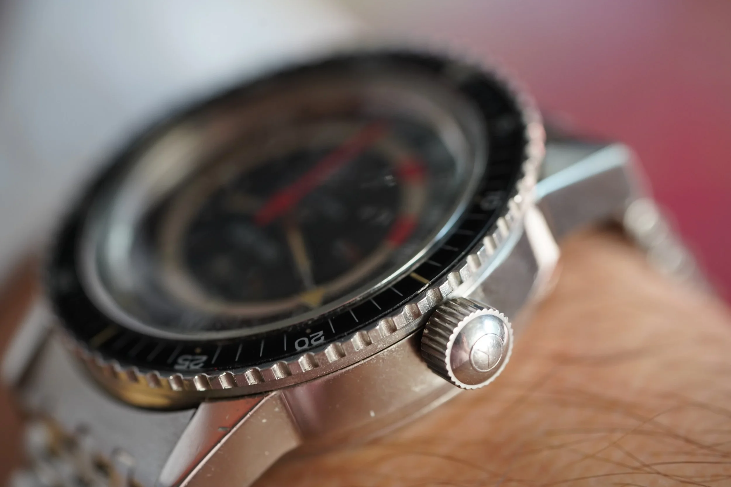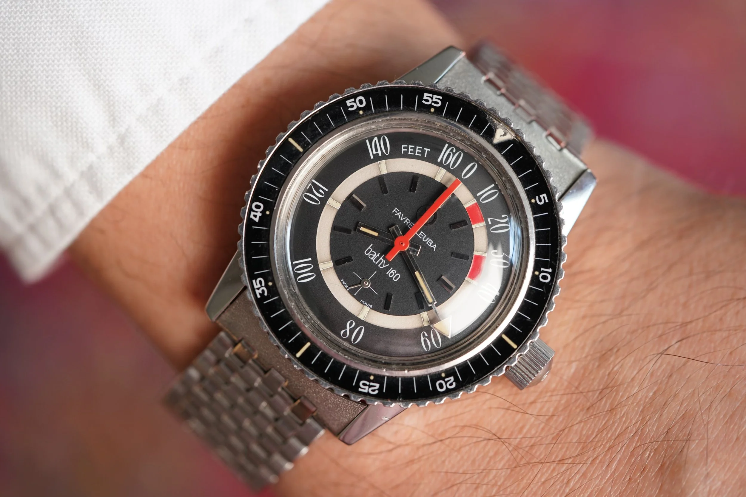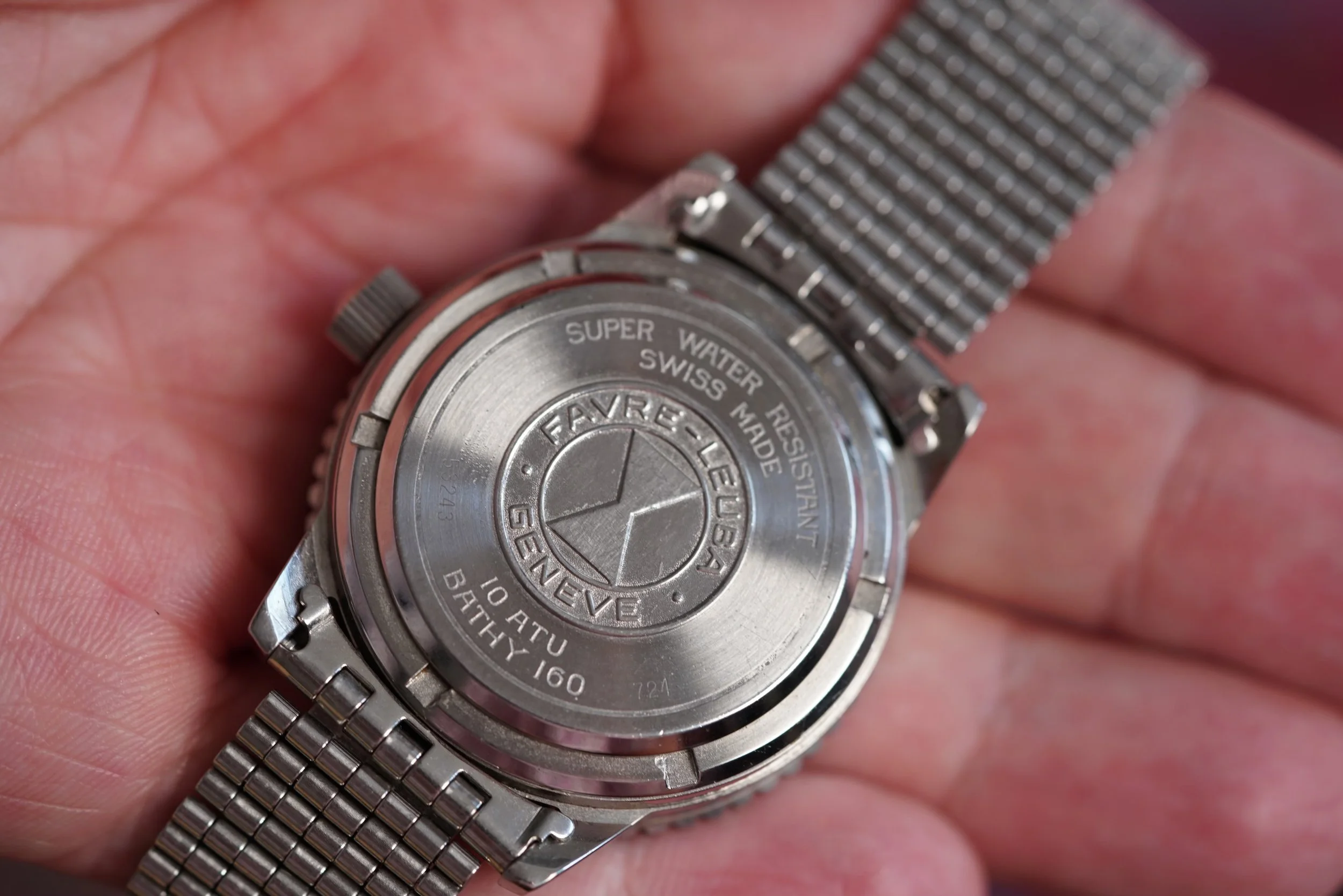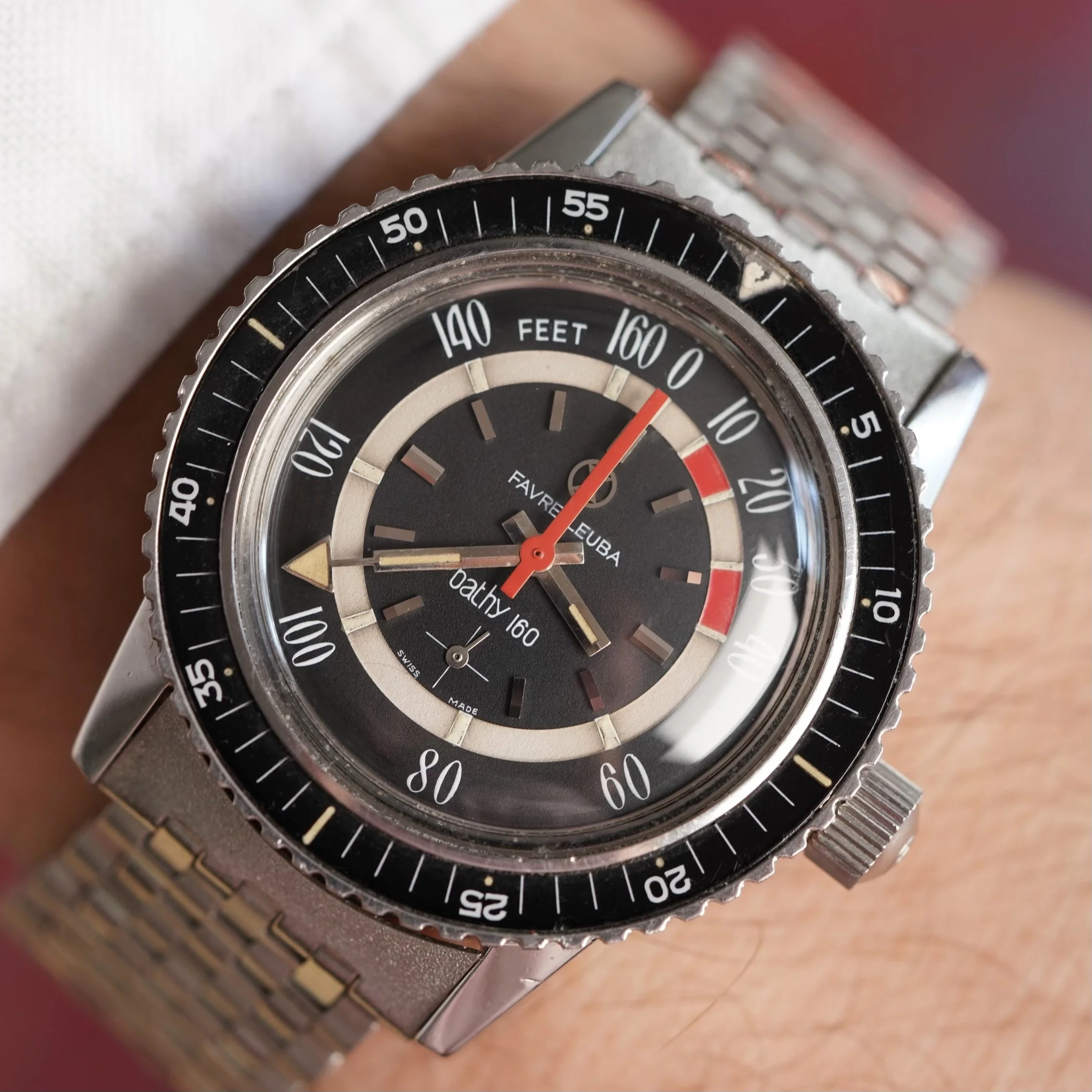 This Favre-Leuba Bathy 160 is a super cool and rare dive watch. It is quite interesting in that it incorporates a depth gauge into the watch itself. It has a nice case which has been lightly polished. It measures 39mm in diameter (46mm lug-to-lug). It is paired on a very cool NSA (Novatit SA), Favre-Leuba signed bracelet.