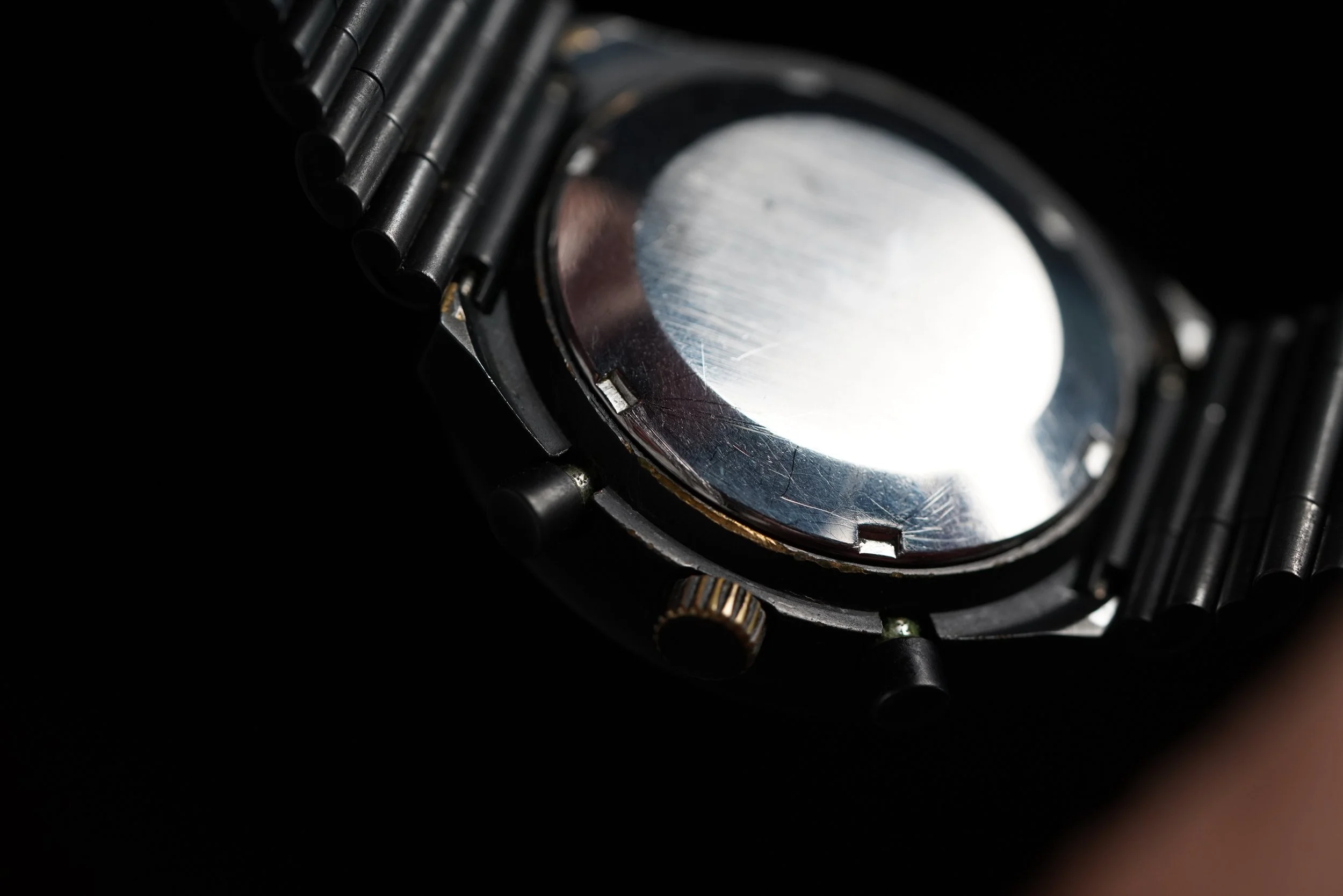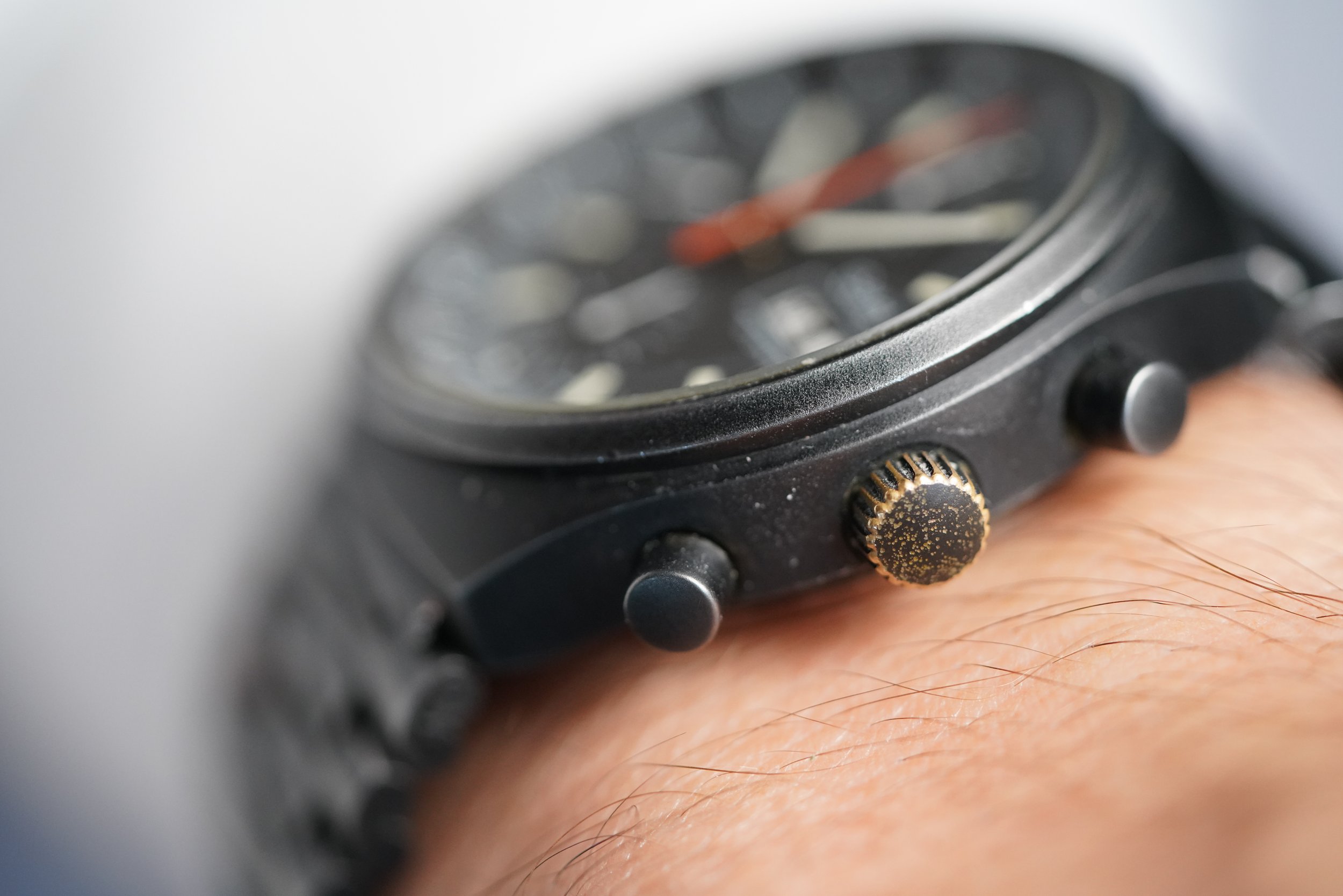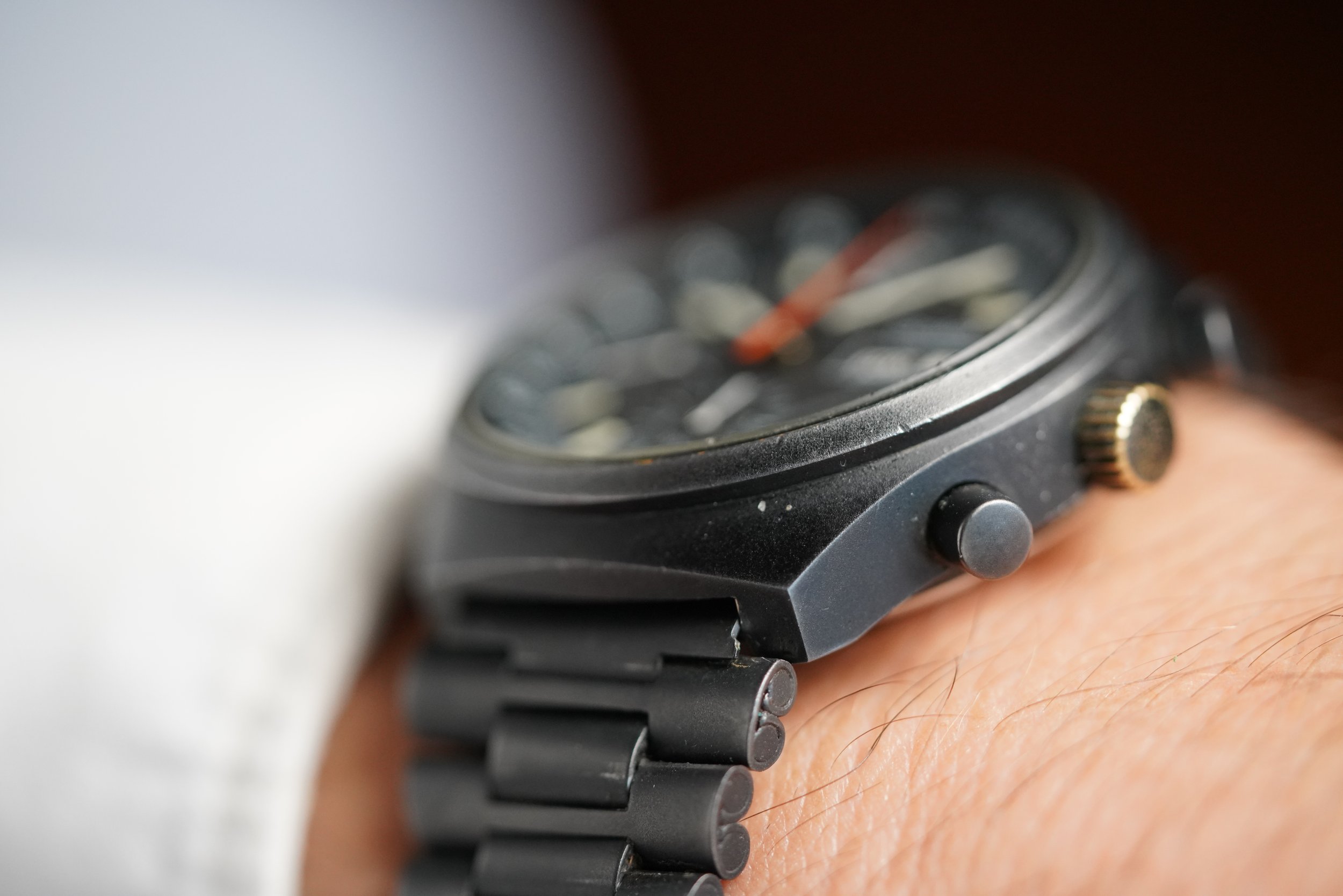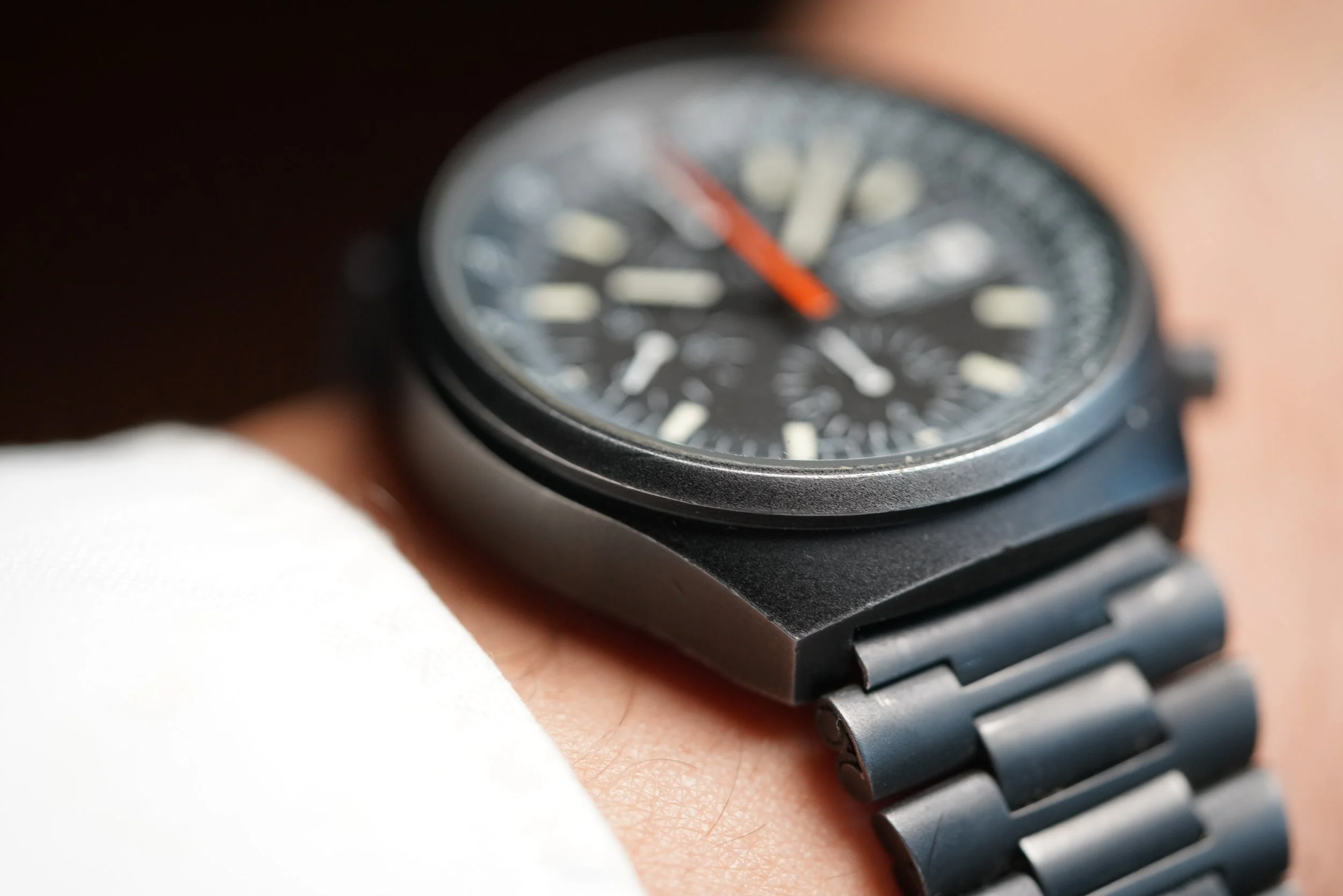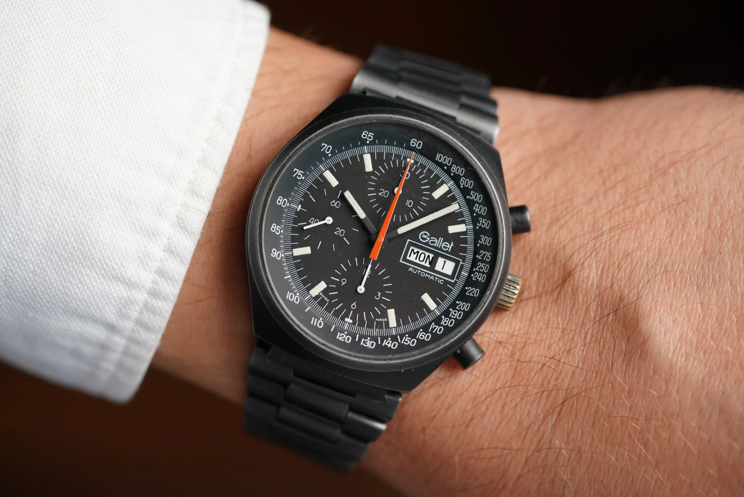 This black PVD-coated Gallet chronograph measures 40mm in diameter and approximately 42.5mm lug-to-lug. The chronograph includes a day and date calendar and is powered by the Valjoux 7750 movement. The inner bezel features a tachymeter scale, and the watch has a contrasting red chronograph hand.