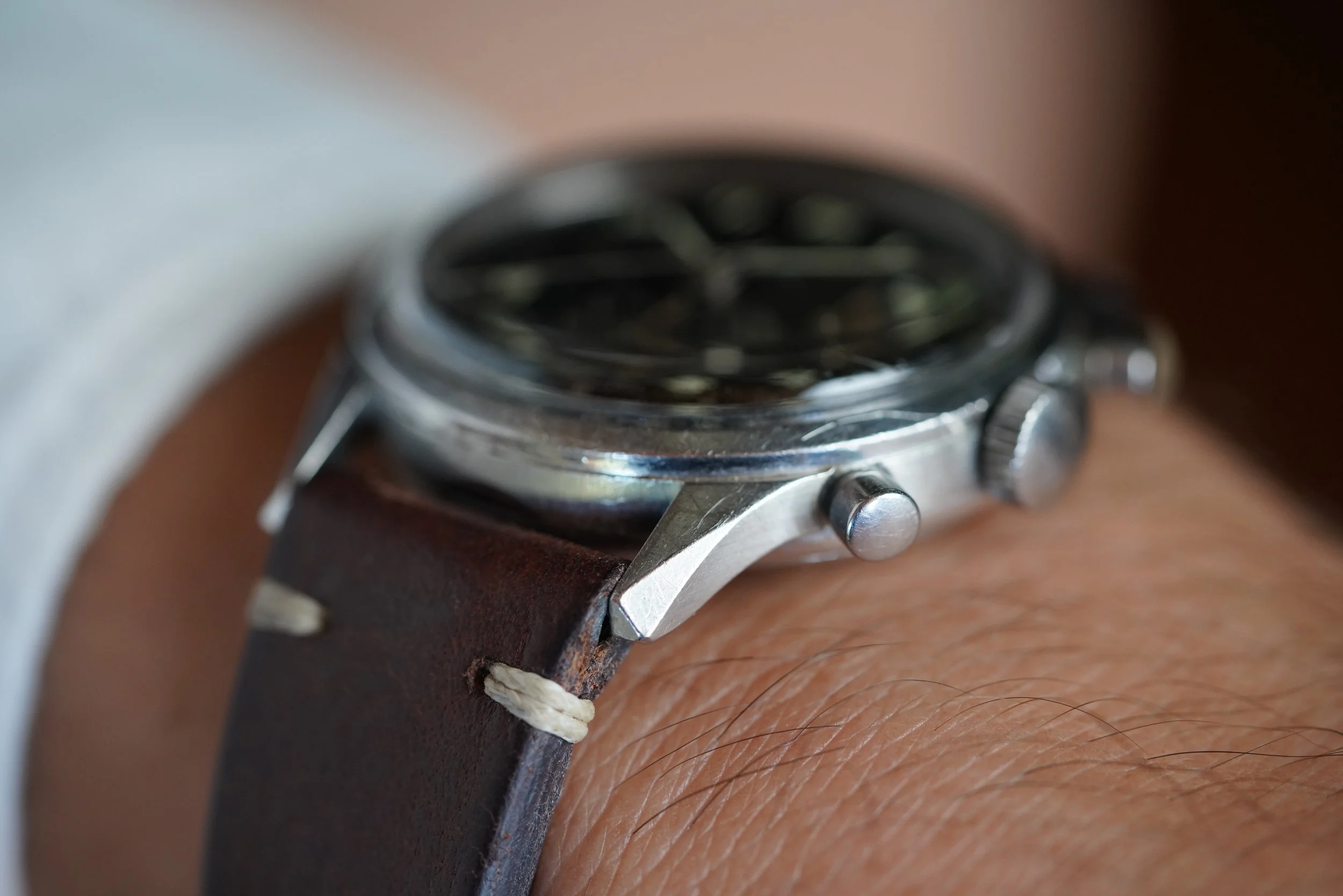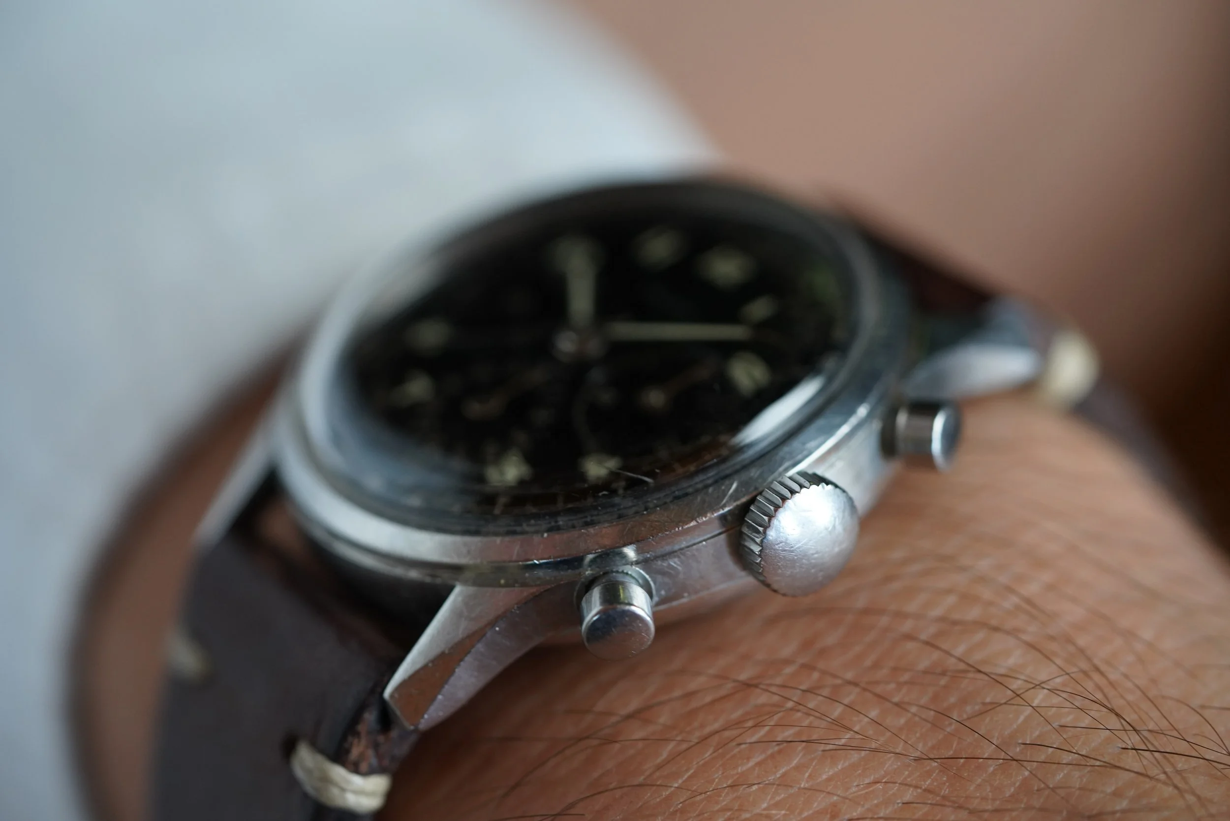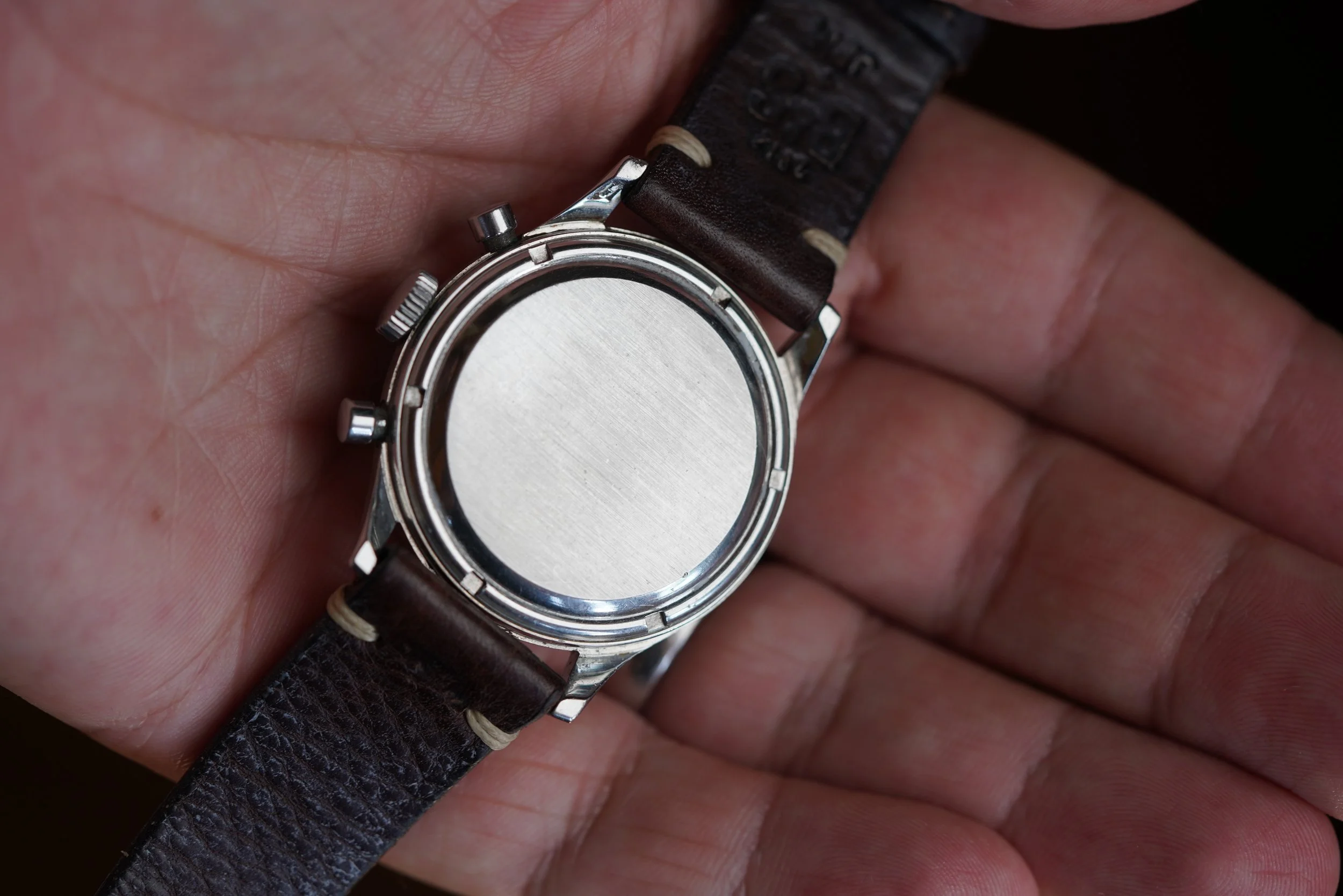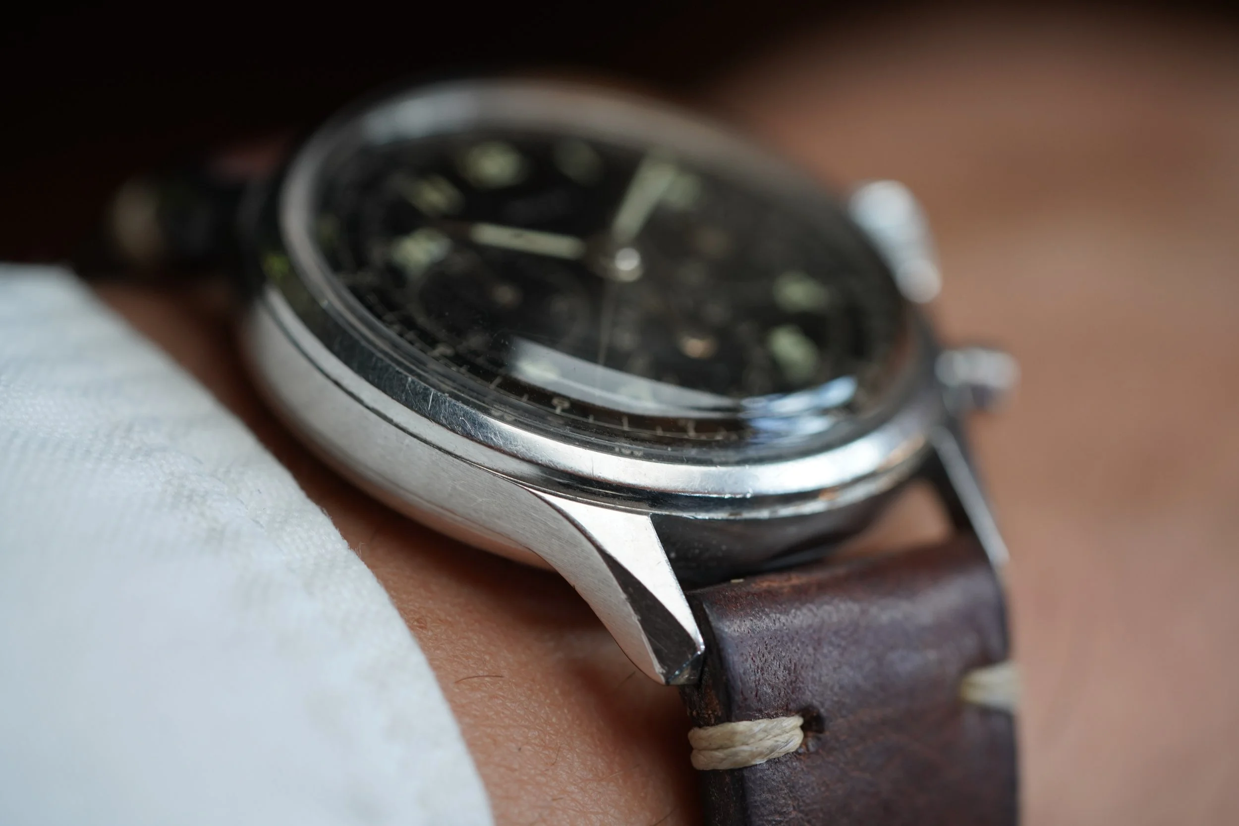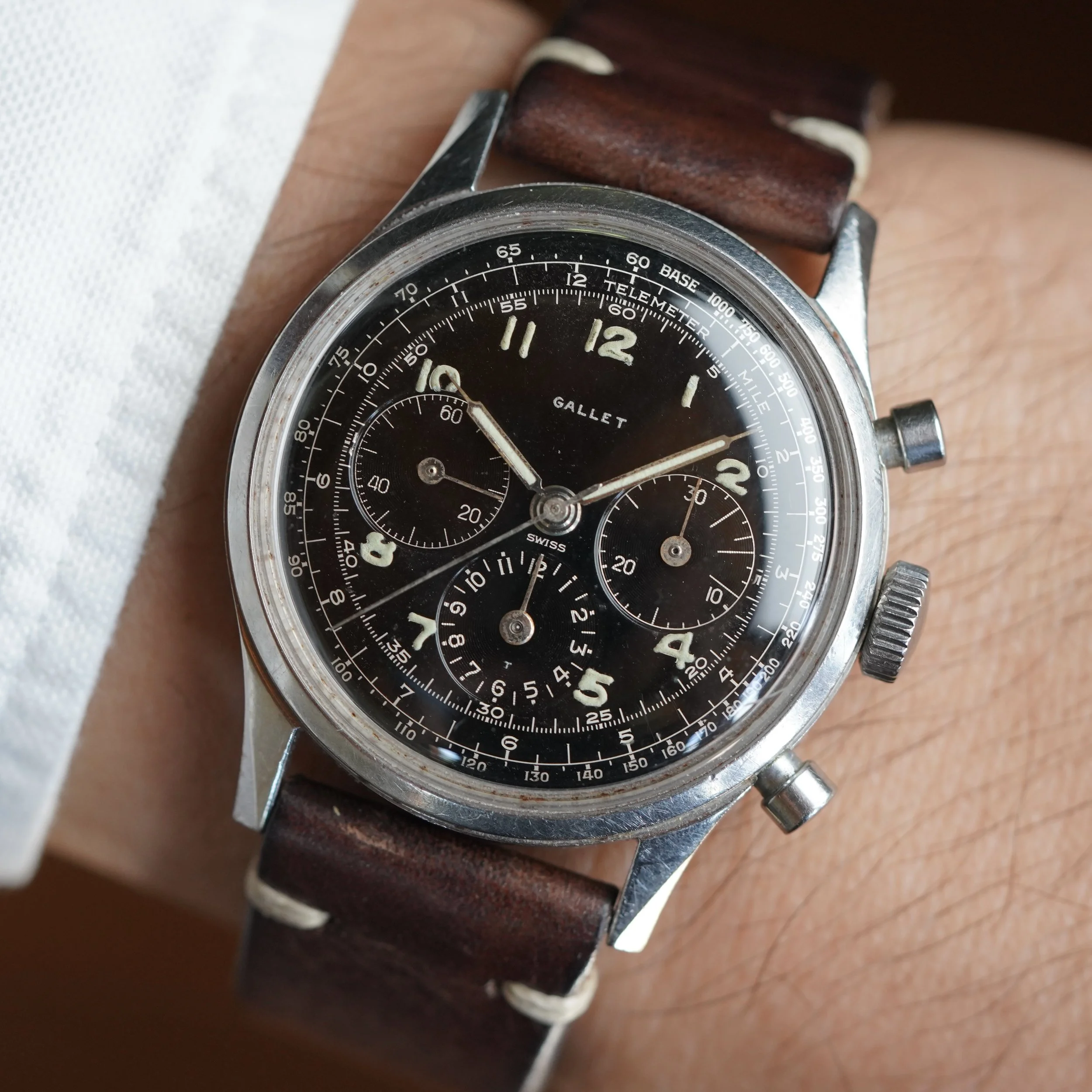 This Gallet chronograph in stainless steel is a stunning stainless steel sports chronograph. It features a black dial with tritium luminous material, and a printed tachymeter and telemeter scale. The stainless steel case measures 38mm in diameter and approximately 44m lug-to-lug. The watch earns its nickname after being worn by the Formula 1 legend Jim Clark. It is powered by the Excelsior Park 40.
