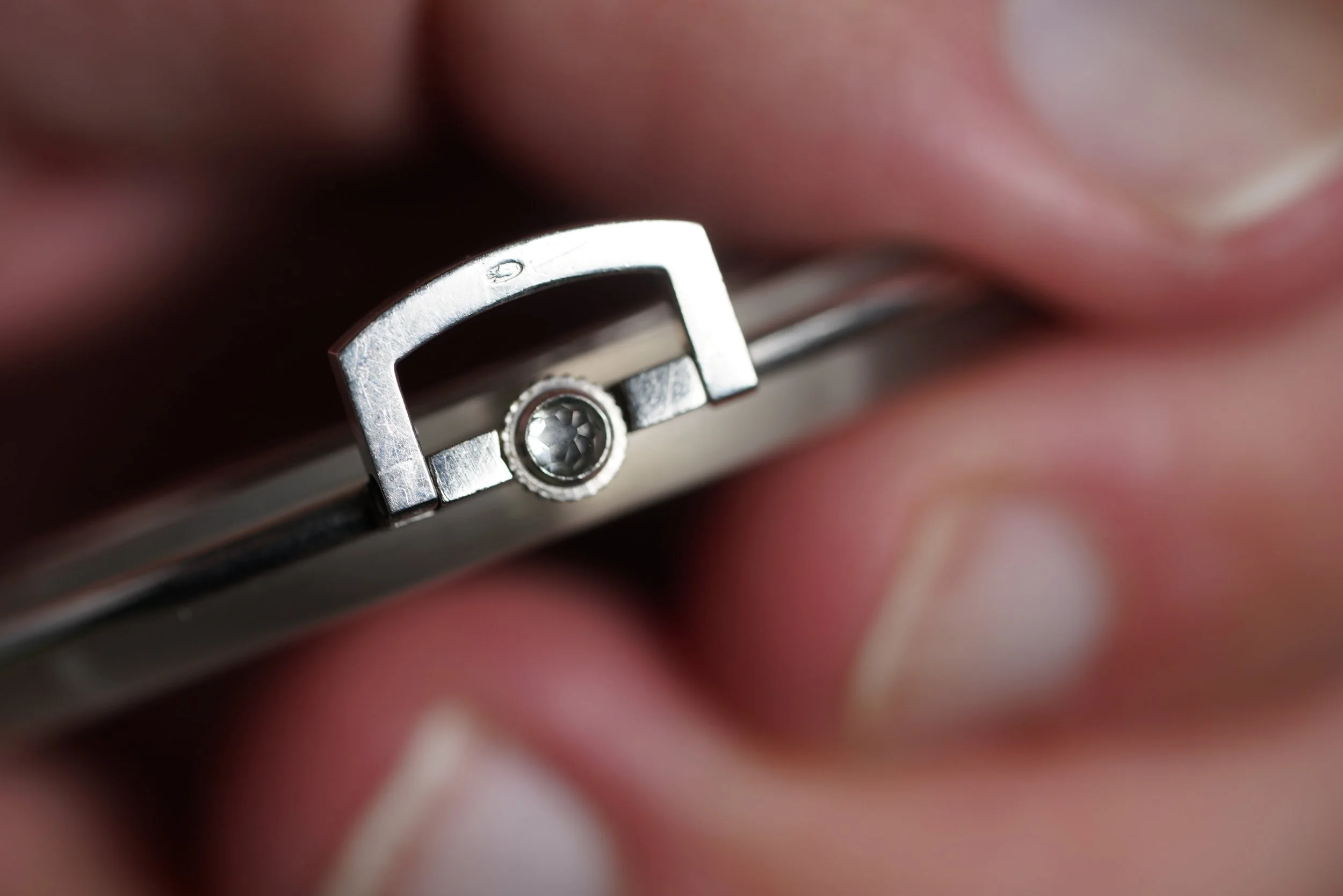 This is a very special timepiece sold at Gübelin. The case is made from platinum and rock crystal and showcases a beautiful skeletonized movement. We believe the watch and movement was possibly produced by Vacheron & Constantin. The outer rock crystal perimeter features platinum applied hour markers. The platinum bow is very fine and the crown features a beautiful diamond. We believe the production dates to the 1950s based on serial number 71110. The movement has a Geneva seal and is one of the most spectacular skeletonized movements we have seen, clearly exhibiting craftsmanship and workmanship of the highest skill. The flared, sword-like blued hands are also spectacular. The