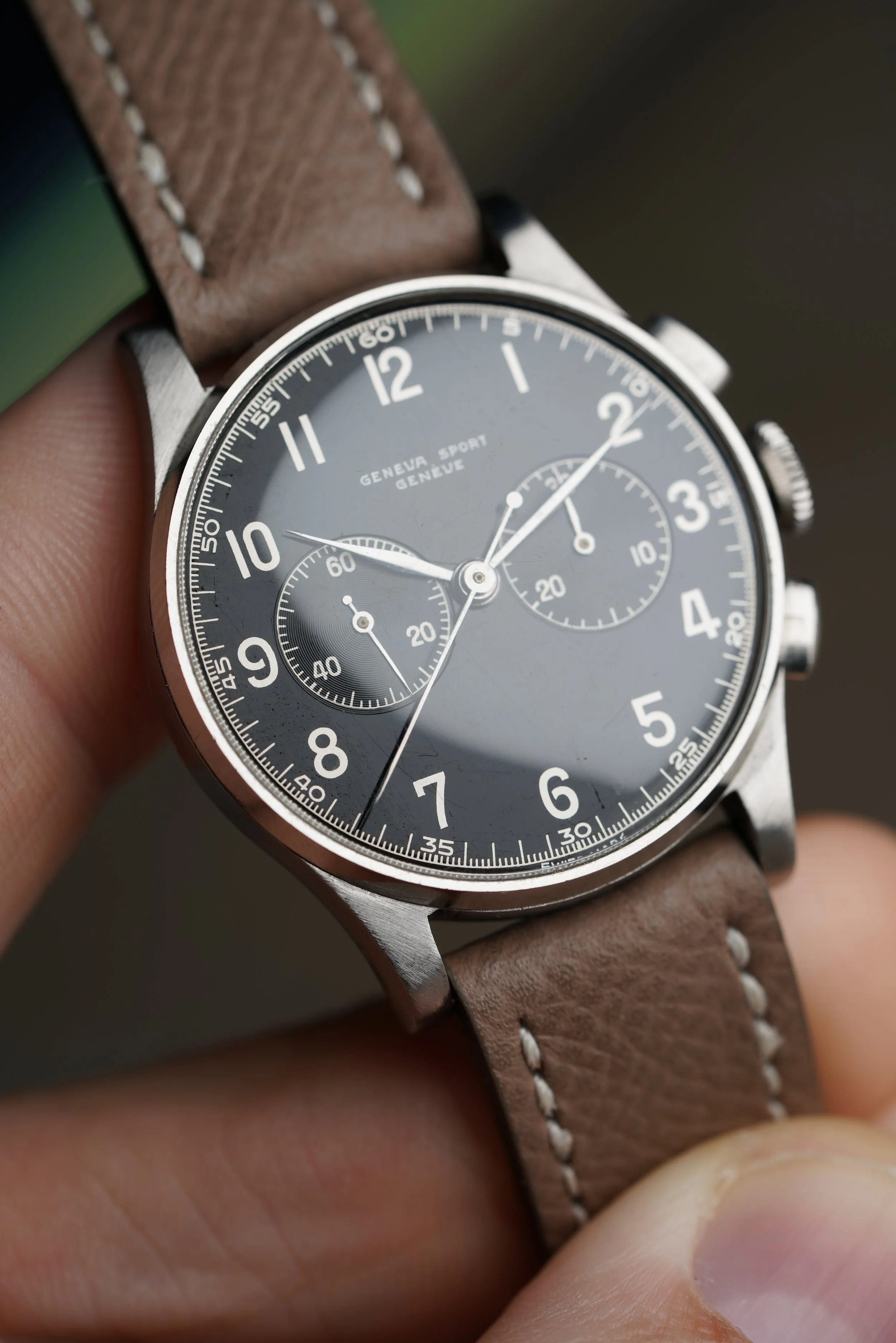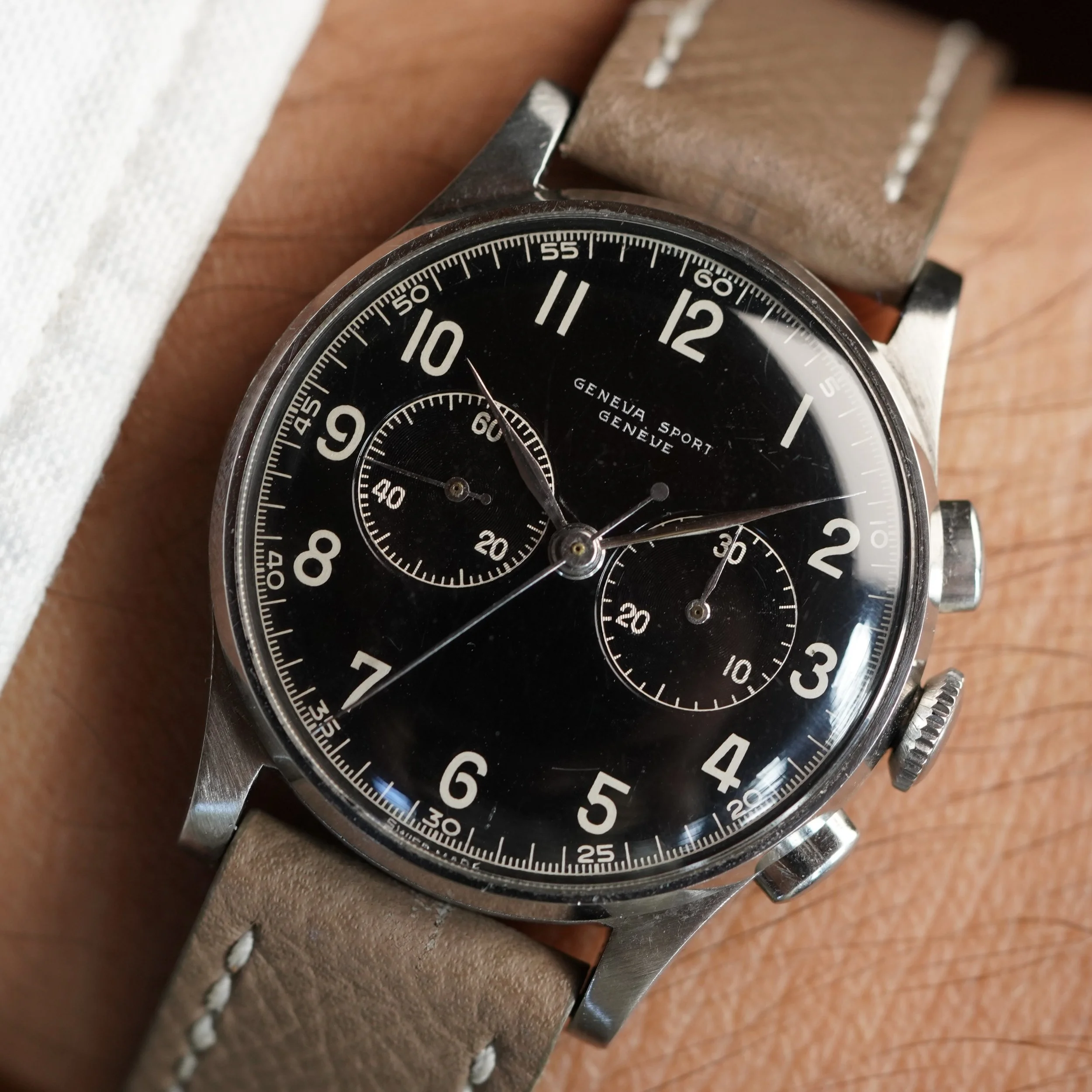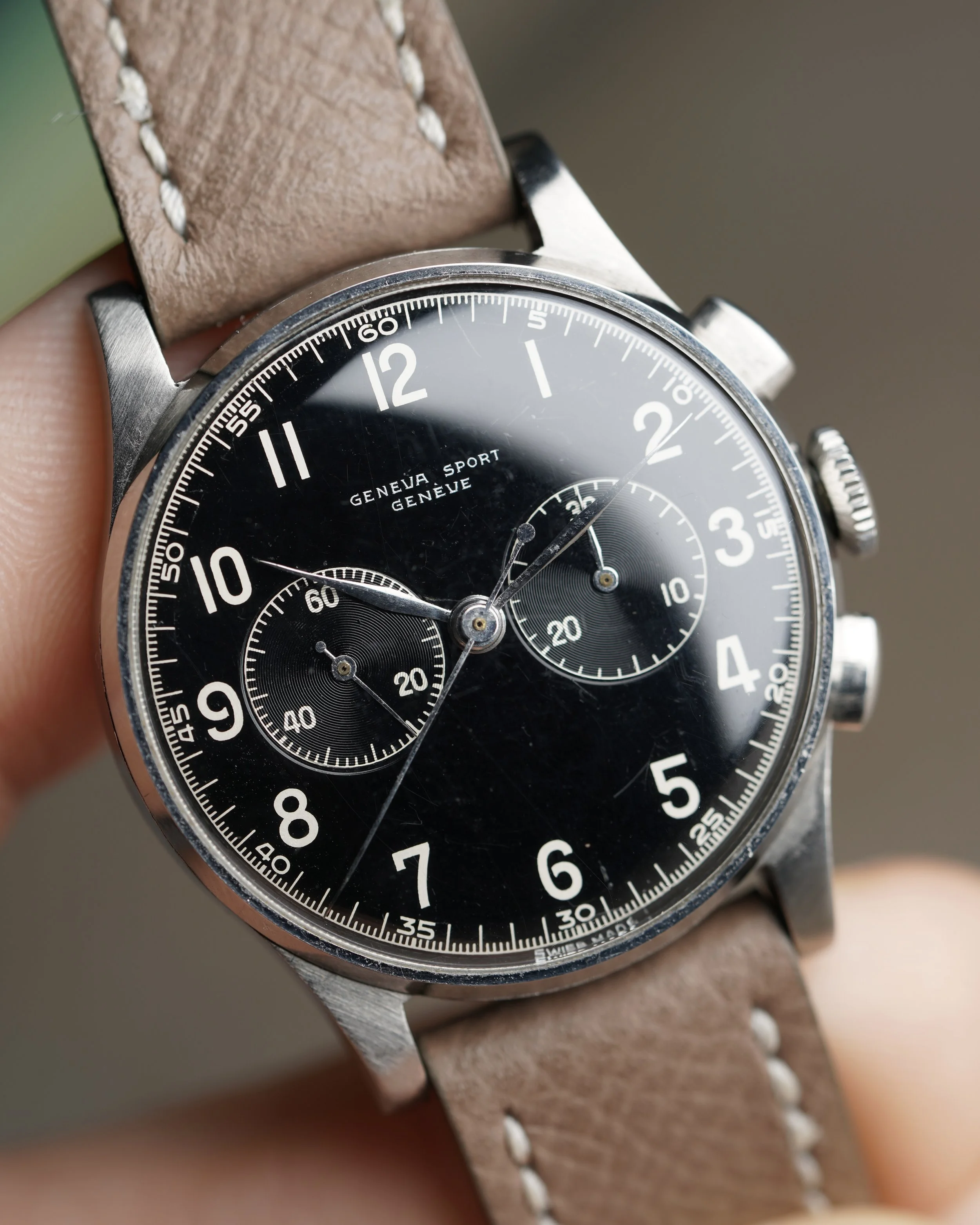 This Geneva Sport chronograph is a fantastic timepiece. The gilt dial is very attractive. It dates to the 1940s. The watch is very small and cute. We believe it is powered by the GSW 23.7 calibre.