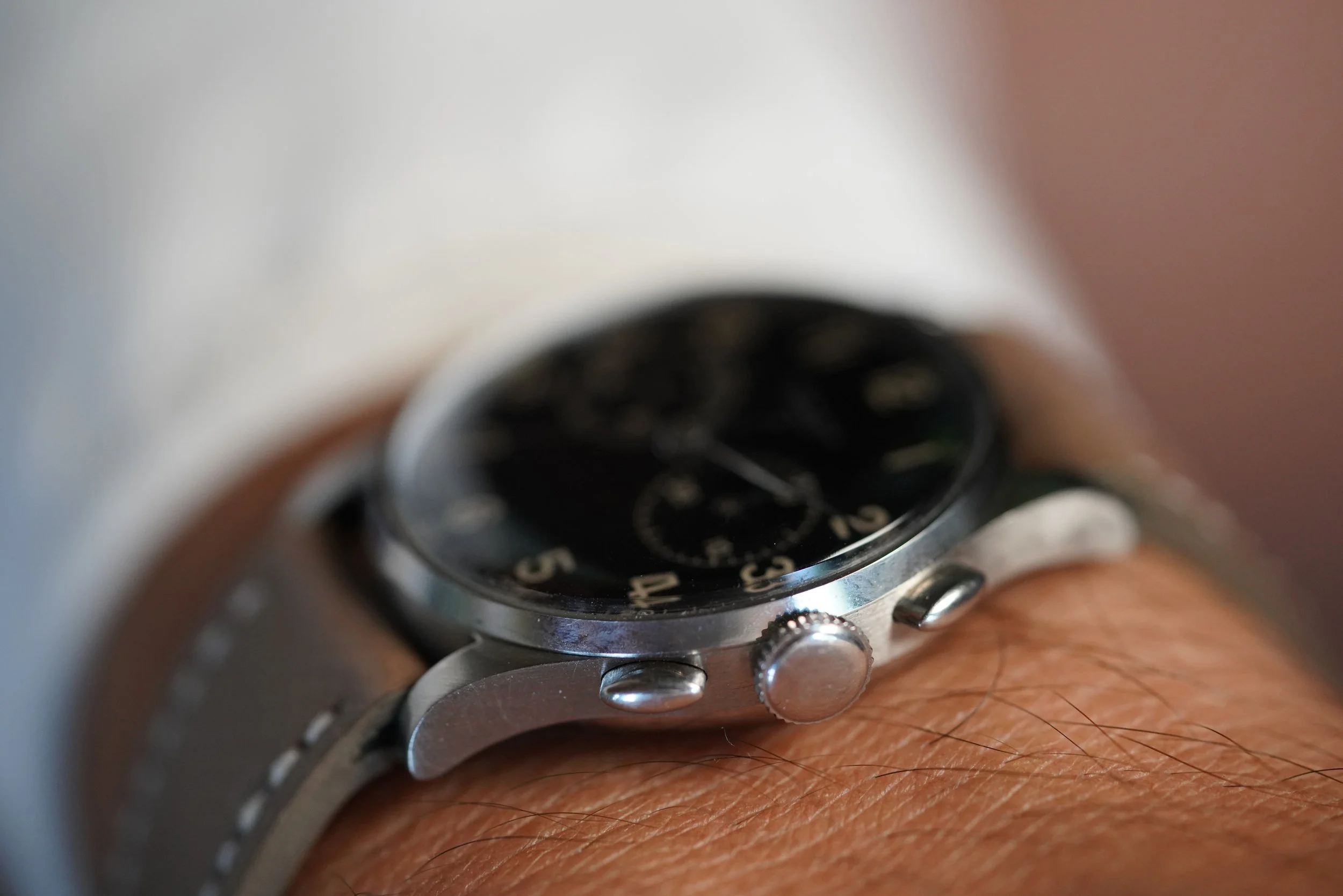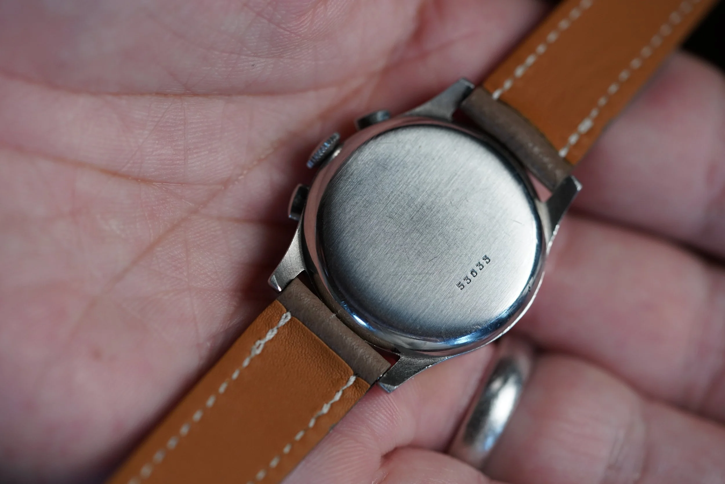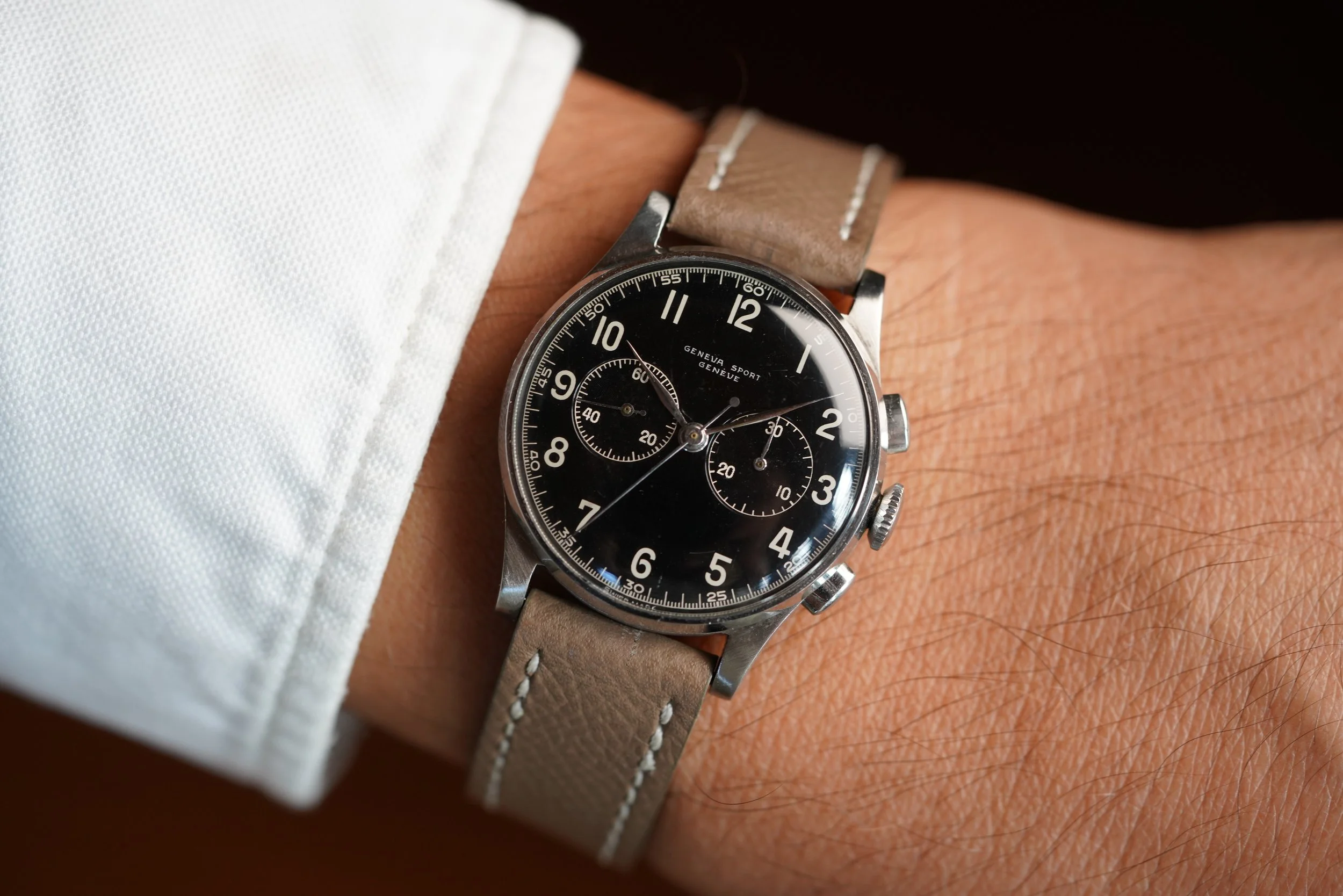 This Geneva Sport chronograph is a fantastic timepiece. The gilt dial is very attractive. It dates to the 1940s. The watch is very small and cute. We believe it is powered by the GSW 23.7 calibre.